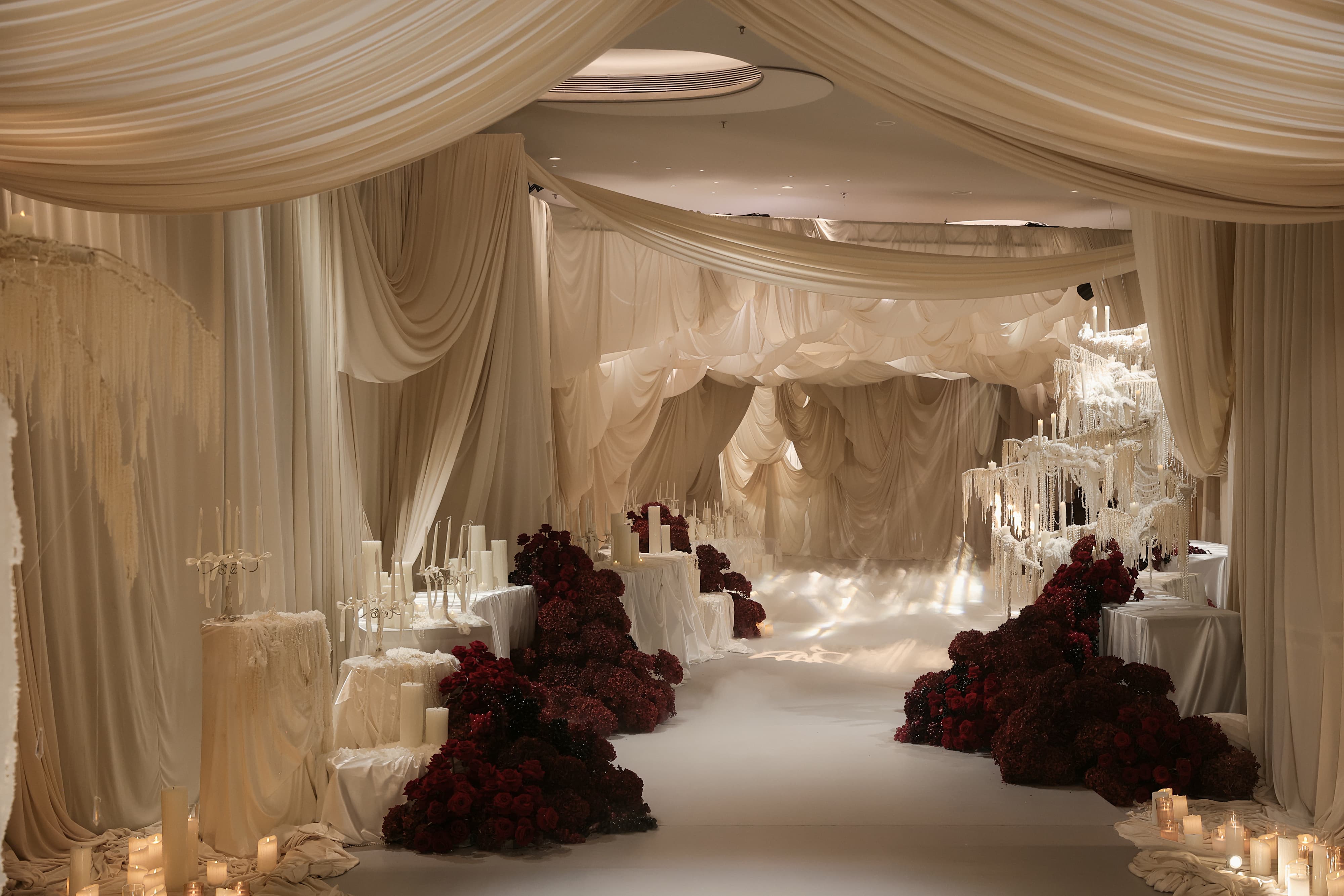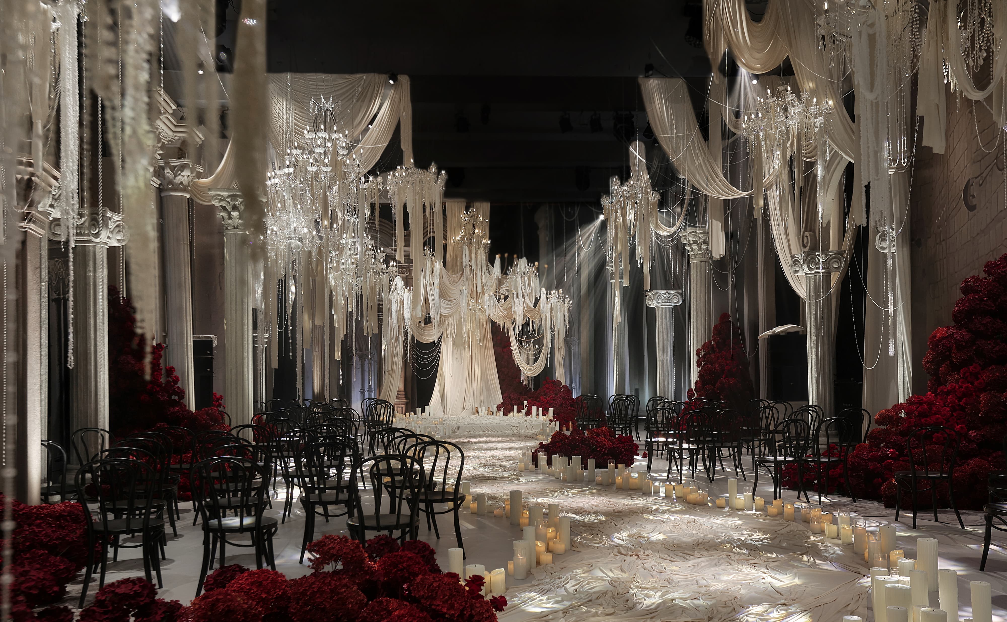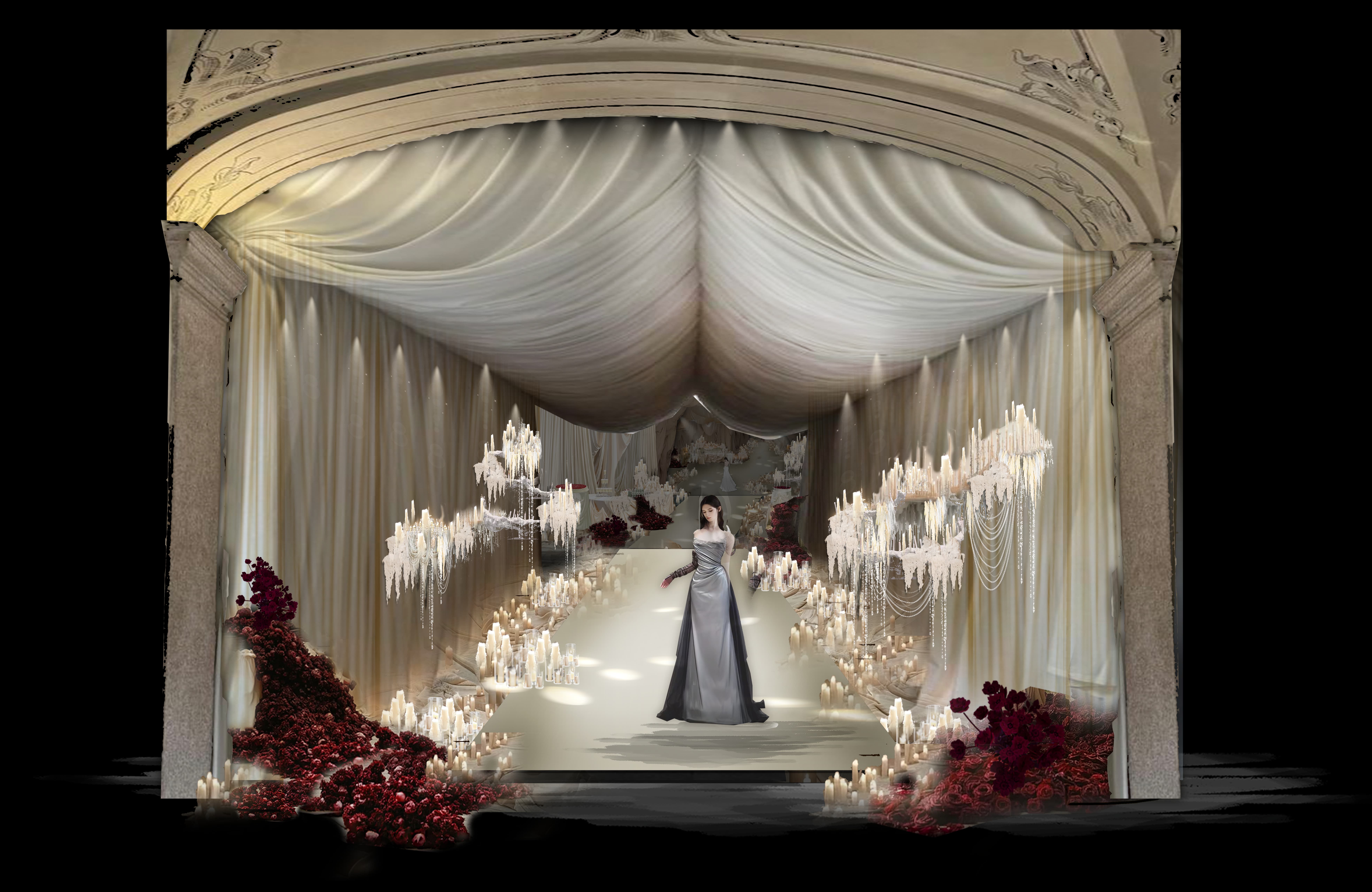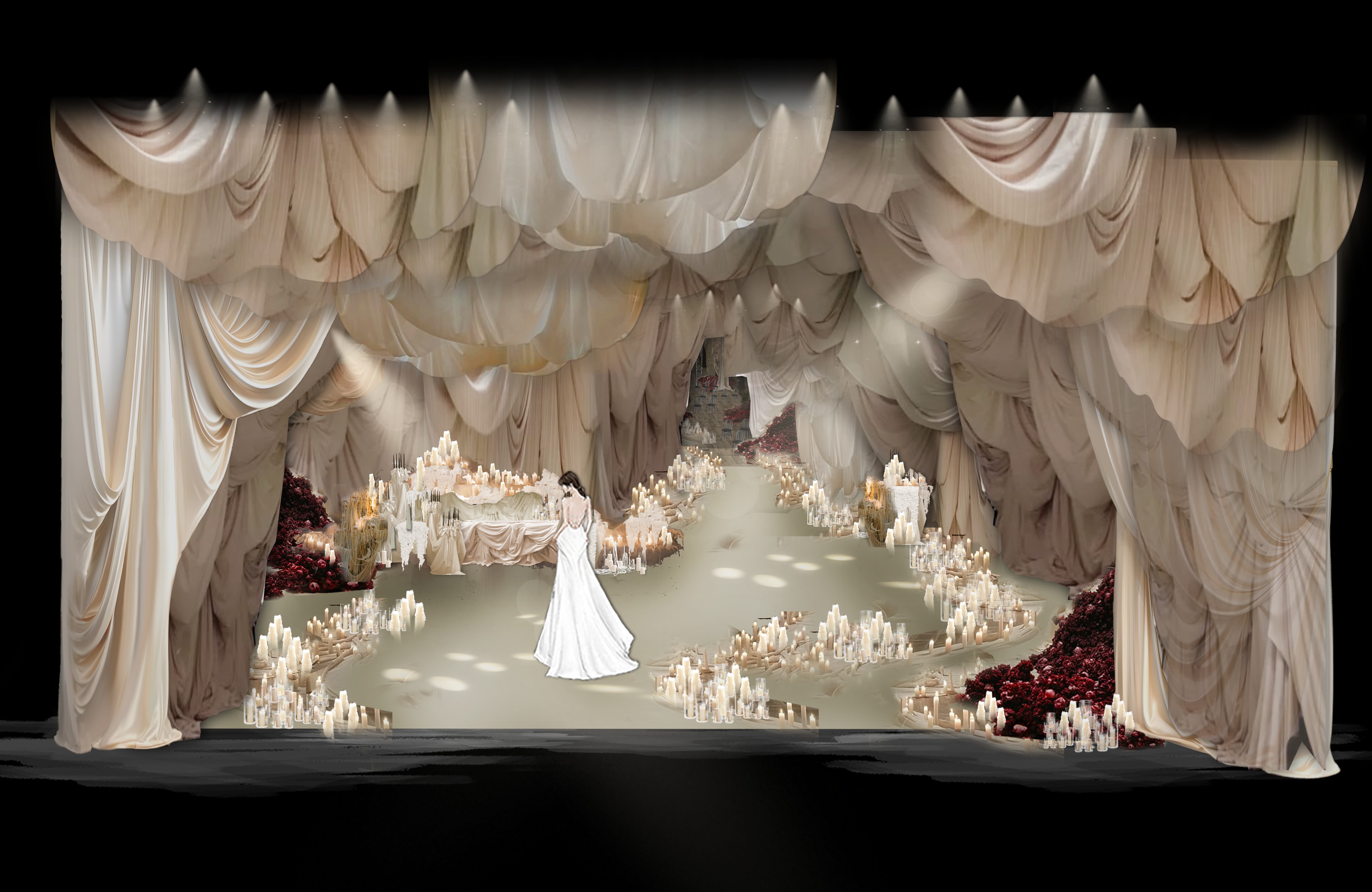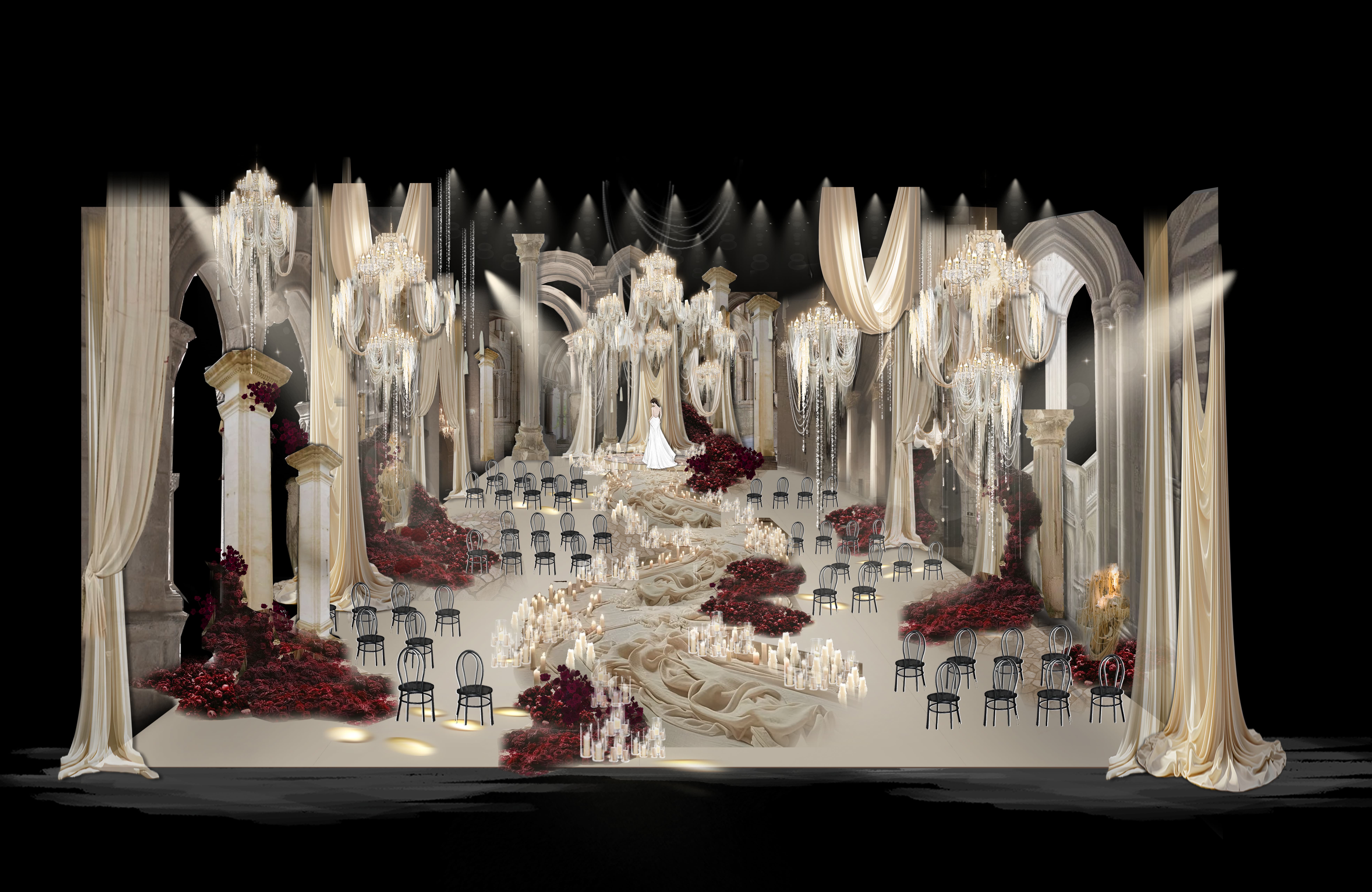 This wedding design features a groundbreaking approach, uniquely blending European and contemporary styles. By fully leveraging the venue's spatial potential and incorporating grand-scale elements, it creates a distinctive and remarkable banquet experience.