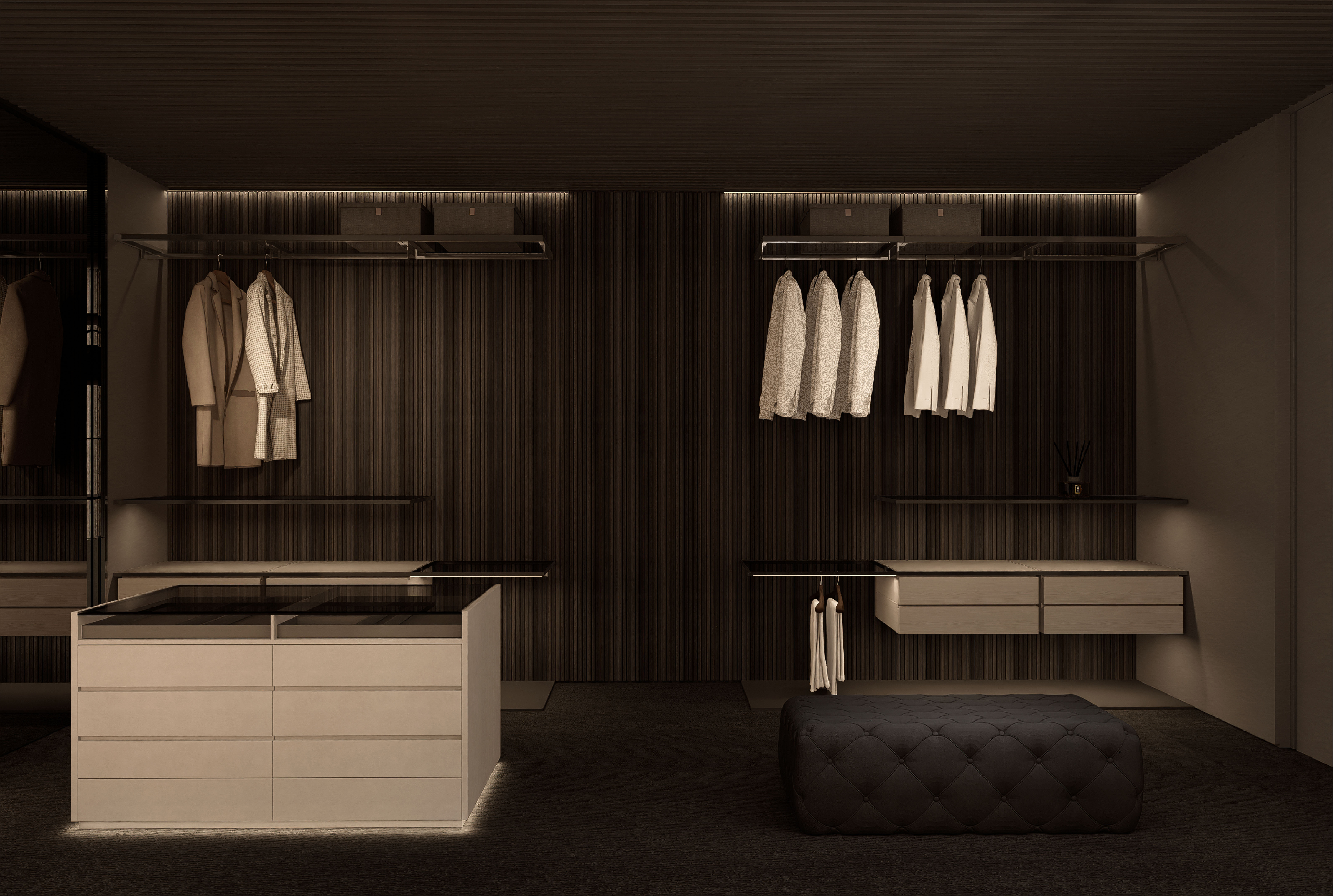 Material selection balances warmth and clarity—micro-cement, stone, timber, and glass compose a tactile harmony that feels serene yet sensuous. Natural light becomes a dynamic sculptor, shifting through the day to reveal the rhythm of time, while concealed lighting softly traces the geometry of the space.