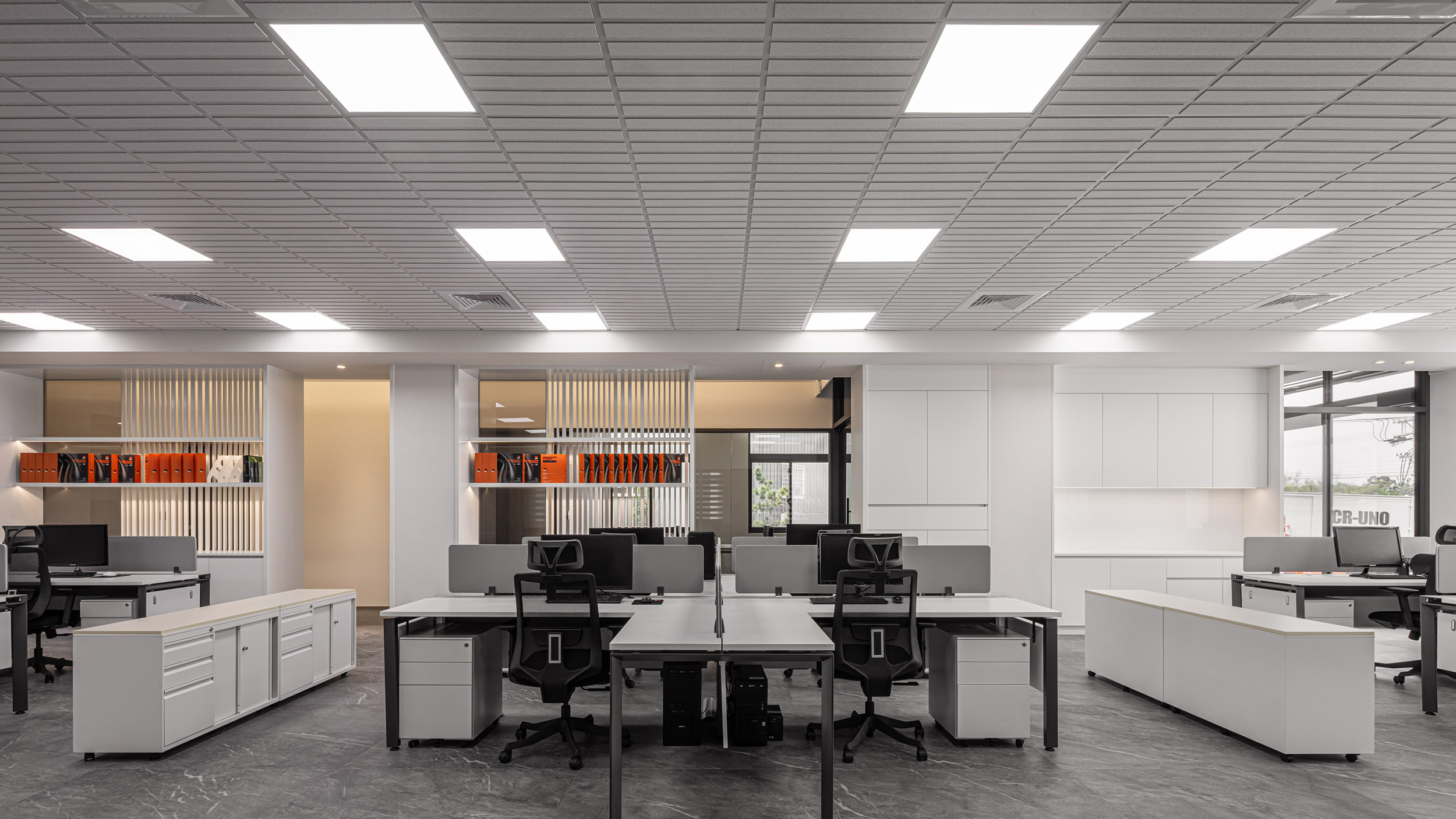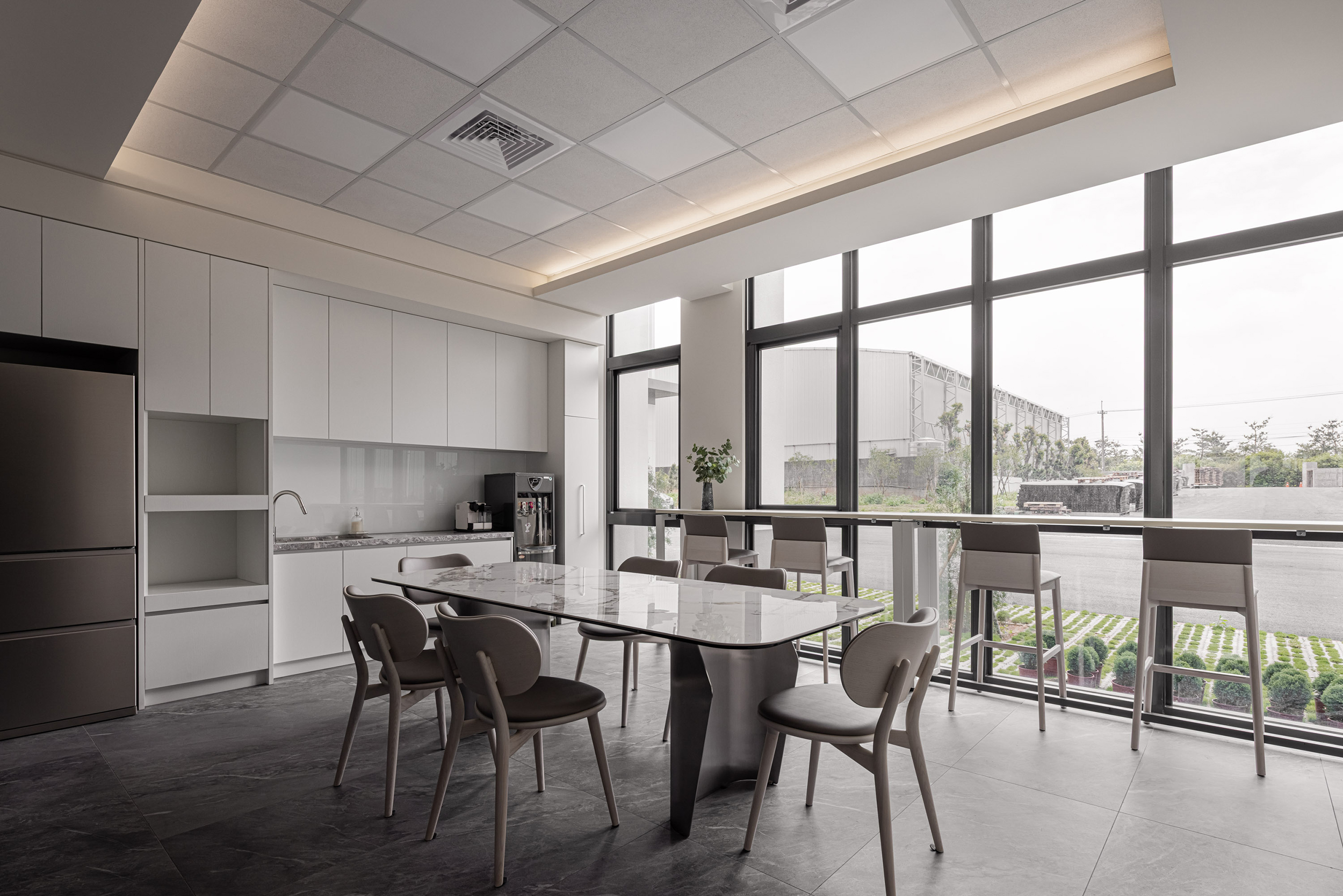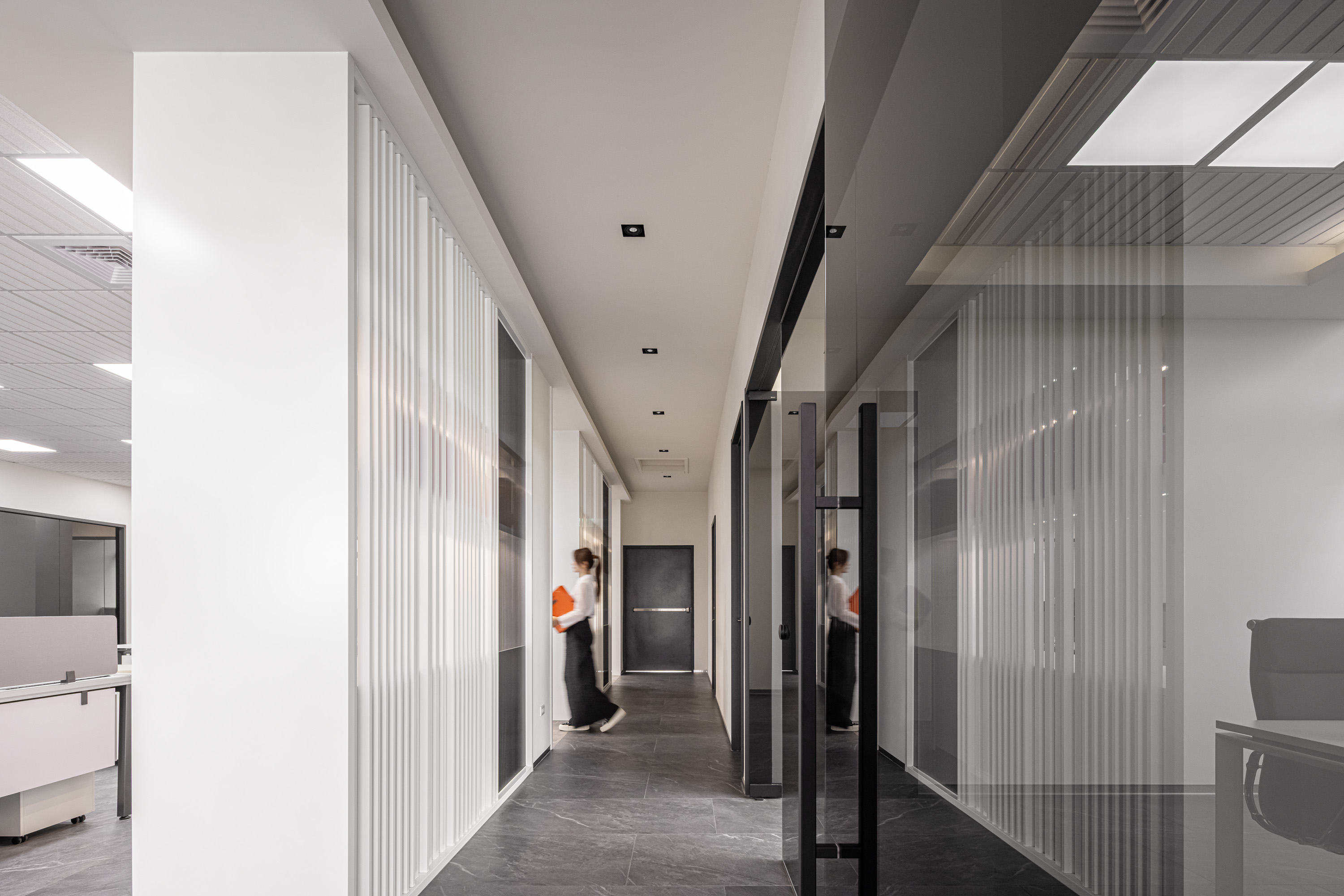 Following the axis of natural light, the design connects reception, work, and meeting areas, allowing light to lead movement and interaction. The spatial rhythm is defined by the building’s column grid, while interwoven materials—iron, glass, and grilles—create partitions that are both distinct and connected.