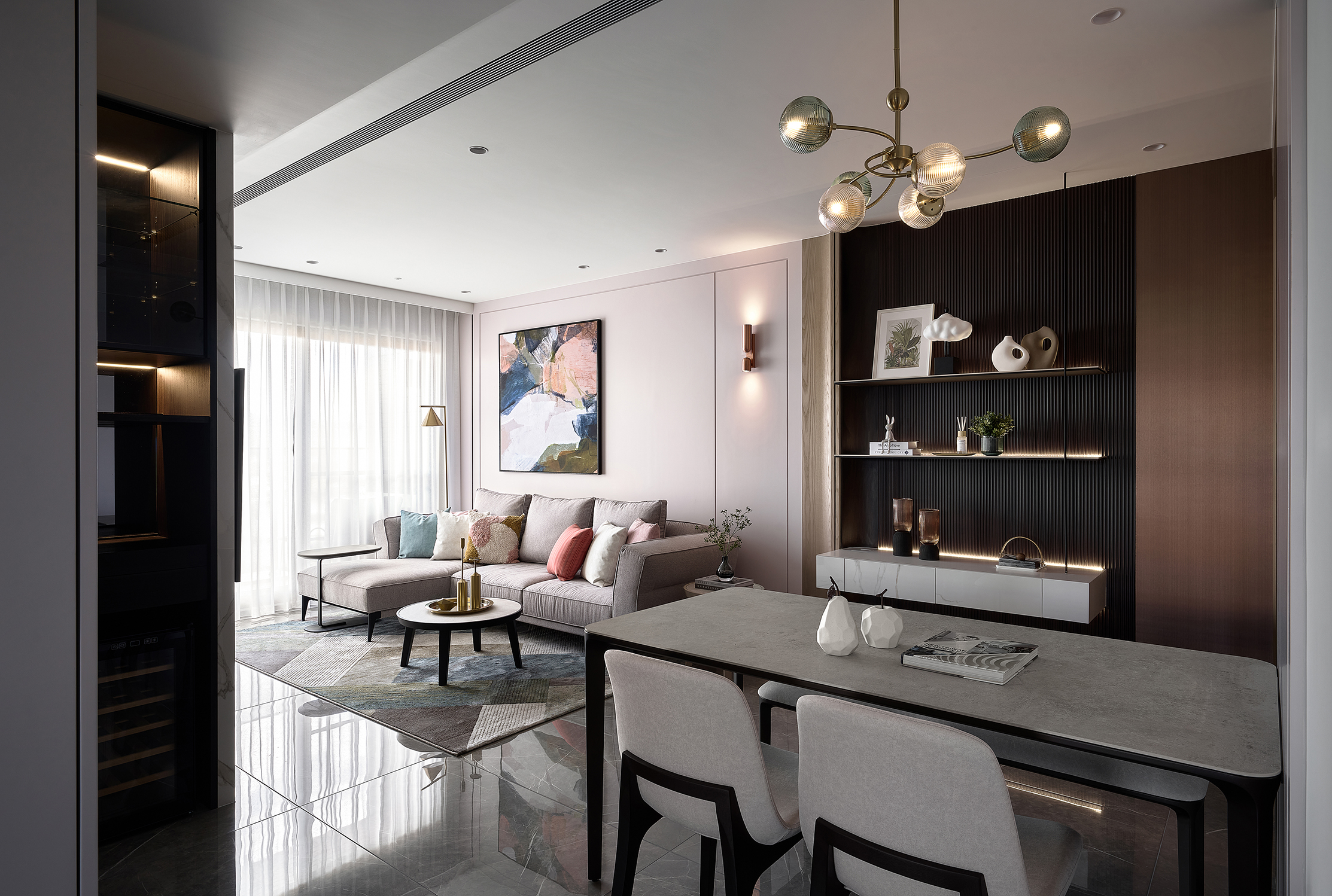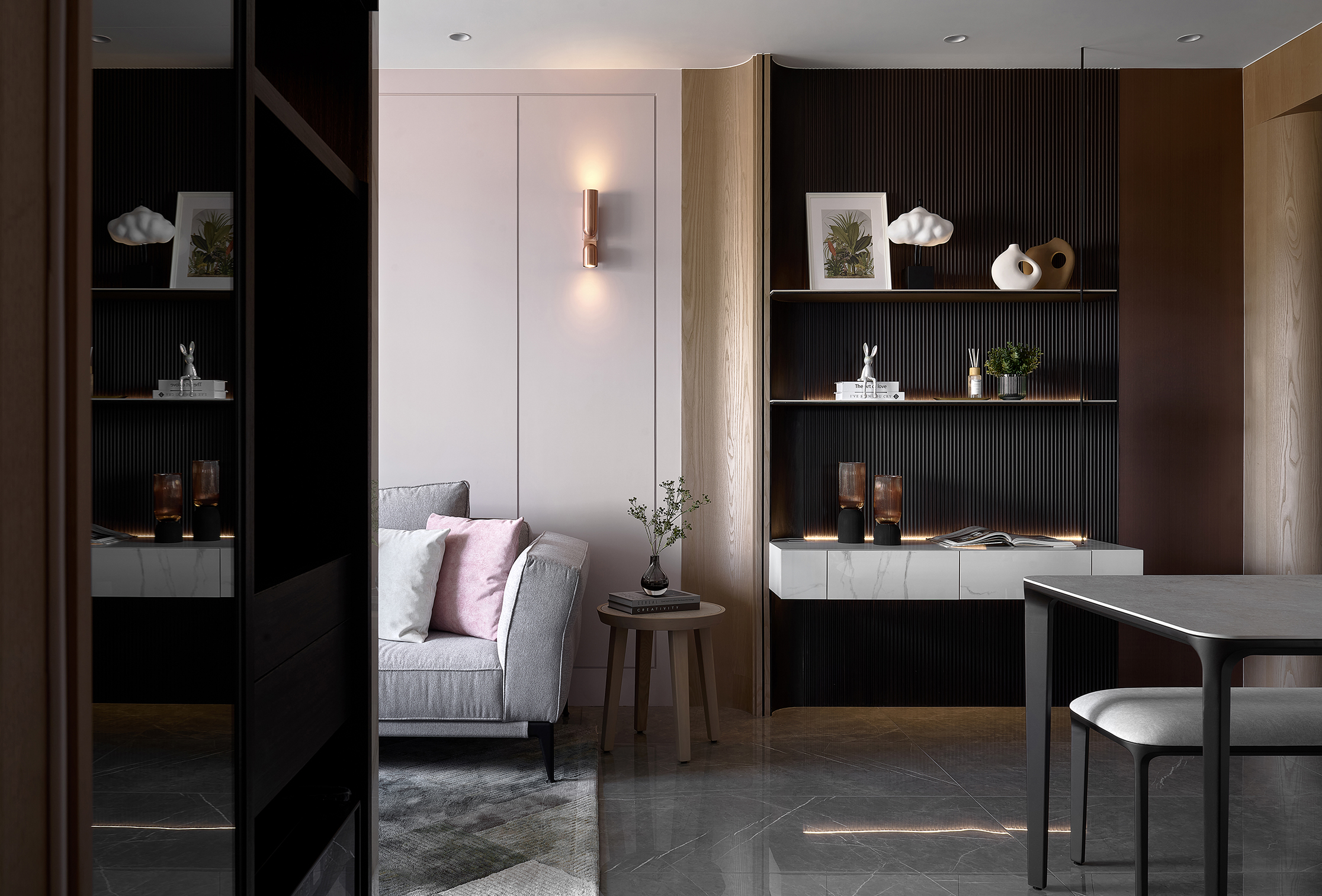 Striking a balance between “understated luxury” and “graceful simplicity”, the design eliminates excessive ornamentation, merging modern minimalism with classical aesthetics to shape a façade of quiet order and refinement. The primary tone—a muted blush with gray undertones—softens the sweetness often associated with pink, instead evoking a sense of calm sophistication. Paired with dark wood veneer and matte black metal, the palette forms a warm yet tactile contrast. Matte finishes subdue reflection, allowing light to diffuse softly throughout the space, weaving a contemporary atmosphere that is modest yet rich in layered detail and subtle allure.