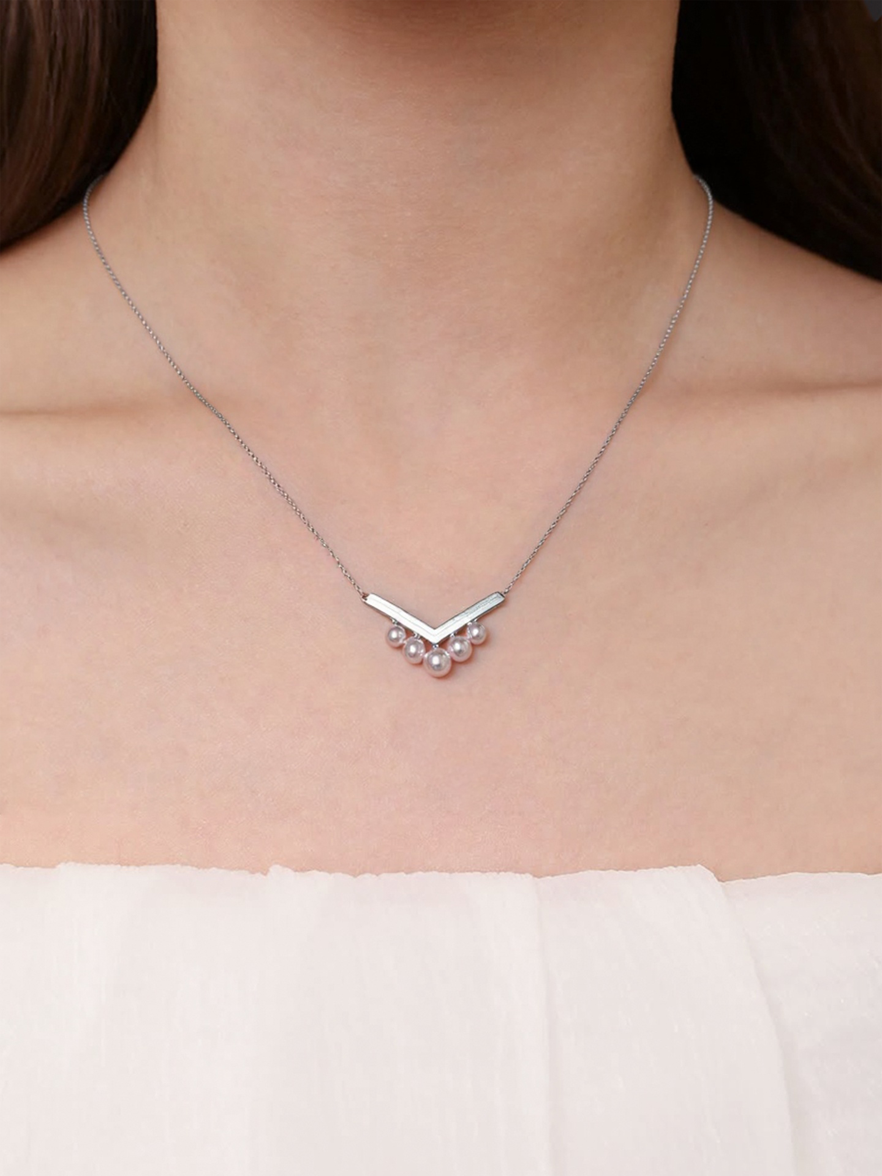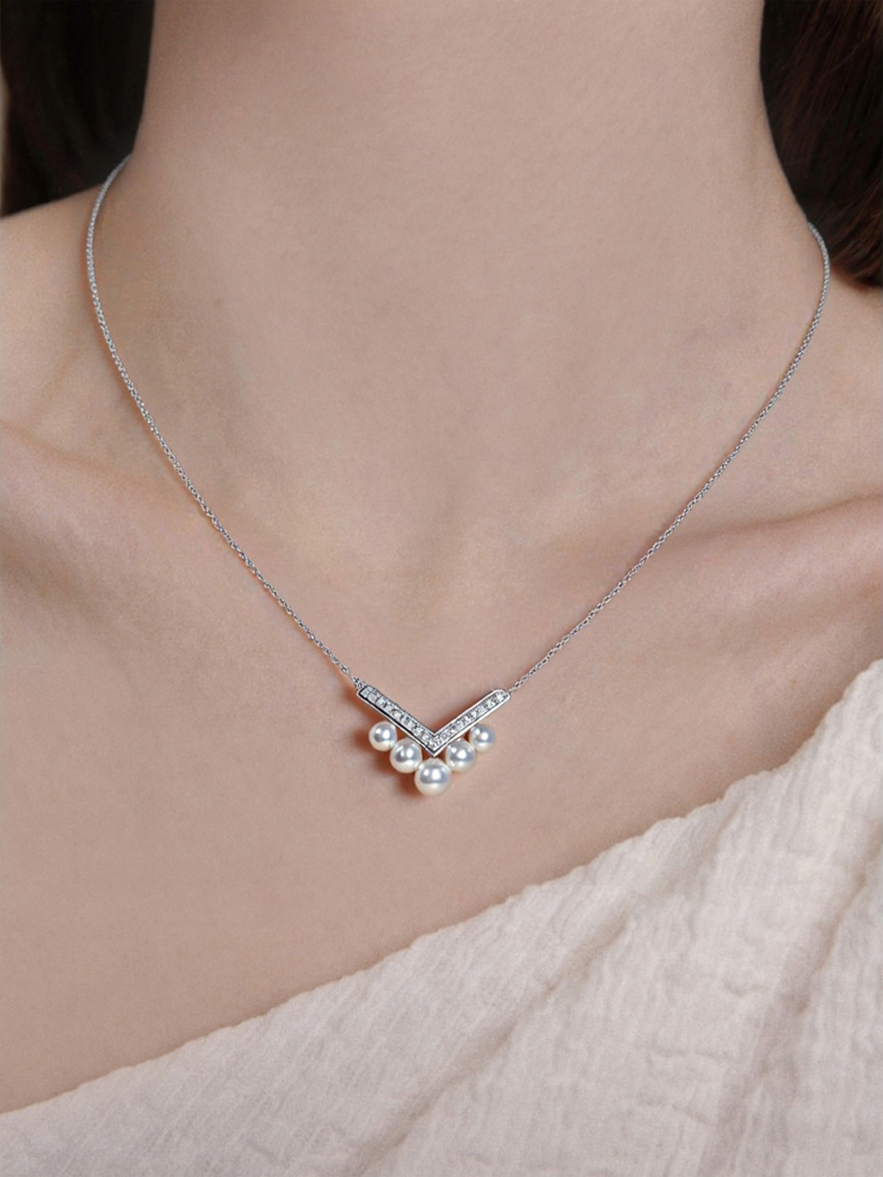 Drawing inspiration from European royal crowns, the designer has employed a deconstructive approach to strip away excessive frills, taking the iconic V-shaped frame as the core. The structure with clean lines preserves the crown’s solemnness, while also catering to modern aesthetic taste through minimalist geometric expression. Lustrous natural Akoya pearls are meticulously arranged like crown jewels, creating a striking contrast between rounded contours and sharp lines. Dazzling pavé diamonds set along the metal frame are reminiscent of the Milky Way, resulting in a rich play of light and shadow to subtly echo the radiant moment of coronation. The necklace masterfully bridges classical symbolism with modern aesthetics.