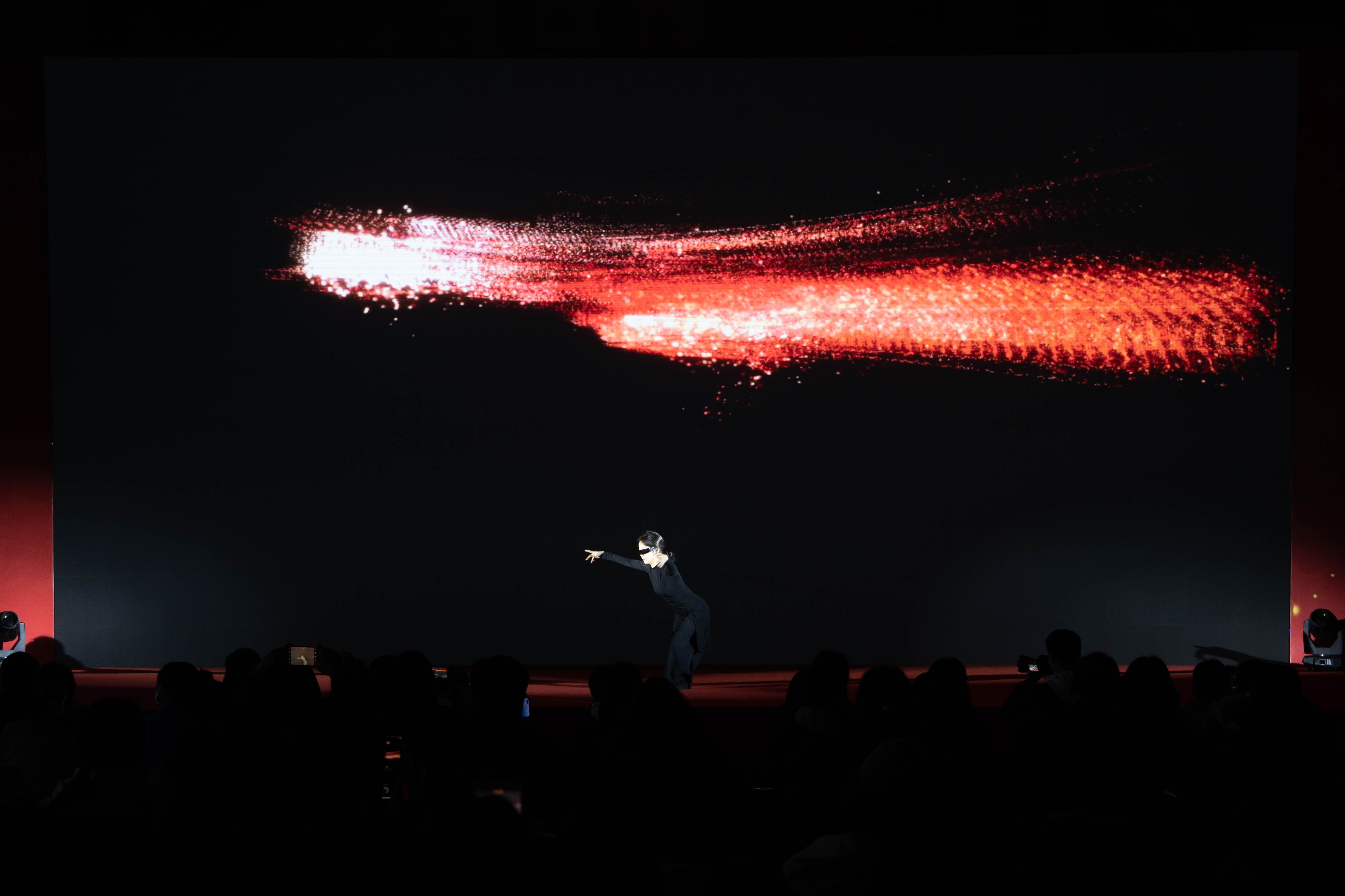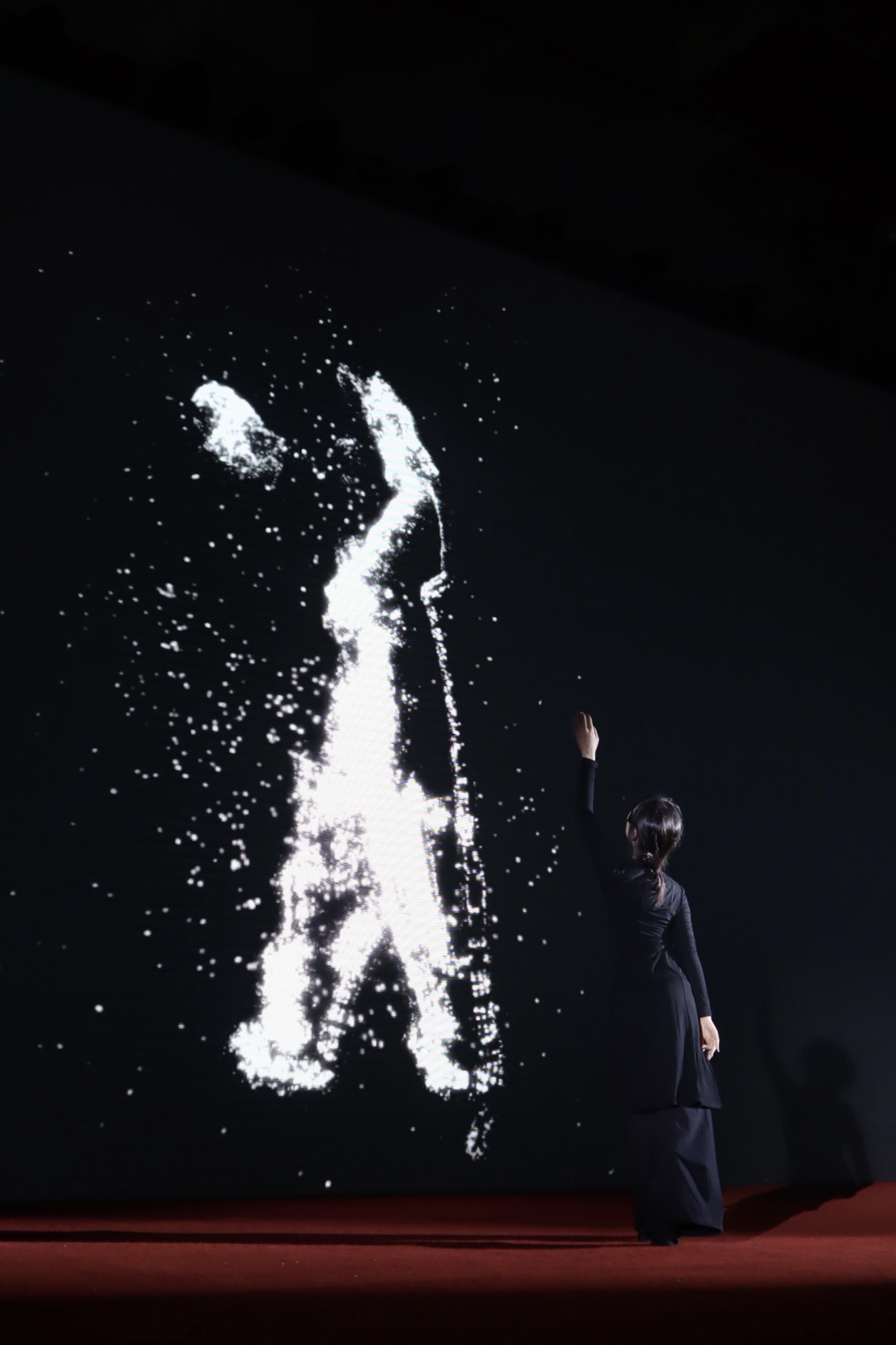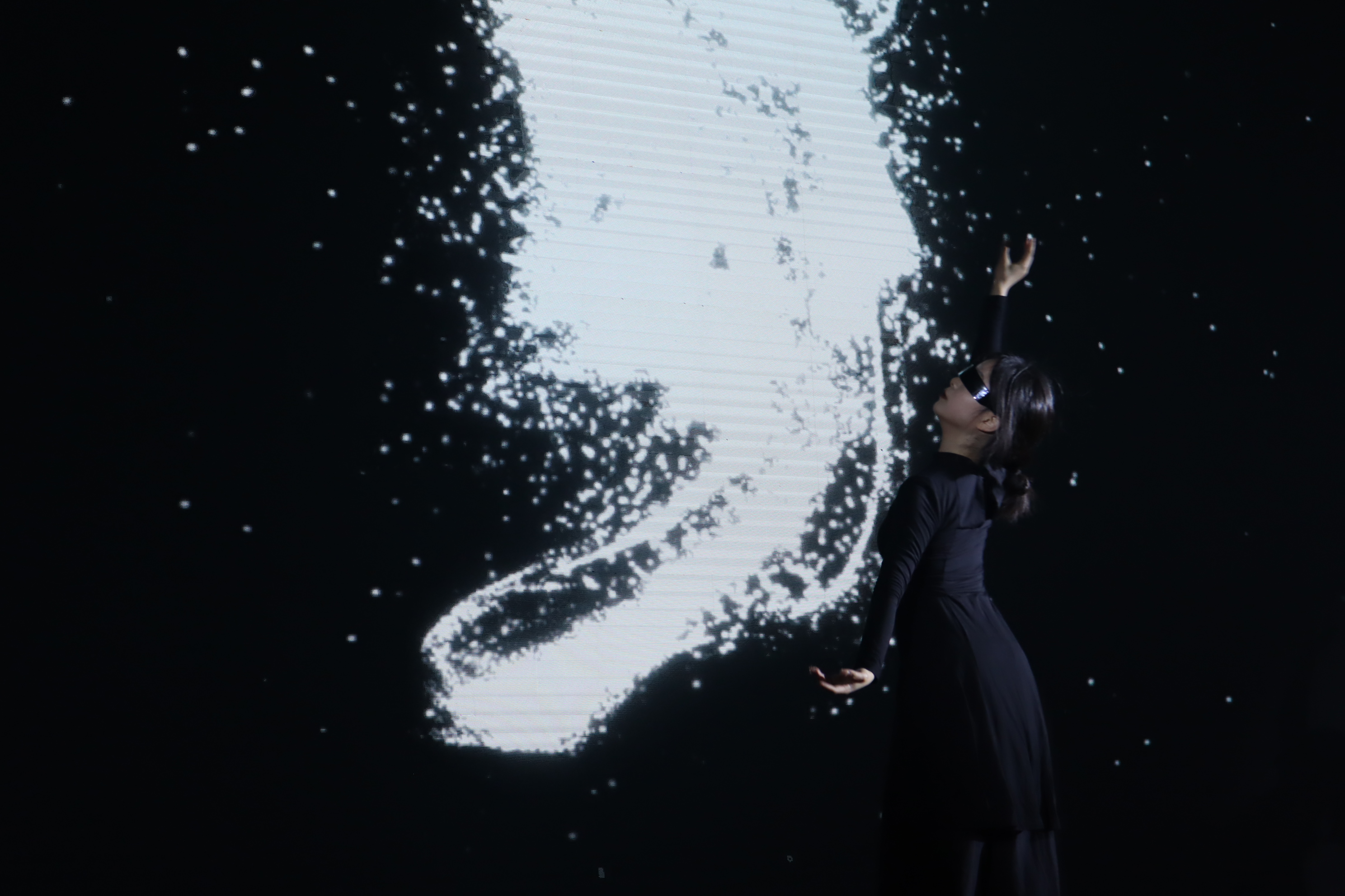 The team's initial vision was to create real-time generative visuals. The goal was to use motion capture technology to enable the visuals to respond instantly to the dancer's movements, achieving a truly "body-driven" experience. However, due to on-site constraints that prevented the deployment of the necessary capture equipment and computing systems, the final performance adopted an alternative approach: the dancer's movements were pre-recorded and then used as data to generate the visuals with AI and procedural algorithms. The flowing white particles seen in the performance are, in fact, a digital avatar generated from this motion data.