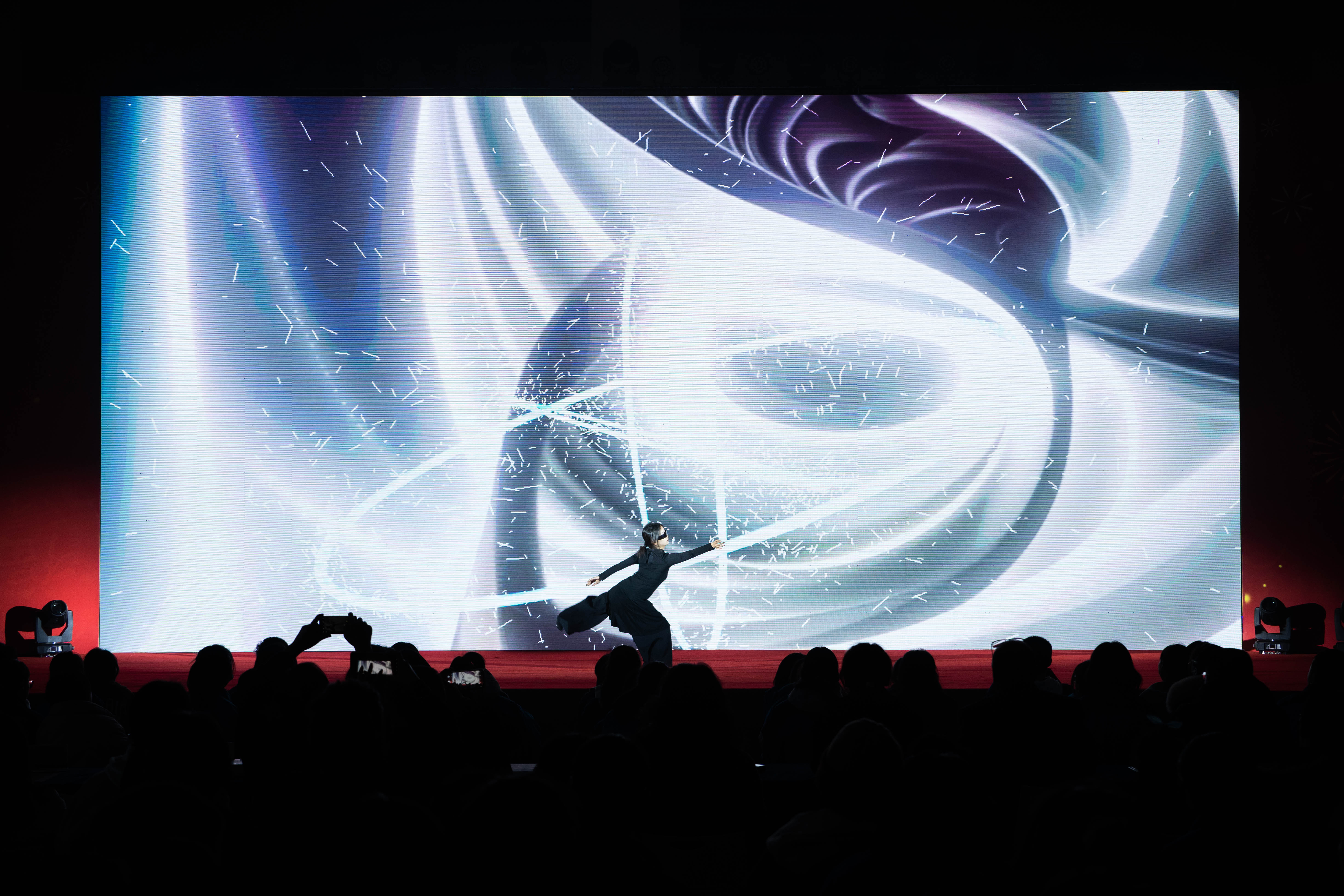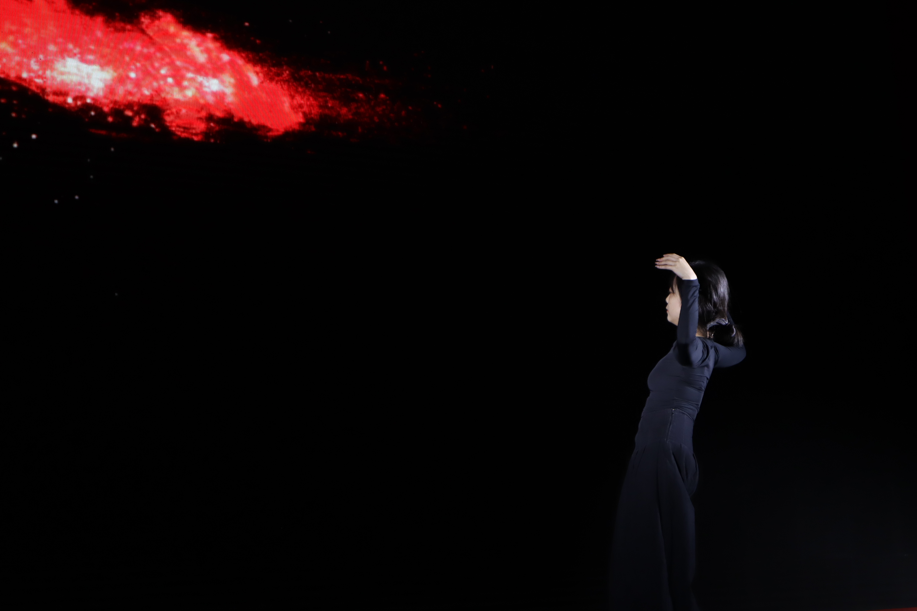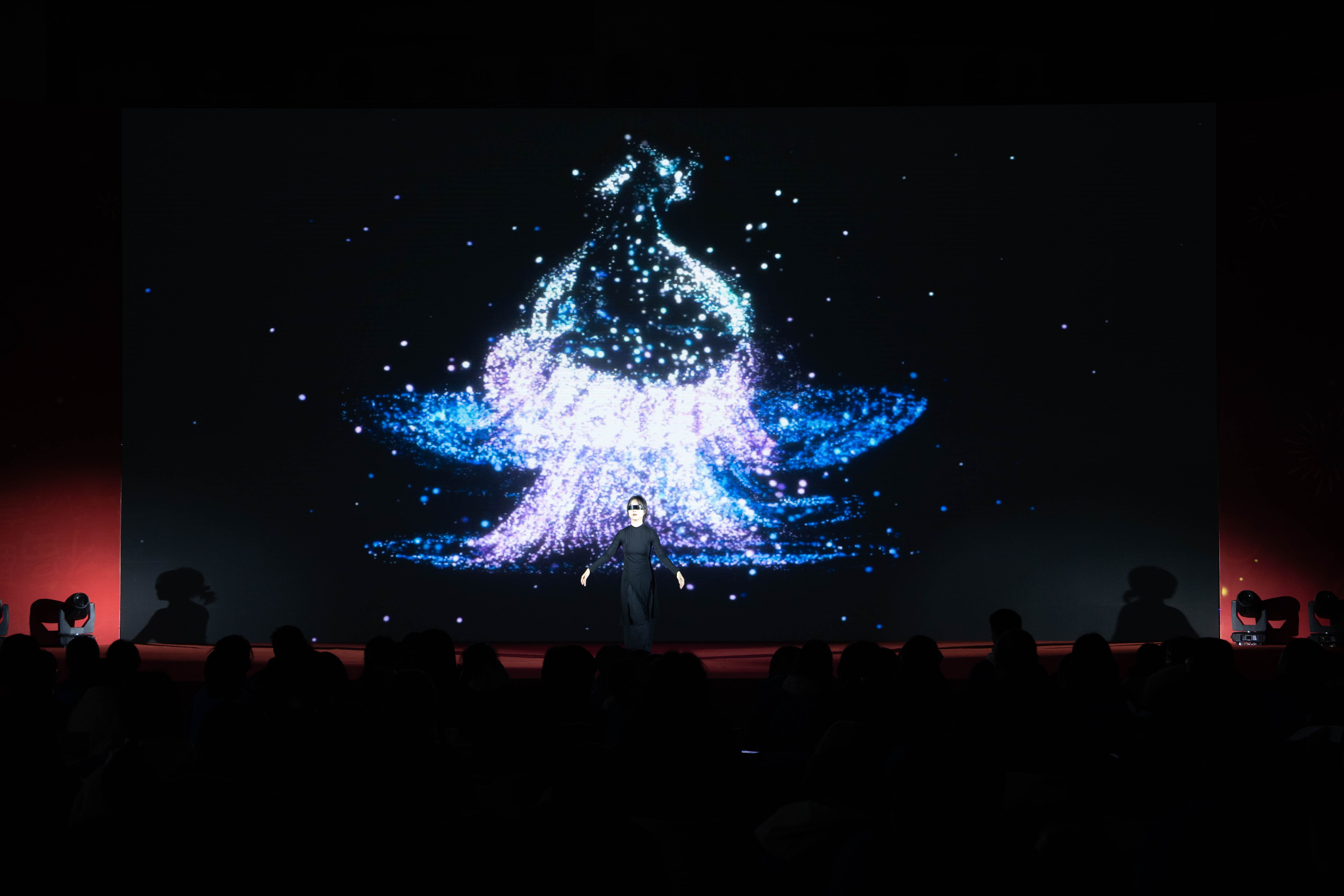 The team's initial vision was to create real-time generative visuals. The goal was to use motion capture technology to enable the visuals to respond instantly to the dancer's movements, achieving a truly "body-driven" experience. However, due to on-site constraints that prevented the deployment of the necessary capture equipment and computing systems, the final performance adopted an alternative approach: the dancer's movements were pre-recorded and then used as data to generate the visuals with AI and procedural algorithms. The flowing white particles seen in the performance are, in fact, a digital avatar generated from this motion data.