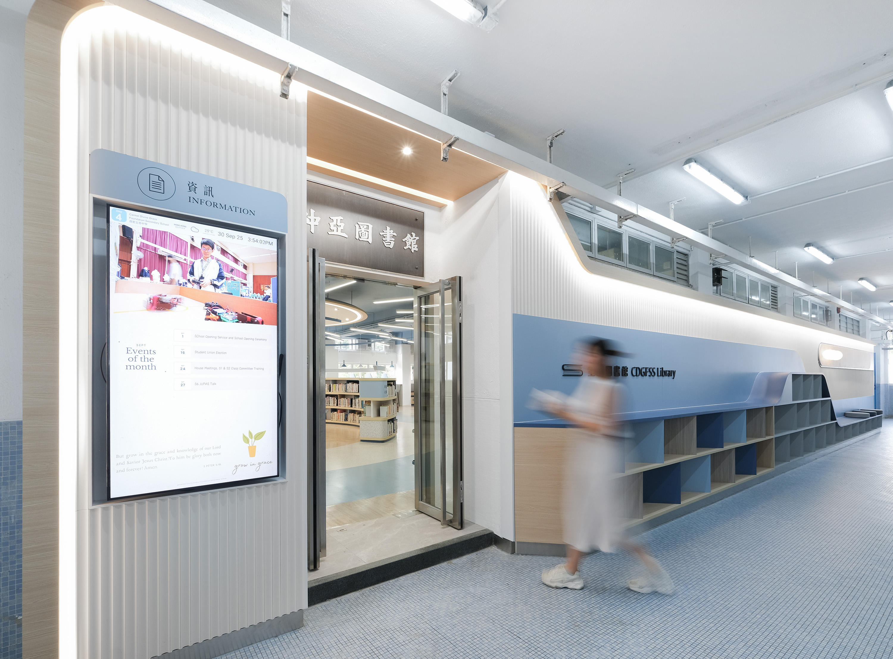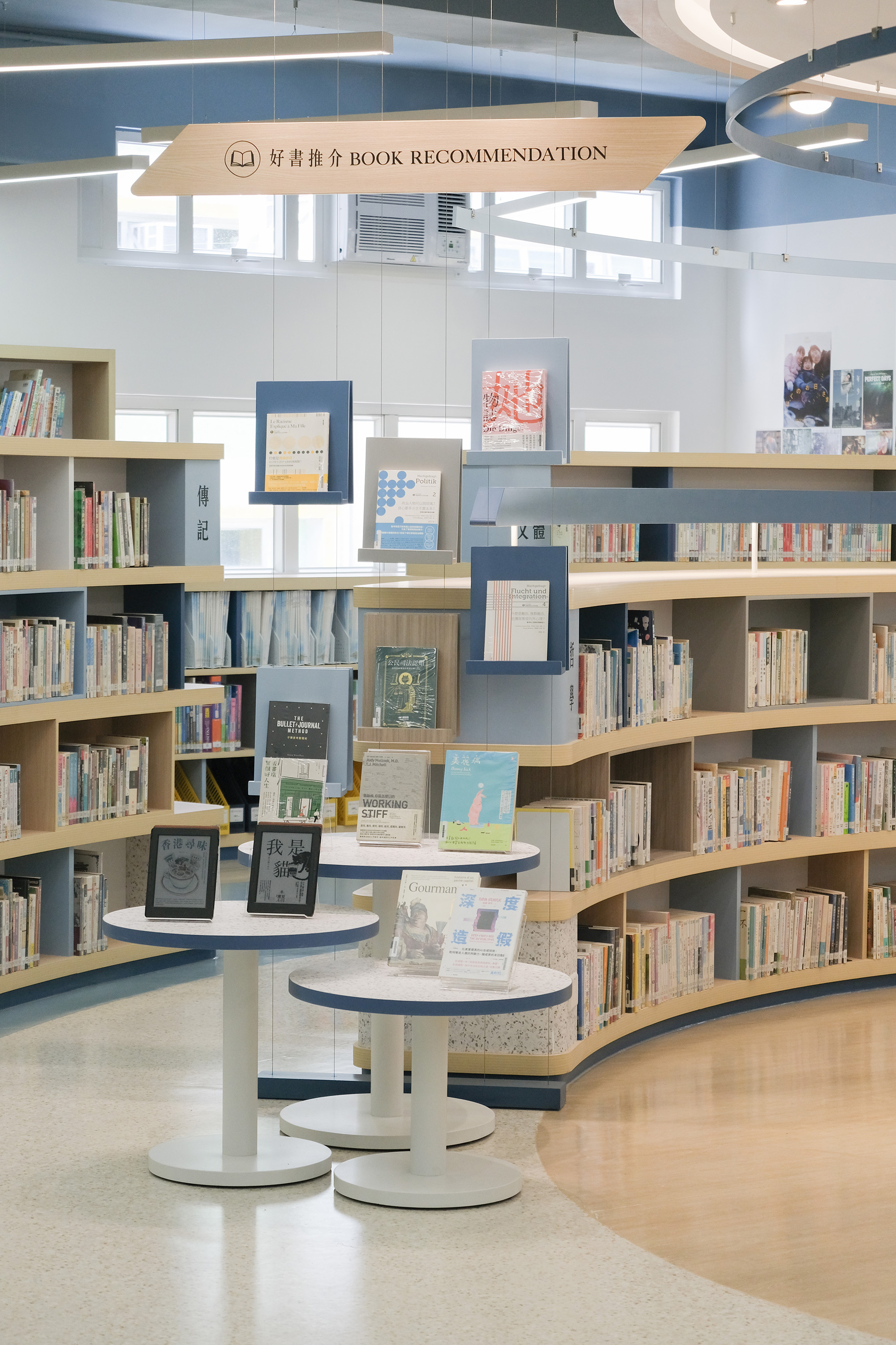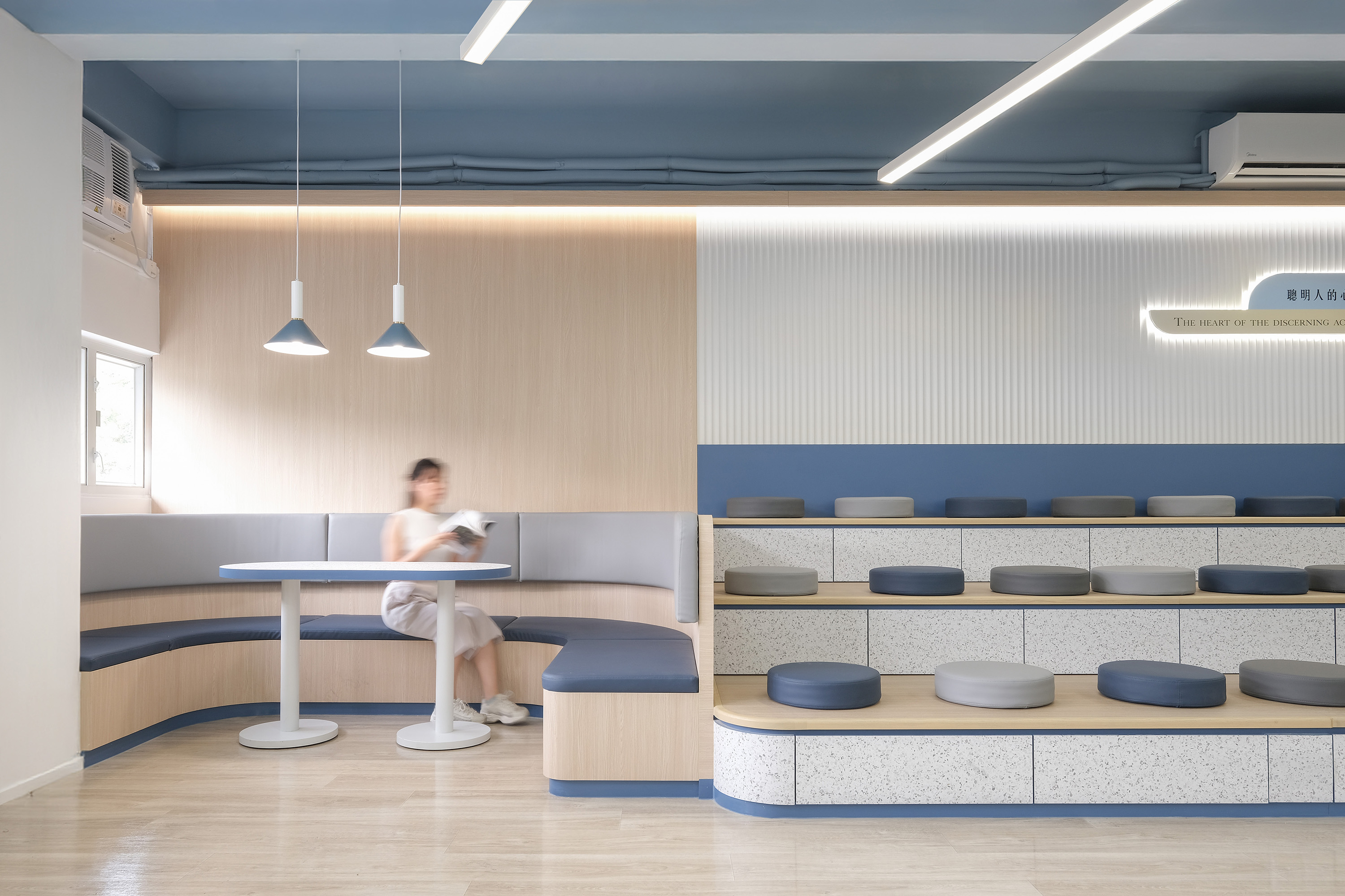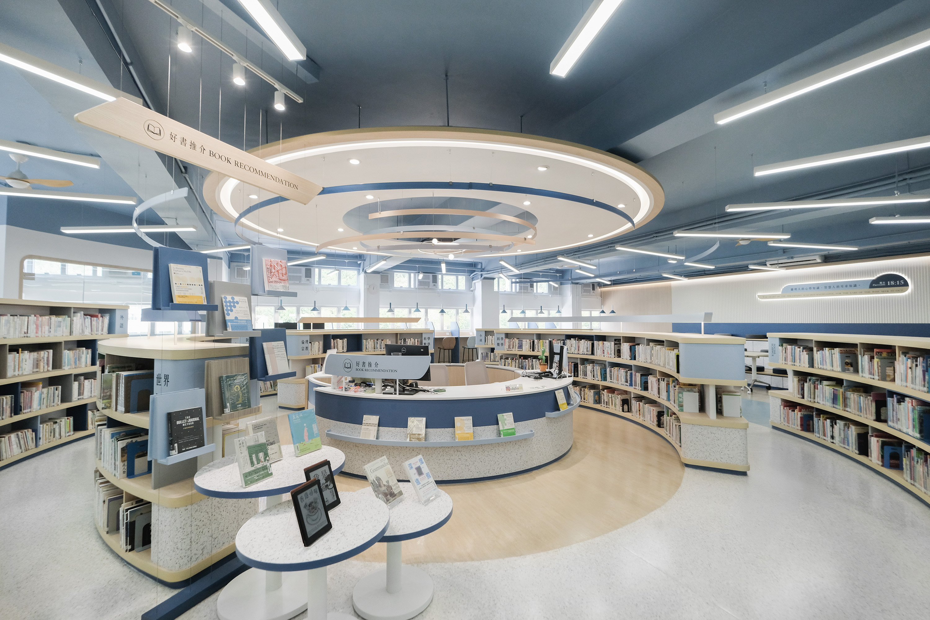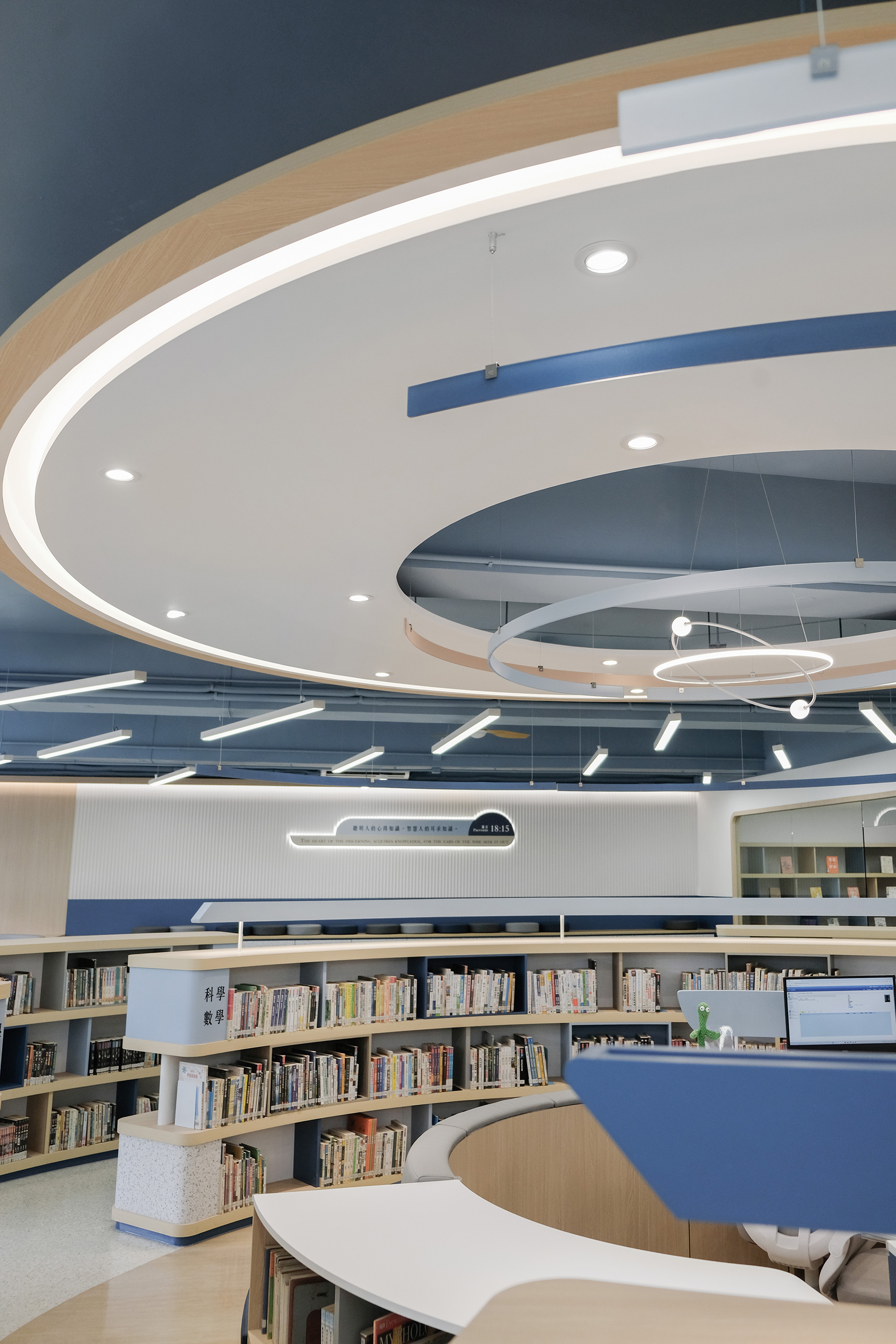 The library's core design concept is "Light of Knowledge." A beam of light converges from the ceiling at the central point, forming a rounded and warm light column that projects downwards onto the circular service desk, then spreads outwards like ripples, defining different functional zones in layers. This light is not merely a visual focal point; it symbolizes the transmission of truth and the inspiration of wisdom, guiding students to explore, think, and grow along its trajectory.