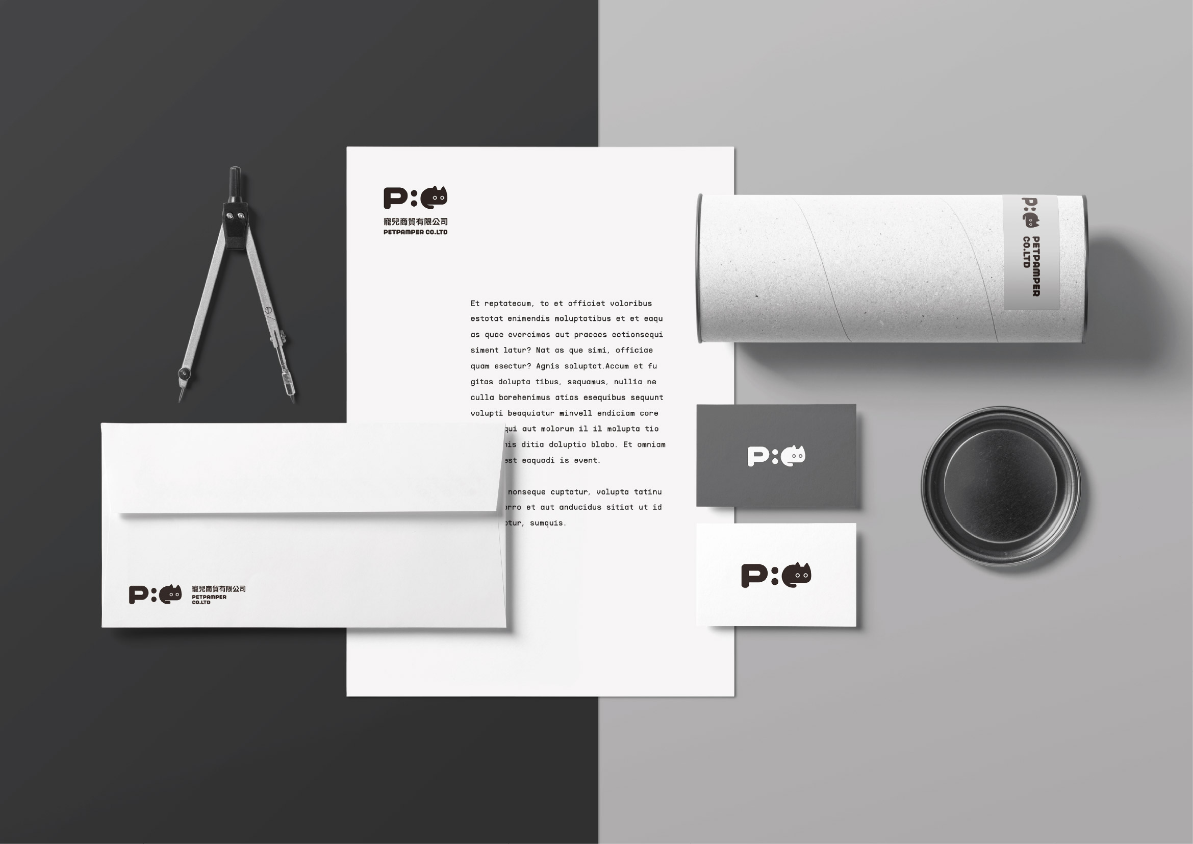 For the brand design approach, we drew inspiration from the company's own pet cat. The logo features a feline silhouette integrated with the company's initial “P”, intuitively expressing the close connection between our business and pet life. The Chinese and English typography blends sans-serif with rounded fonts, creating a pleasant yet highly professional corporate image. The colour scheme primarily uses black and white, resulting in a highly recognisable and distinctly personalised identity.