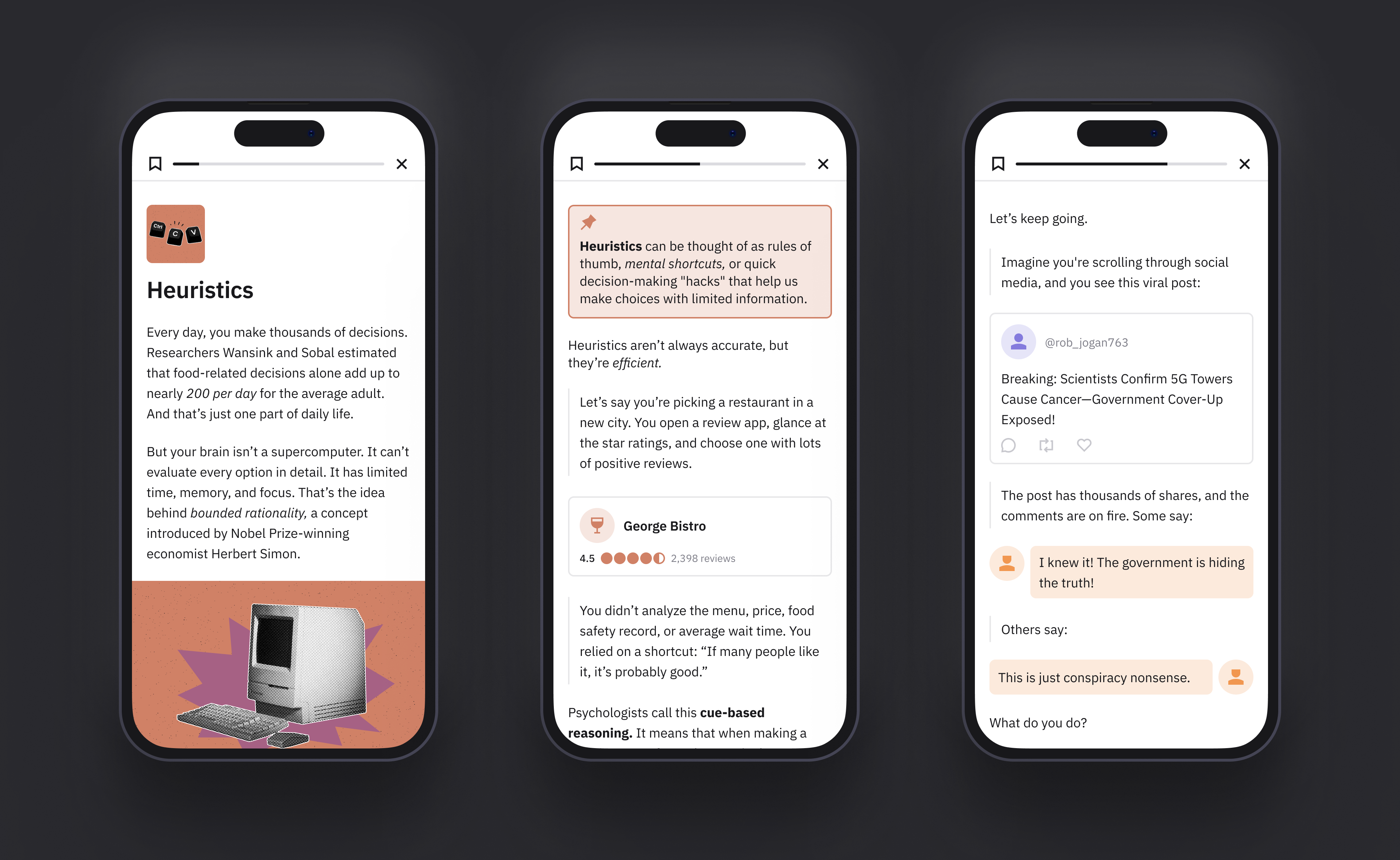 The app uses branching narratives. Your choices shape what you see next. If you already understand something, you skip ahead. If you have a misconception, the content addresses it directly. Each lesson creates multiple paths based on how you respond. Everyone learns the core concept, but the path depends on what you already know and what assumptions you're making. Branching paths require active engagement, not just passive reading and consumption of the material.