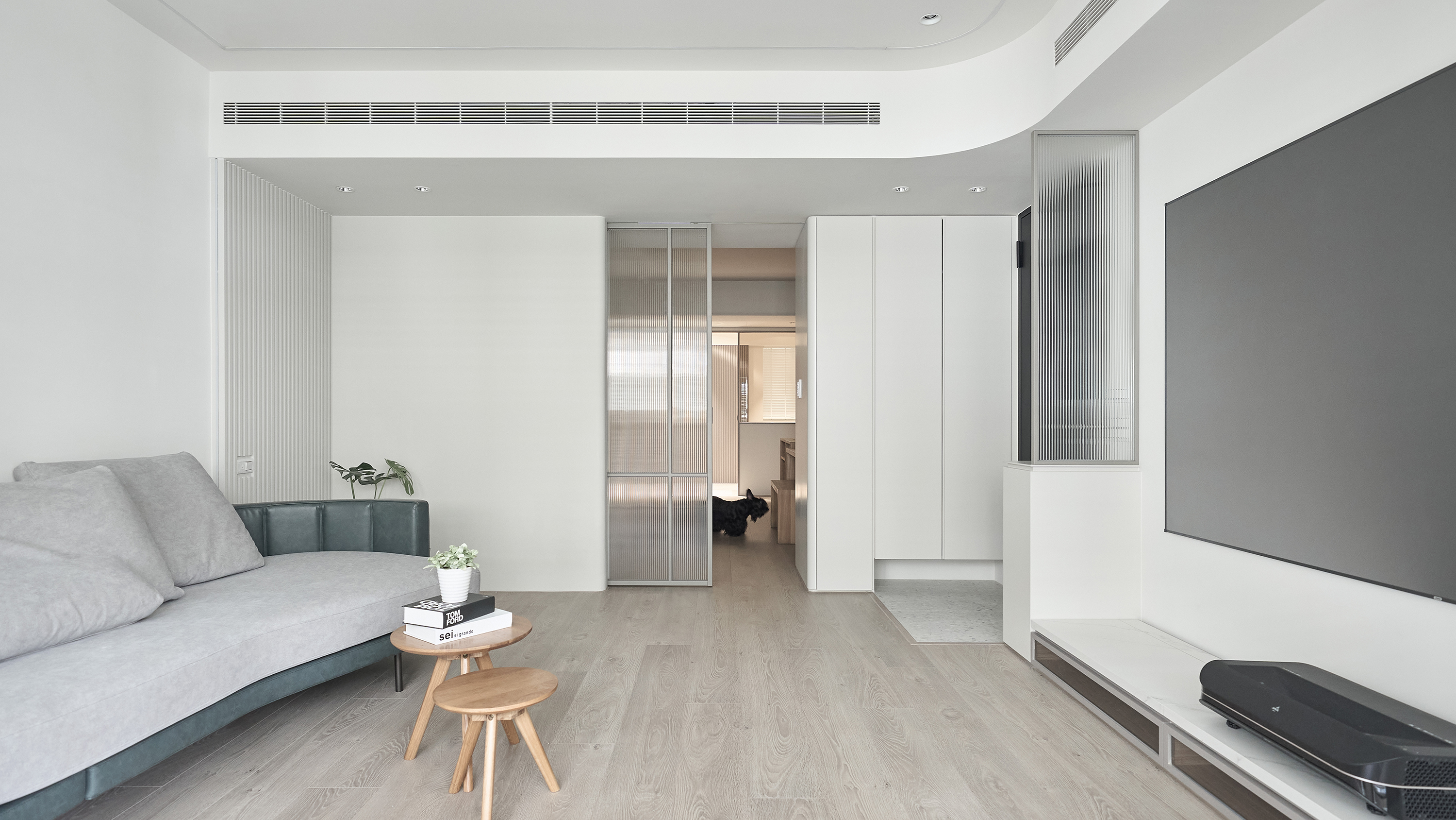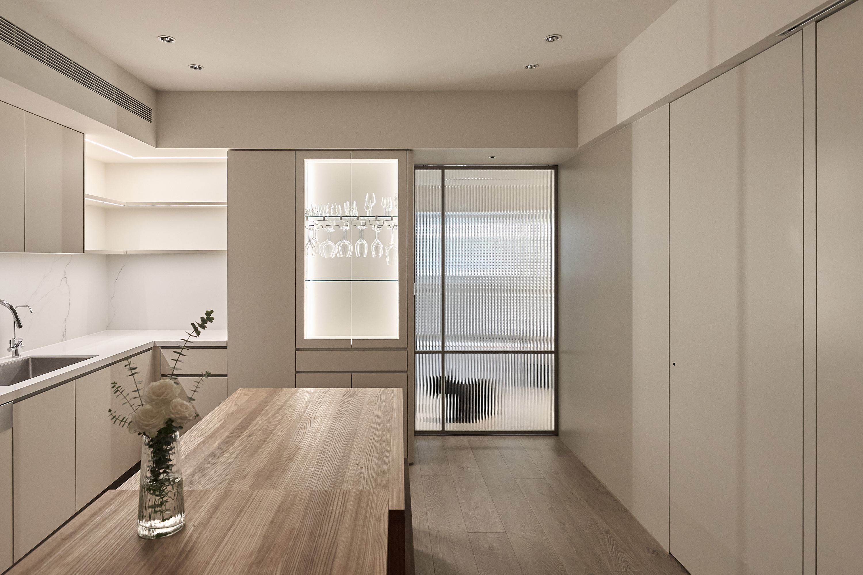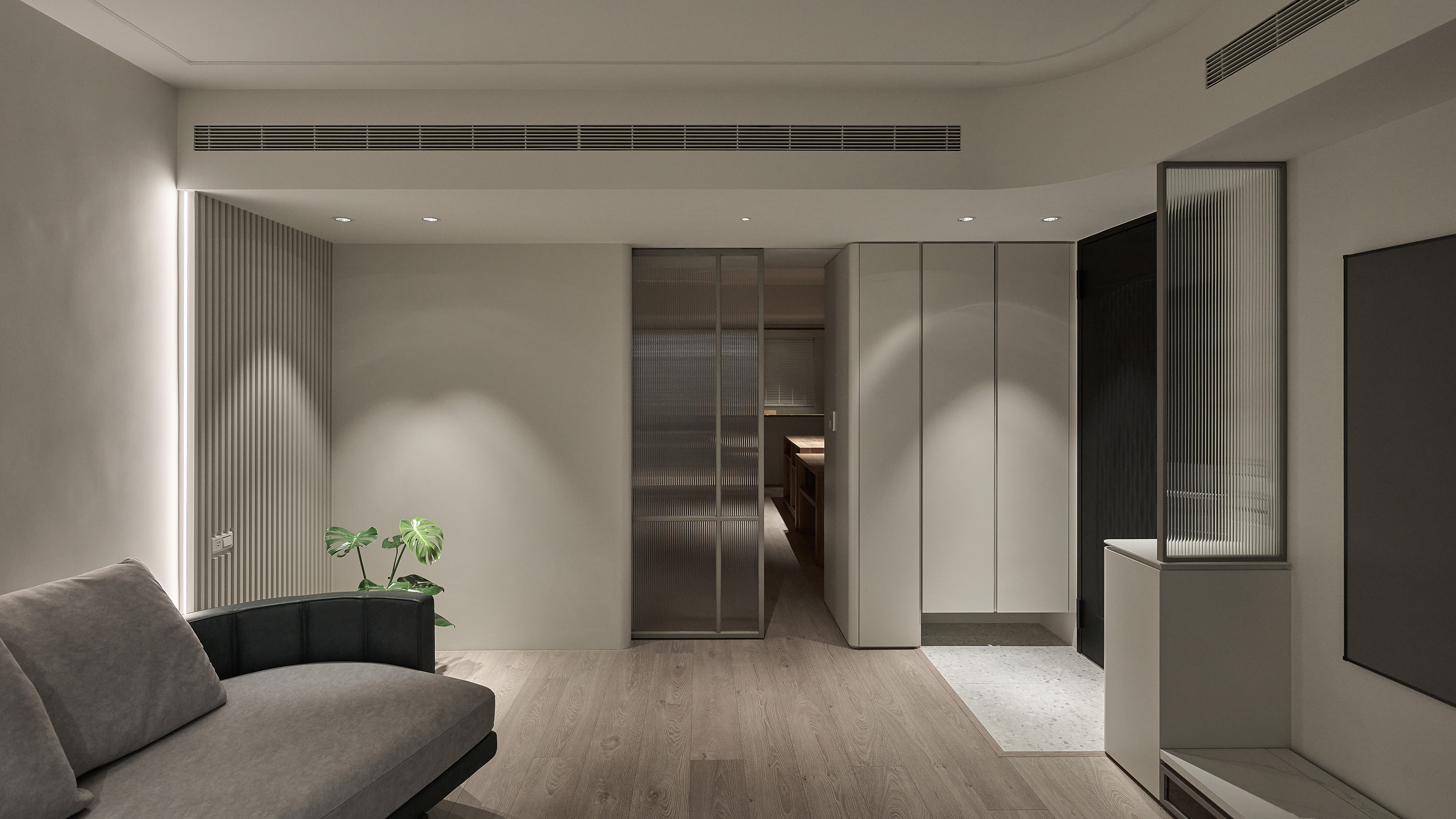 The original master bedroom was overly expansive, constricting circulation and blocking natural light. The designers strategically removed all interior partitions to resolve this problem and established a clear central axis to anchor the home. Around this axis, they gently arranged the private quarters near the kitchen and dining area, while a broad, unobstructed path was preserved through the center, allowing movement to flow effortlessly. What was once a cramped dining space is now transformed into a generous, multifunctional area that the family can adapt to daily needs and gatherings. By unifying the size of the three bedrooms to ensure comfort, the designers thoughtfully freed up fragmented space and carefully repurposed it as an independent guest bathroom. This addition significantly enhances the family’s daily routines, enabling all three members to bathe and prepare simultaneously with ease. The result is not only a home that fully embodies the functions required for modern life but also a design that fulfills the studio’s belief: to endow each space with enduring value through thoughtful planning.
