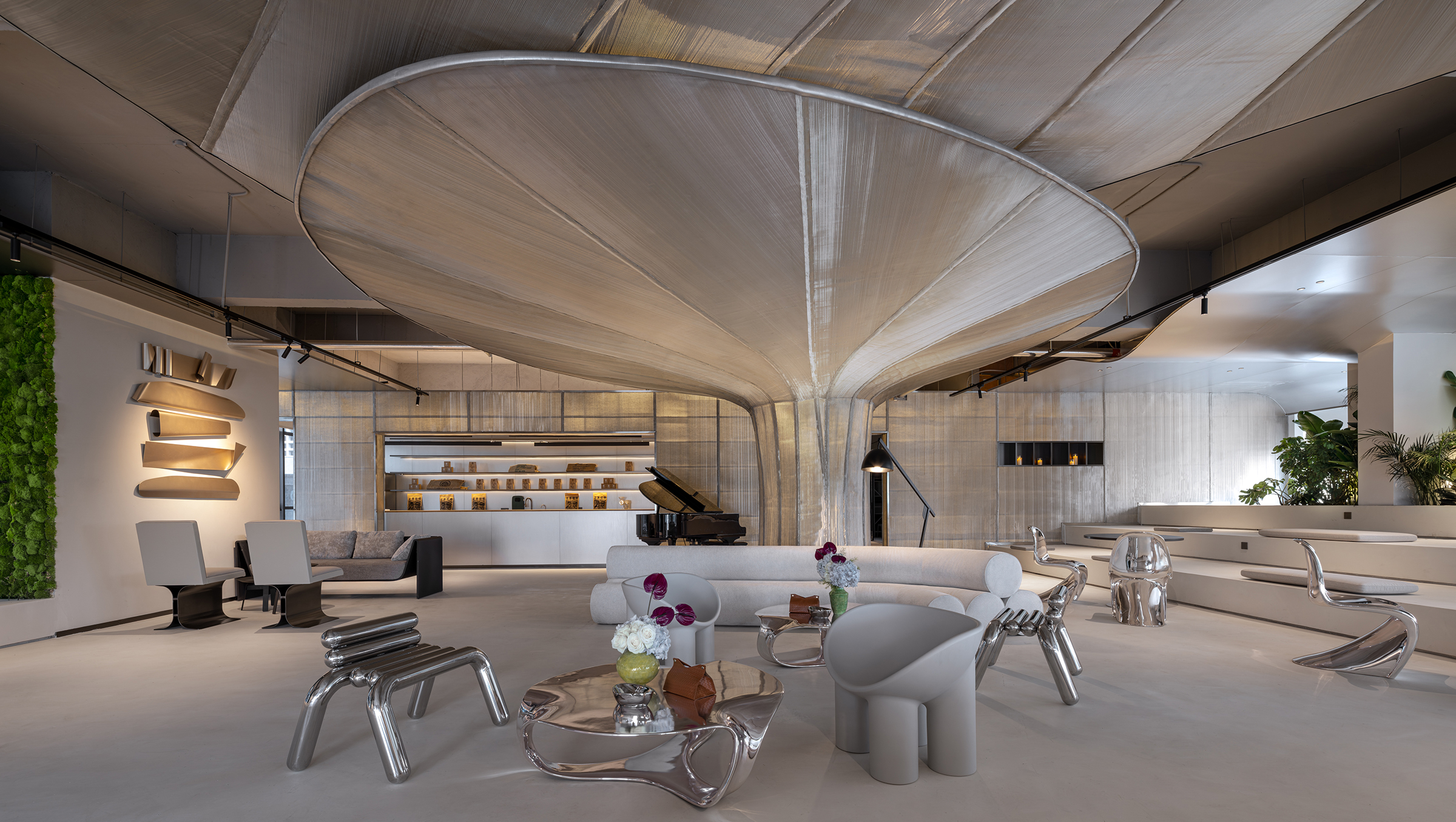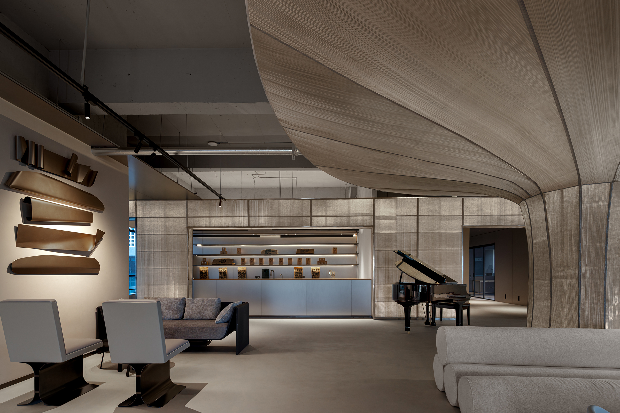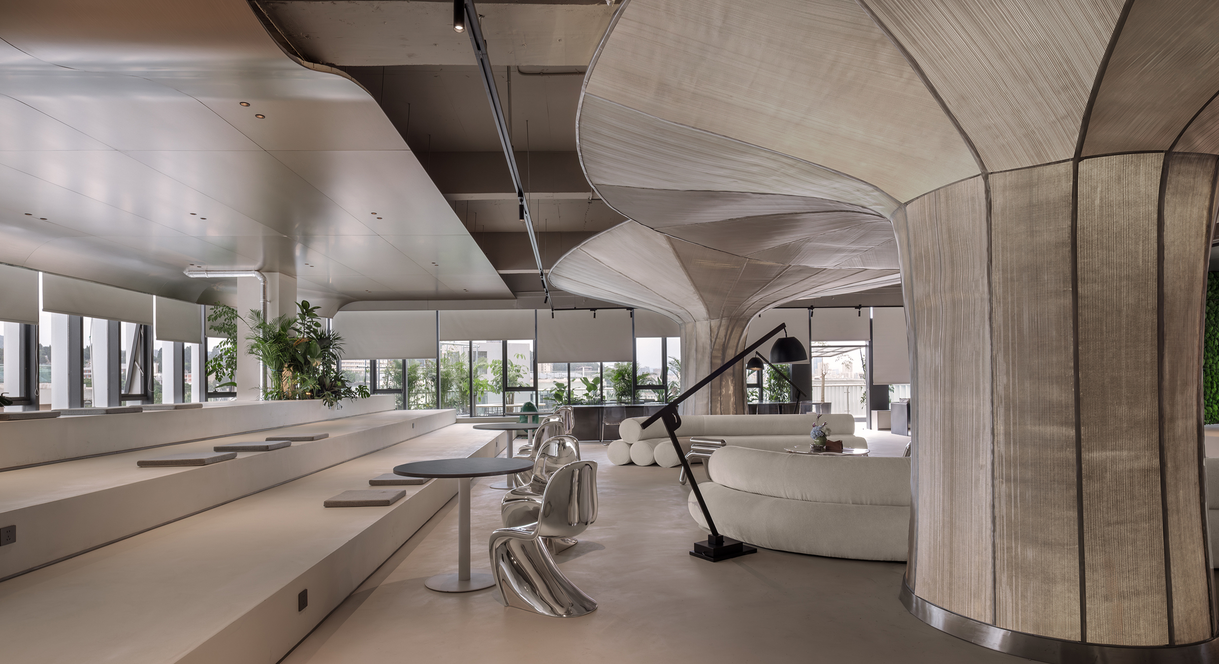 Reinterpreting industrial materials through deconstructivist aesthetics, the design uses light gray art coatings to establish a warm base. Custom metal woven mesh columns form a forest of interwoven virtual and physical structures. These columns serve both functional and artistic purposes, guiding visual flow and shaping light and shadow. At dawn and dusk, sunlight filters through the mesh, casting a flowing matrix of light onto the matte flooring, creating a dynamic visual experience.