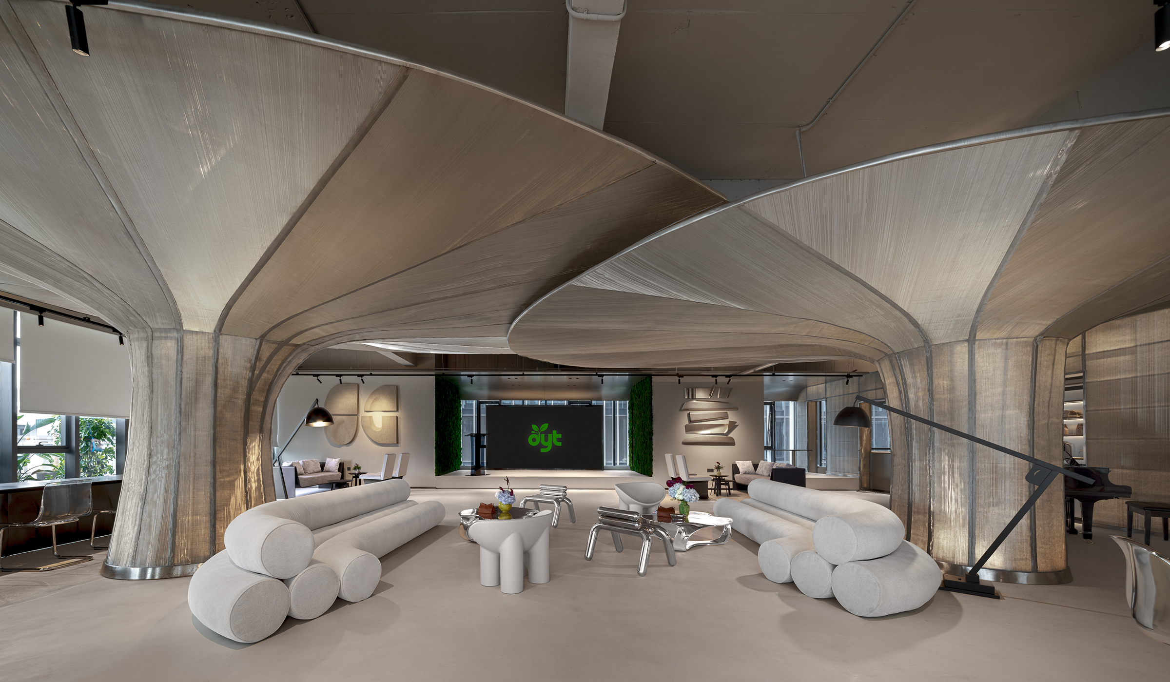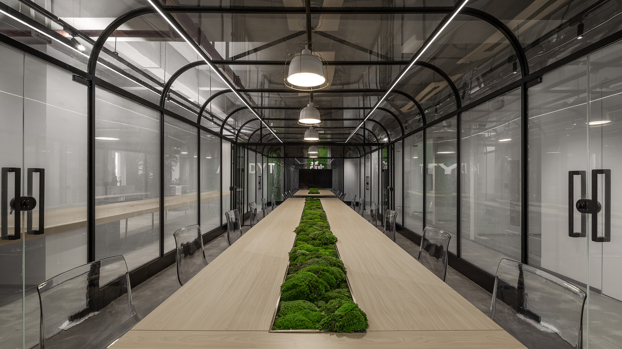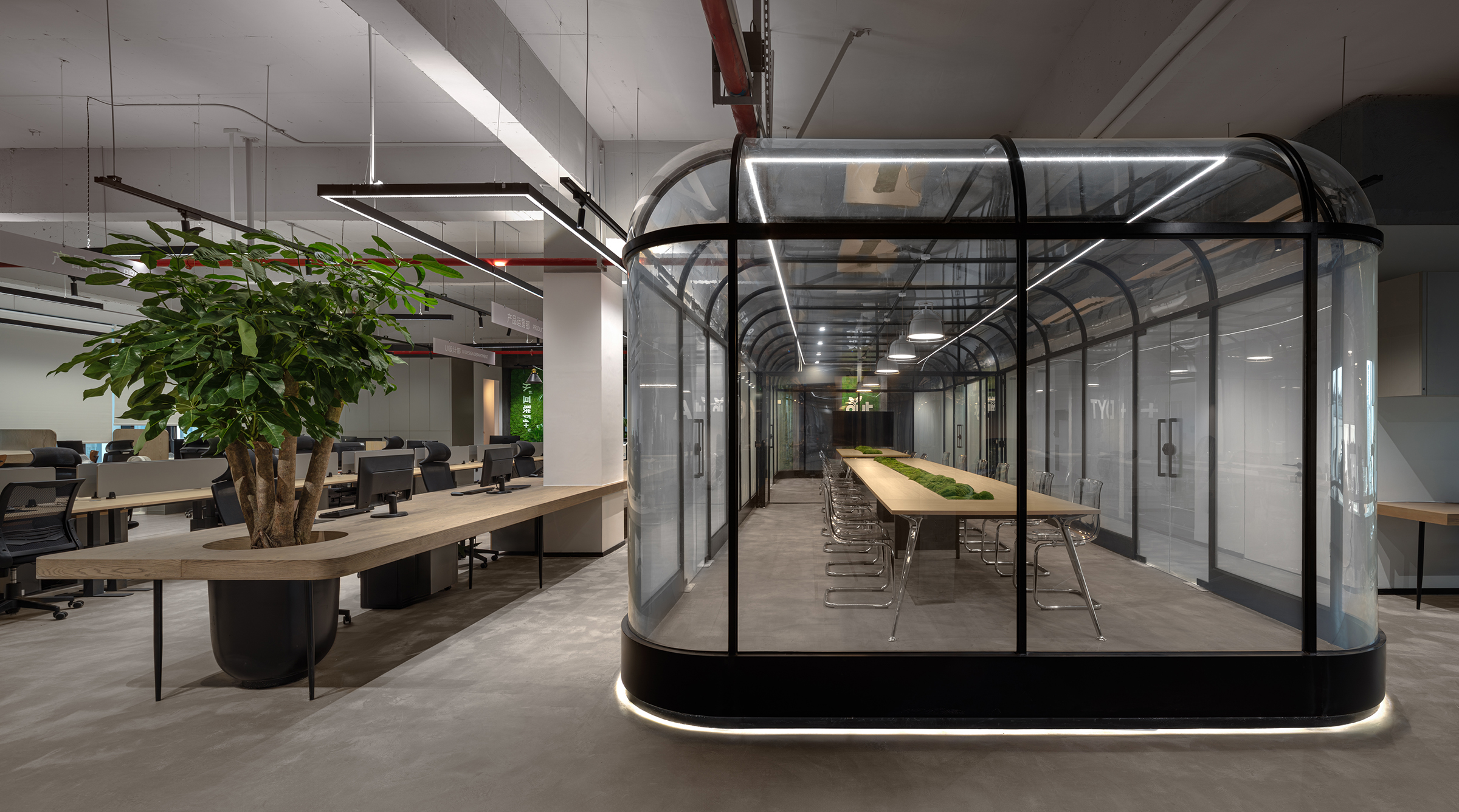 This design integrates the concept of "natural healing power" into the DNA of the Dianyi Tong corporate headquarters, creating a vibrant, healthy office environment that balances industrial aesthetics with ecological wisdom. The space merges wood, greenery, and artistic coatings, where warm natural textures harmonize with a three-dimensional greenery system, and artistic coatings enhance tactile quality. Glass transparency and industrial metal mesh elements create a "breathing, healing" office space.