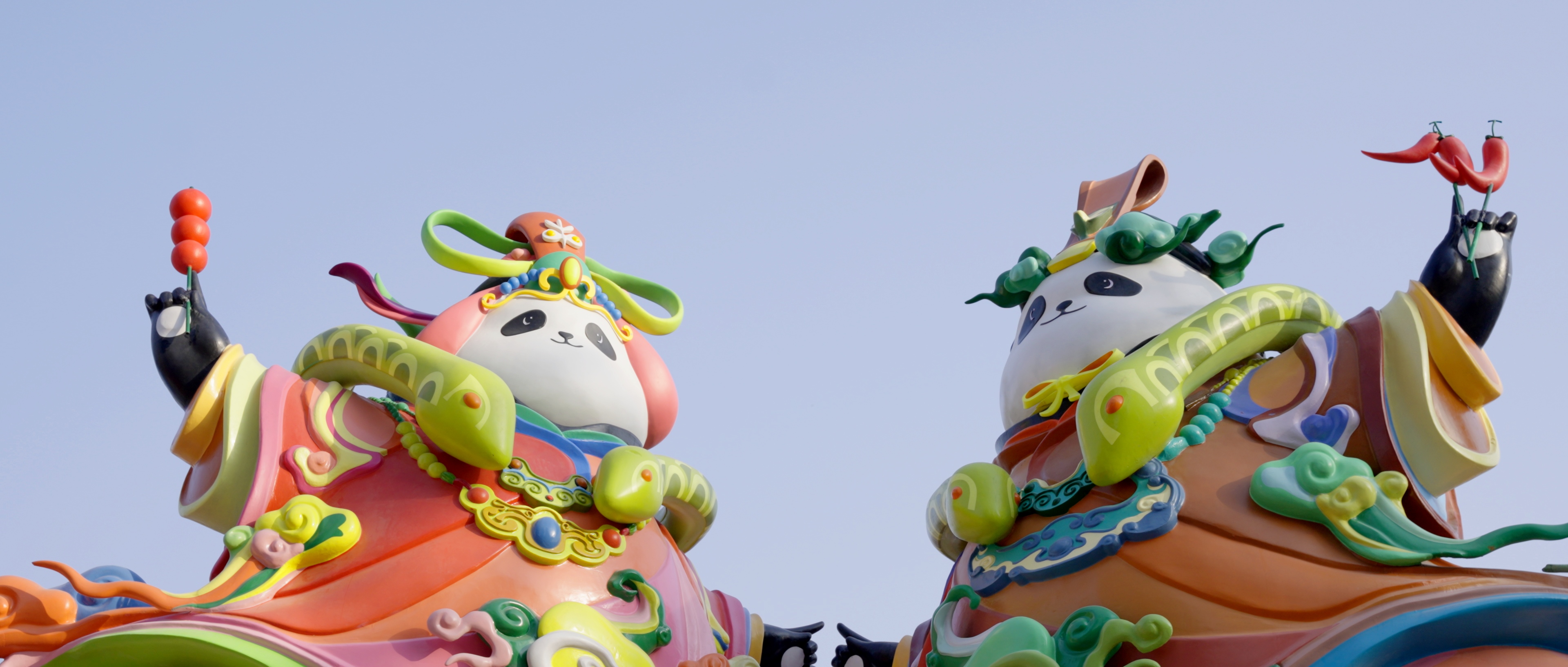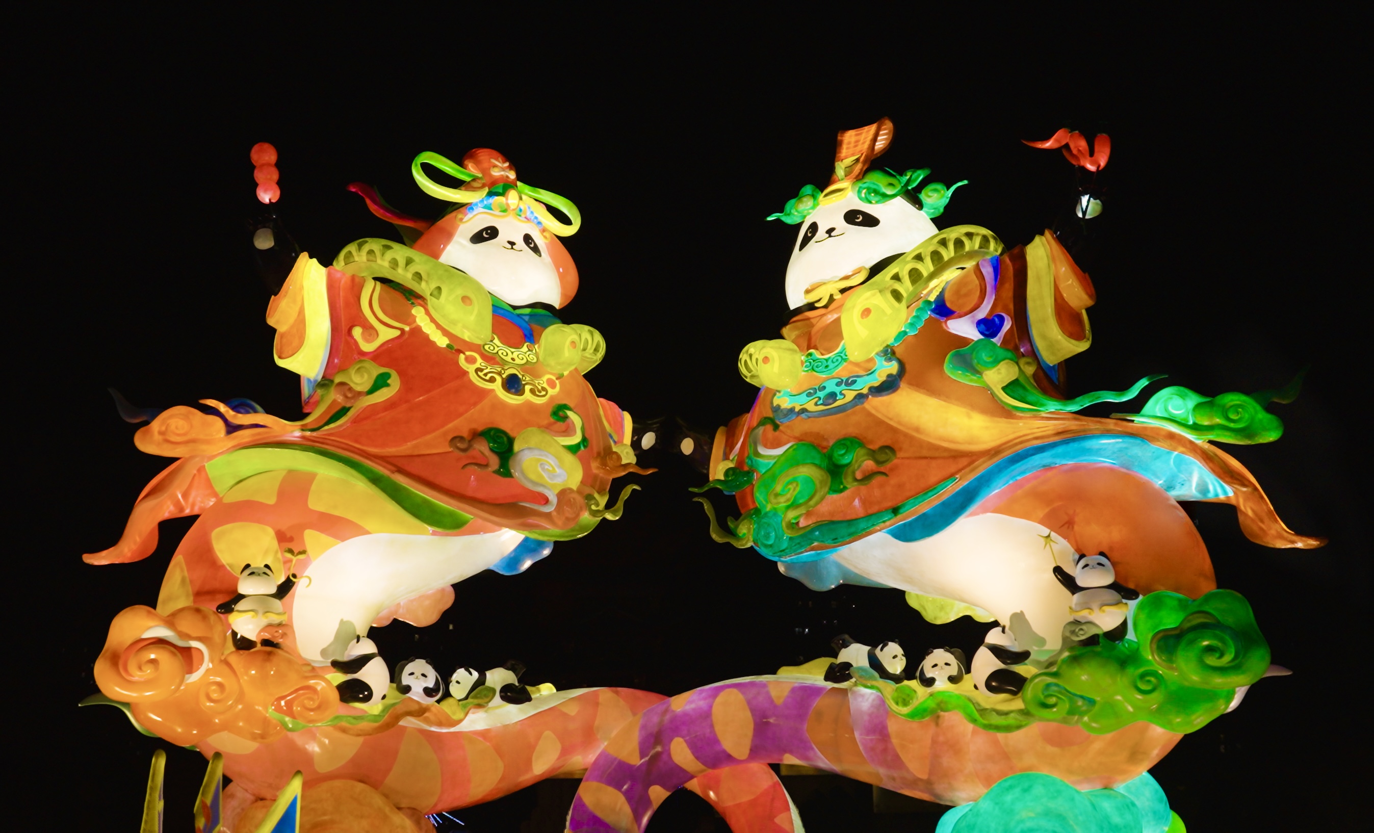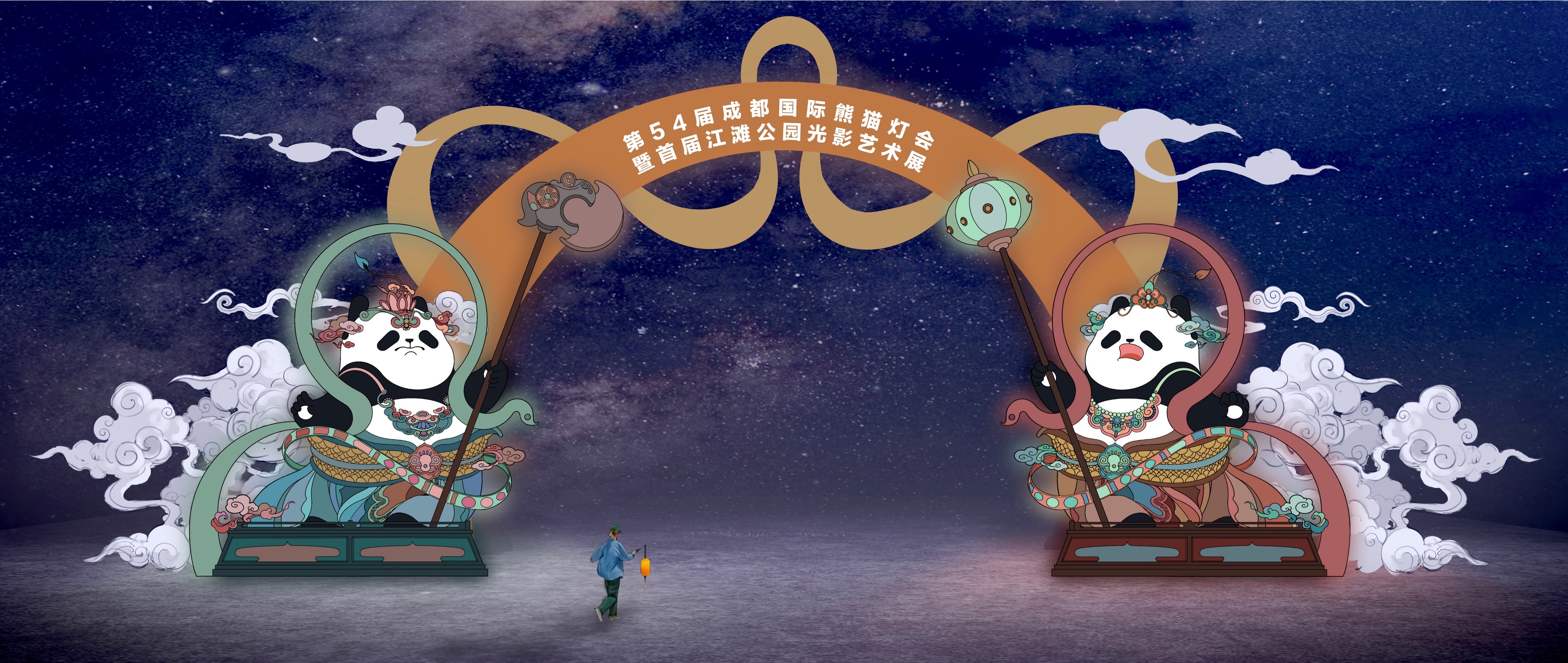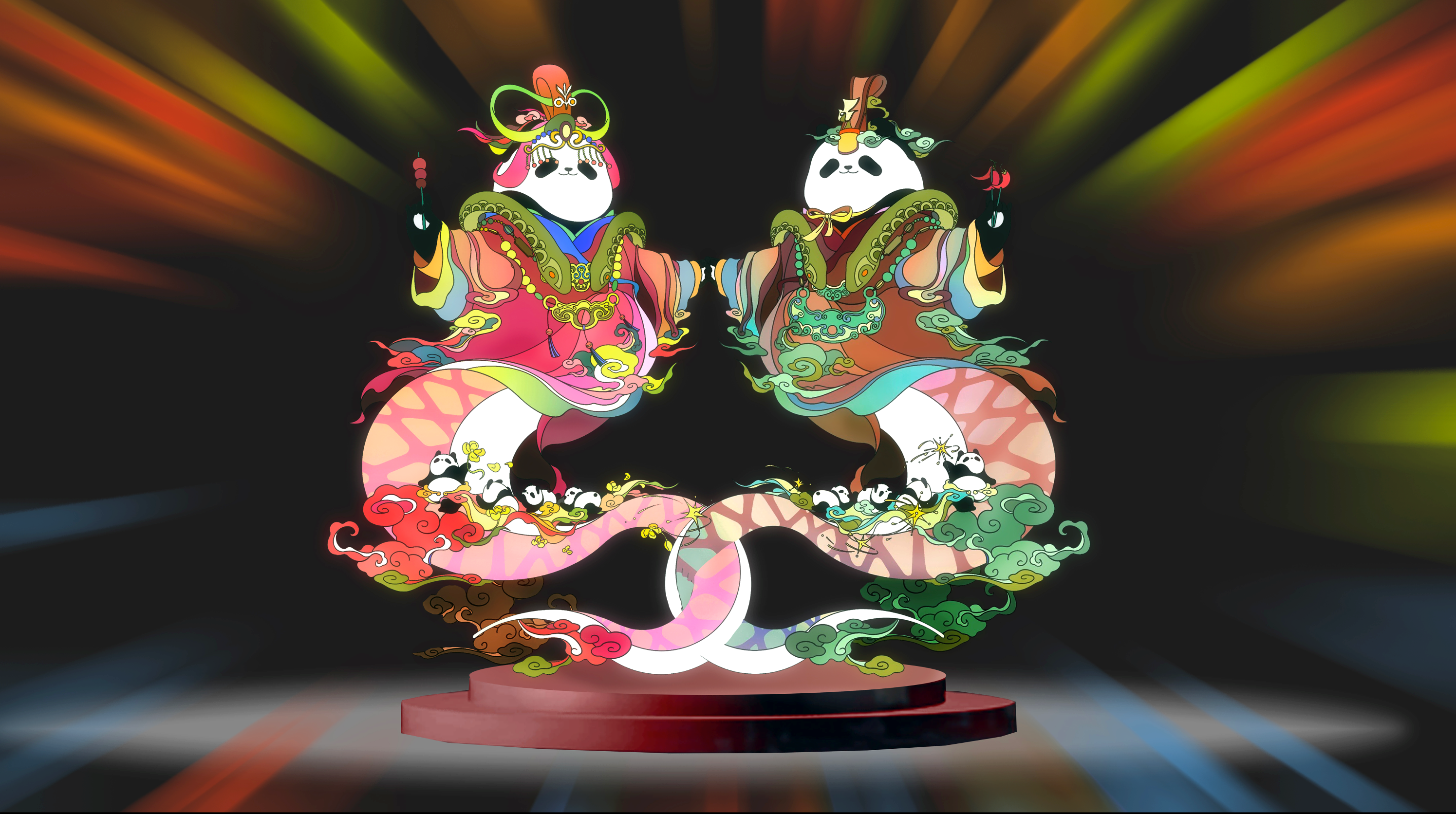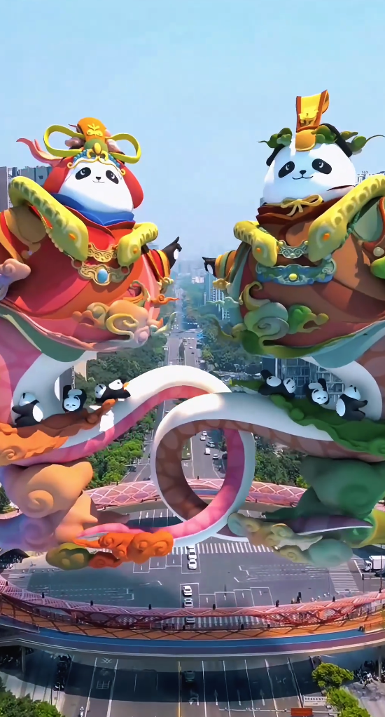 The “Spirit of the Serpent” installation features a central 8.5-meter-tall “Fuxi & Nuwa Panda” lantern surrounded by eight smaller panda-themed sculptures, including a Sichuan Opera “Face-Changing Panda” and an “International Panda Band.” The year 2025 marks the Year of the Snake (Yisi Year) and celebrates the first Chinese Spring Festival after it was officially inscribed on UNESCO’s Intangible Cultural Heritage list. The project team explored how traditional customs, zodiac culture, and contemporary public art could converge to reinvigorate the cultural vitality of the heritage lantern festival. Inspired by the mythological origins of Chinese civilization, the “Fuxi & Nuwa Panda” merges the serpent-bodied deities Fuxi and Nuwa with the symbolic image of the panda, creating a surreal tableau of Eastern mythology. The male panda holds a chili pepper, and the female panda holds a candied hawthorn stick—symbols of Chengdu’s “sweet and spicy” cultural identity, representing warmth, joy, and the sweetness of life. Dressed in festive Han-dynasty attire, the pandas join hands beneath swirling auspicious clouds, surrounded by playful cubs, embodying the festive spirit of renewal and harmony. The “Face-Changing Panda” draws inspiration from the traditional art of Sichuan Opera, blending facial masks with panda imagery to celebrate the diversity and vitality of the art form—symbolizing Chengdu’s openness, creativity, and inclusiveness. Meanwhile, the “Panda Band”—with pandas performing on violin, snare drum, tuba, and flute—illustrates the joyful fusion of Eastern and Western cultures through sound and light. Technologically, the project employs advanced lighting materials that allow the lanterns to appear as sculptural artworks by day and transform into luminous light installations by night—resolving the long-standing issue of traditional lanterns losing visual appeal in daylight. This innovation achieves a “day-to-night aesthetic,” expanding the temporal and spatial experience of the festival. To extend engagement beyond physical space, the team launched an online campaign on Valentine’s Day 2025 titled “Fuxi & Nuwa Panda Spirits Flash Across Chengdu.” The digital animation depicted the panda spirits appearing across Chengdu’s CBD and iconic landmarks before arriving at the lantern festival site—creating an immersive connection between online storytelling and offline celebration.