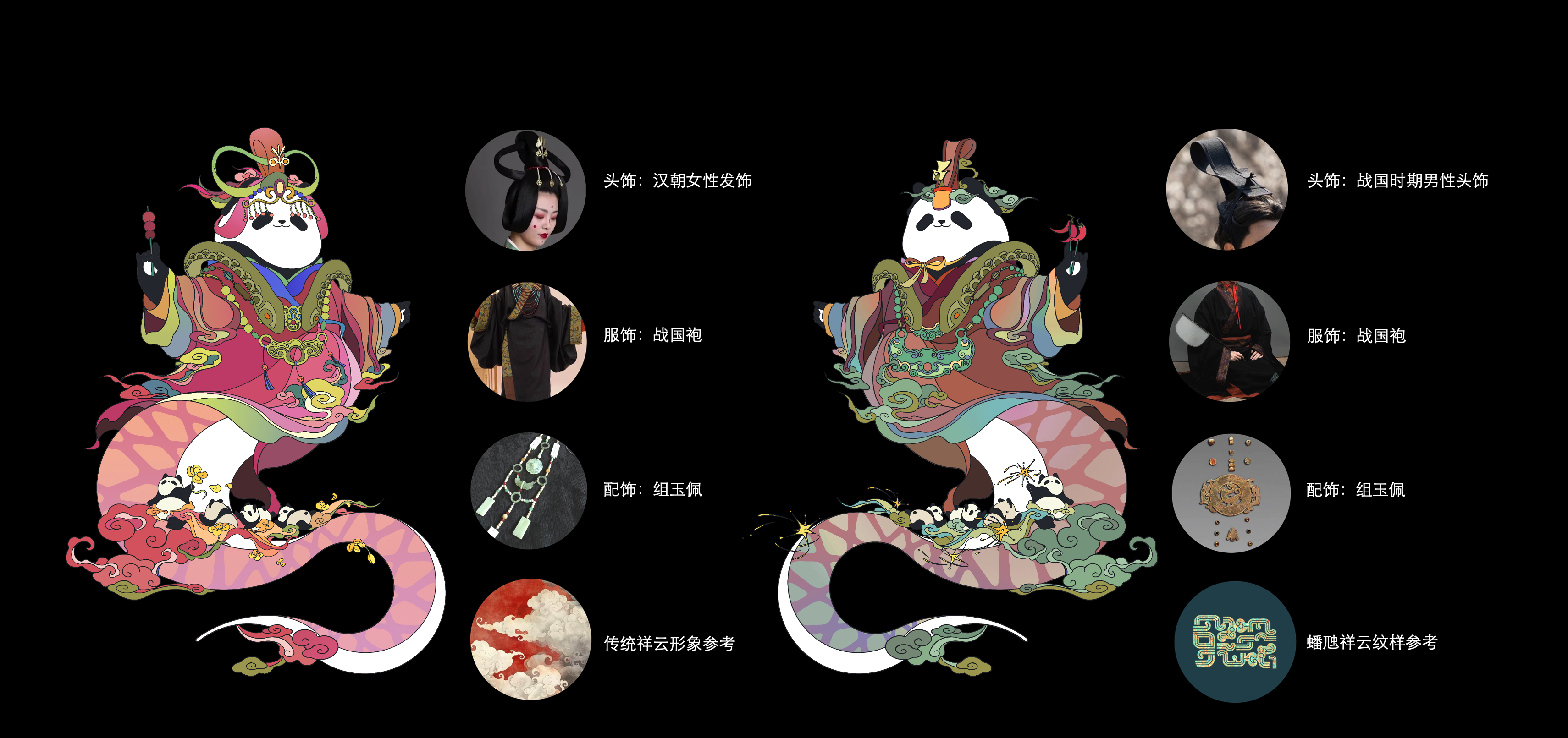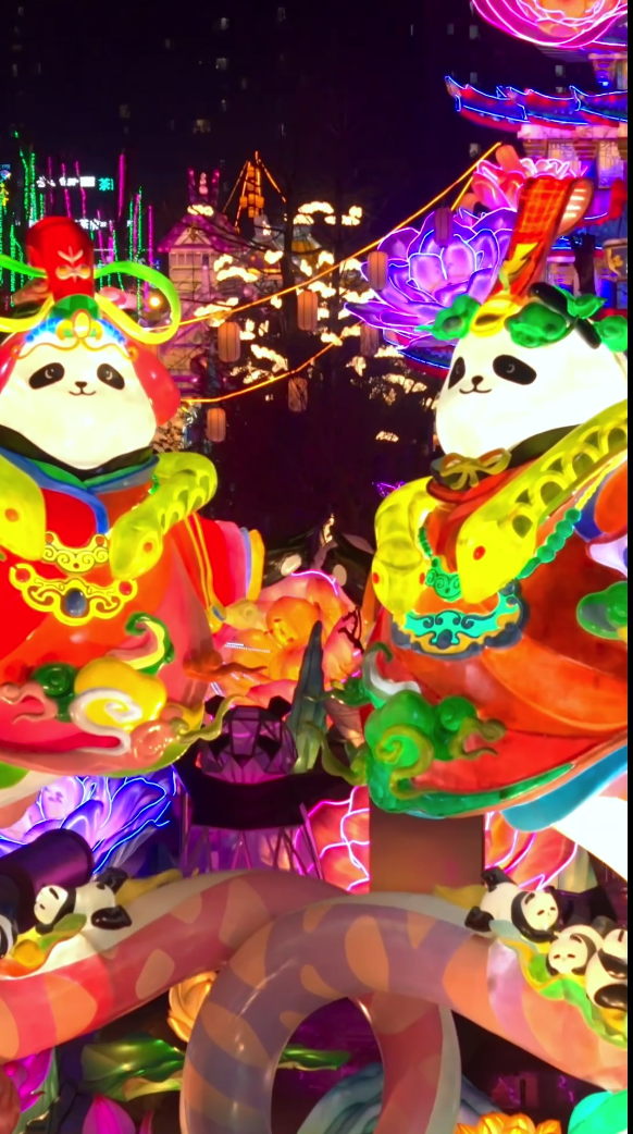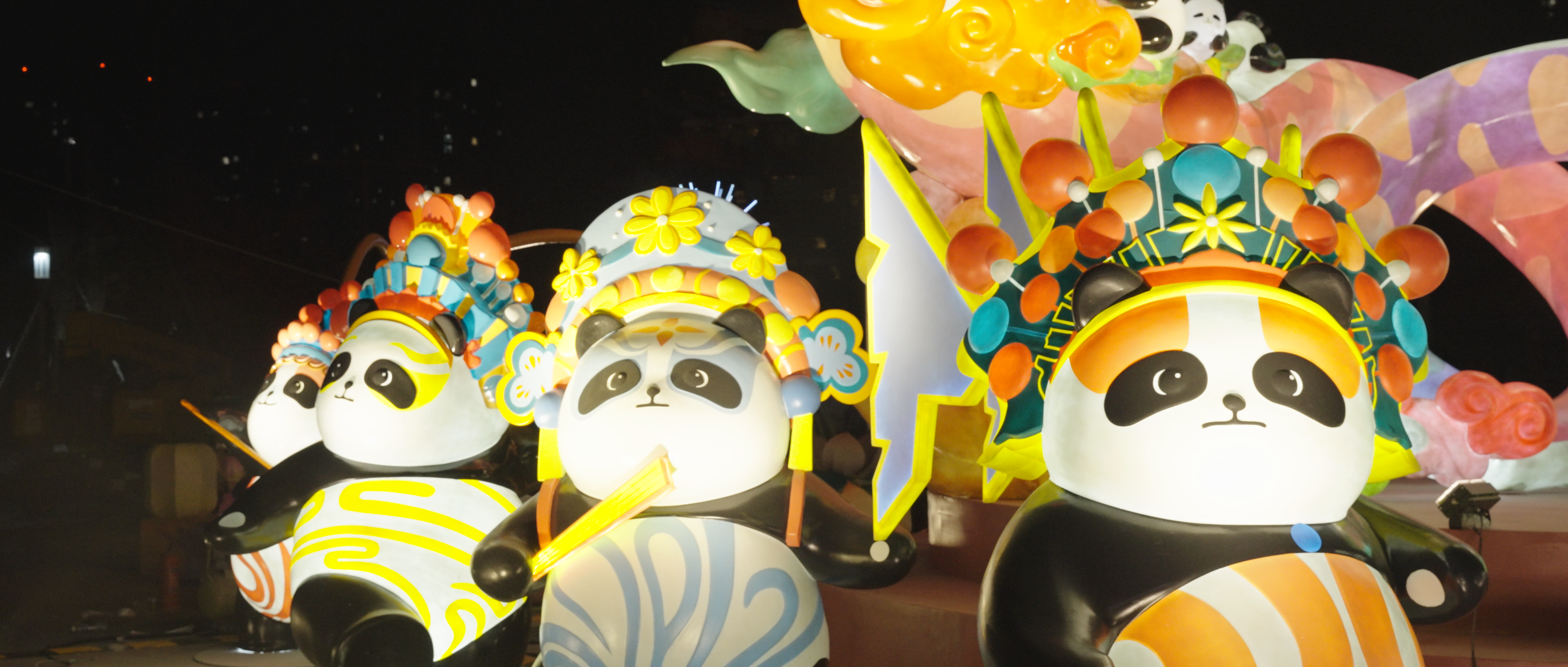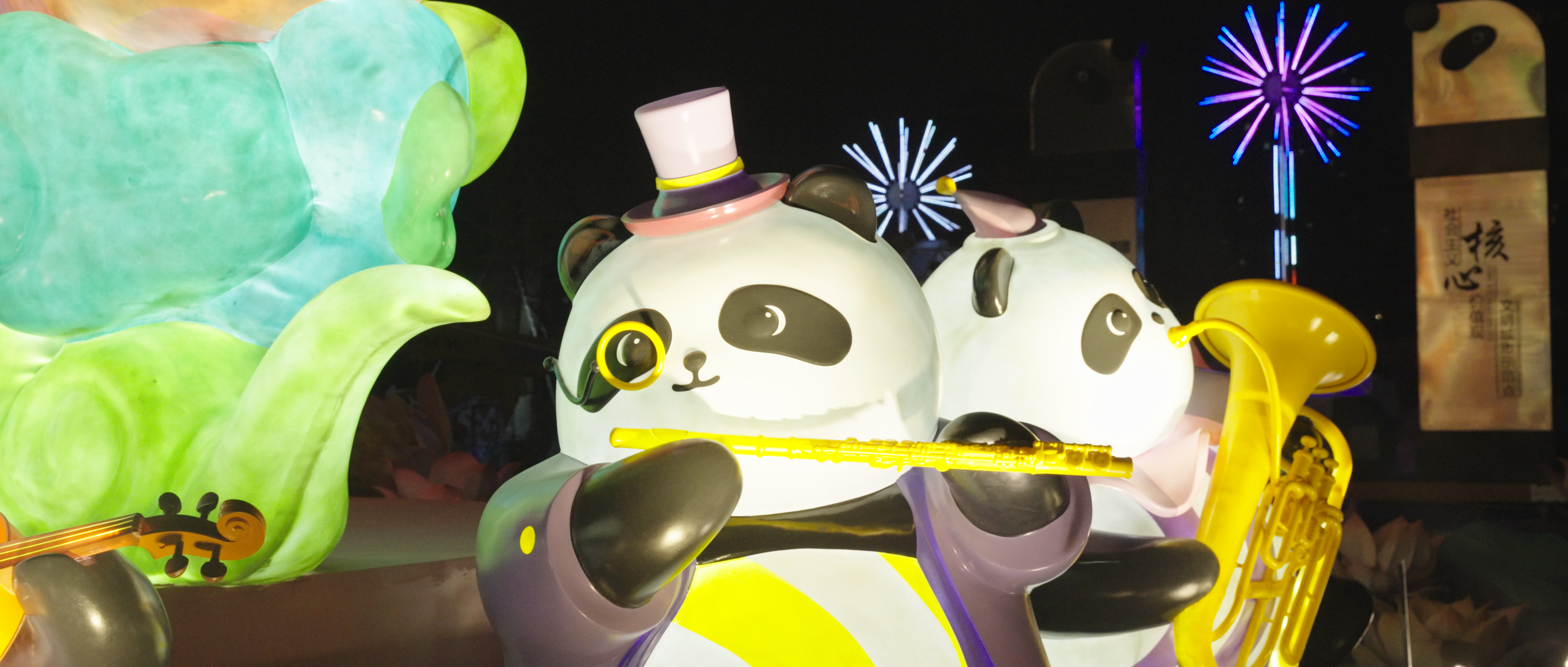 The “Spirit of the Serpent” installation features a central 8.5-meter-tall “Fuxi & Nuwa Panda” lantern surrounded by eight smaller panda-themed sculptures, including a Sichuan Opera “Face-Changing Panda” and an “International Panda Band.” The year 2025 marks the Year of the Snake (Yisi Year) and celebrates the first Chinese Spring Festival after it was officially inscribed on UNESCO’s Intangible Cultural Heritage list. The project team explored how traditional customs, zodiac culture, and contemporary public art could converge to reinvigorate the cultural vitality of the heritage lantern festival. Inspired by the mythological origins of Chinese civilization, the “Fuxi & Nuwa Panda” merges the serpent-bodied deities Fuxi and Nuwa with the symbolic image of the panda, creating a surreal tableau of Eastern mythology. The male panda holds a chili pepper, and the female panda holds a candied hawthorn stick—symbols of Chengdu’s “sweet and spicy” cultural identity, representing warmth, joy, and the sweetness of life. Dressed in festive Han-dynasty attire, the pandas join hands beneath swirling auspicious clouds, surrounded by playful cubs, embodying the festive spirit of renewal and harmony. The “Face-Changing Panda” draws inspiration from the traditional art of Sichuan Opera, blending facial masks with panda imagery to celebrate the diversity and vitality of the art form—symbolizing Chengdu’s openness, creativity, and inclusiveness. Meanwhile, the “Panda Band”—with pandas performing on violin, snare drum, tuba, and flute—illustrates the joyful fusion of Eastern and Western cultures through sound and light. Technologically, the project employs advanced lighting materials that allow the lanterns to appear as sculptural artworks by day and transform into luminous light installations by night—resolving the long-standing issue of traditional lanterns losing visual appeal in daylight. This innovation achieves a “day-to-night aesthetic,” expanding the temporal and spatial experience of the festival. To extend engagement beyond physical space, the team launched an online campaign on Valentine’s Day 2025 titled “Fuxi & Nuwa Panda Spirits Flash Across Chengdu.” The digital animation depicted the panda spirits appearing across Chengdu’s CBD and iconic landmarks before arriving at the lantern festival site—creating an immersive connection between online storytelling and offline celebration.