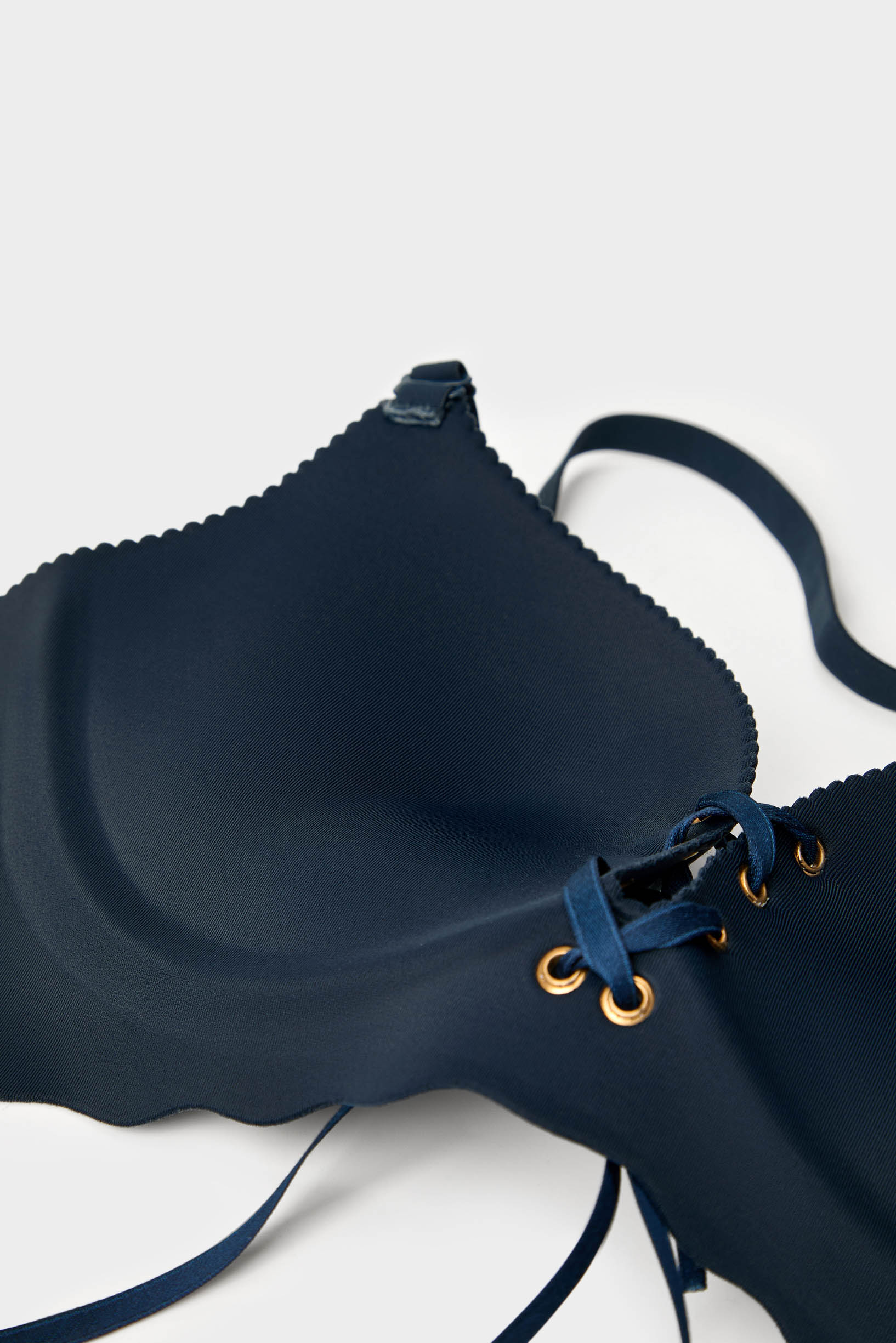 The bra is accented with wave-shaped trim, whose soft curves add a sense of romance and elegance. The elastic lace stretches naturally with body movement and breathing, ensuring a comfortable yet non-restrictive fit. The delicate laces add a lively flair and enable the bra to match perfectly with low-cut garments, subtly revealing cleavage.
