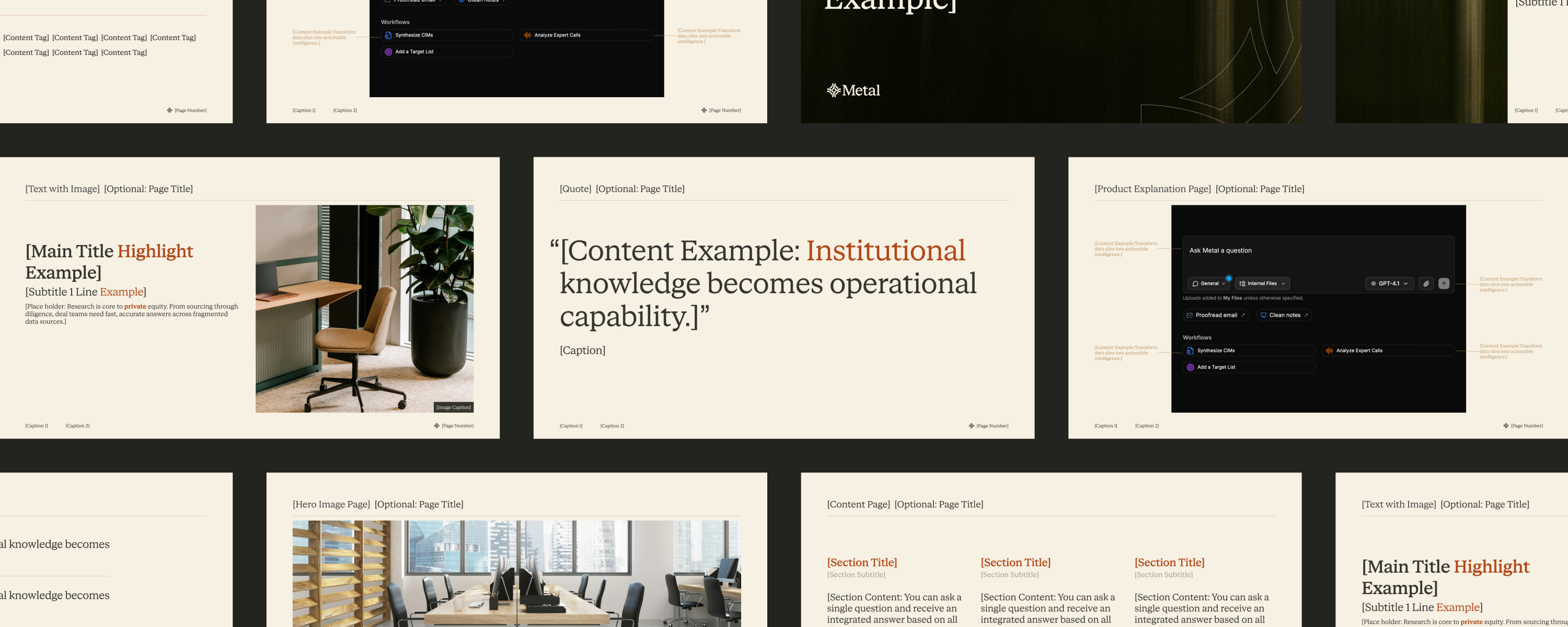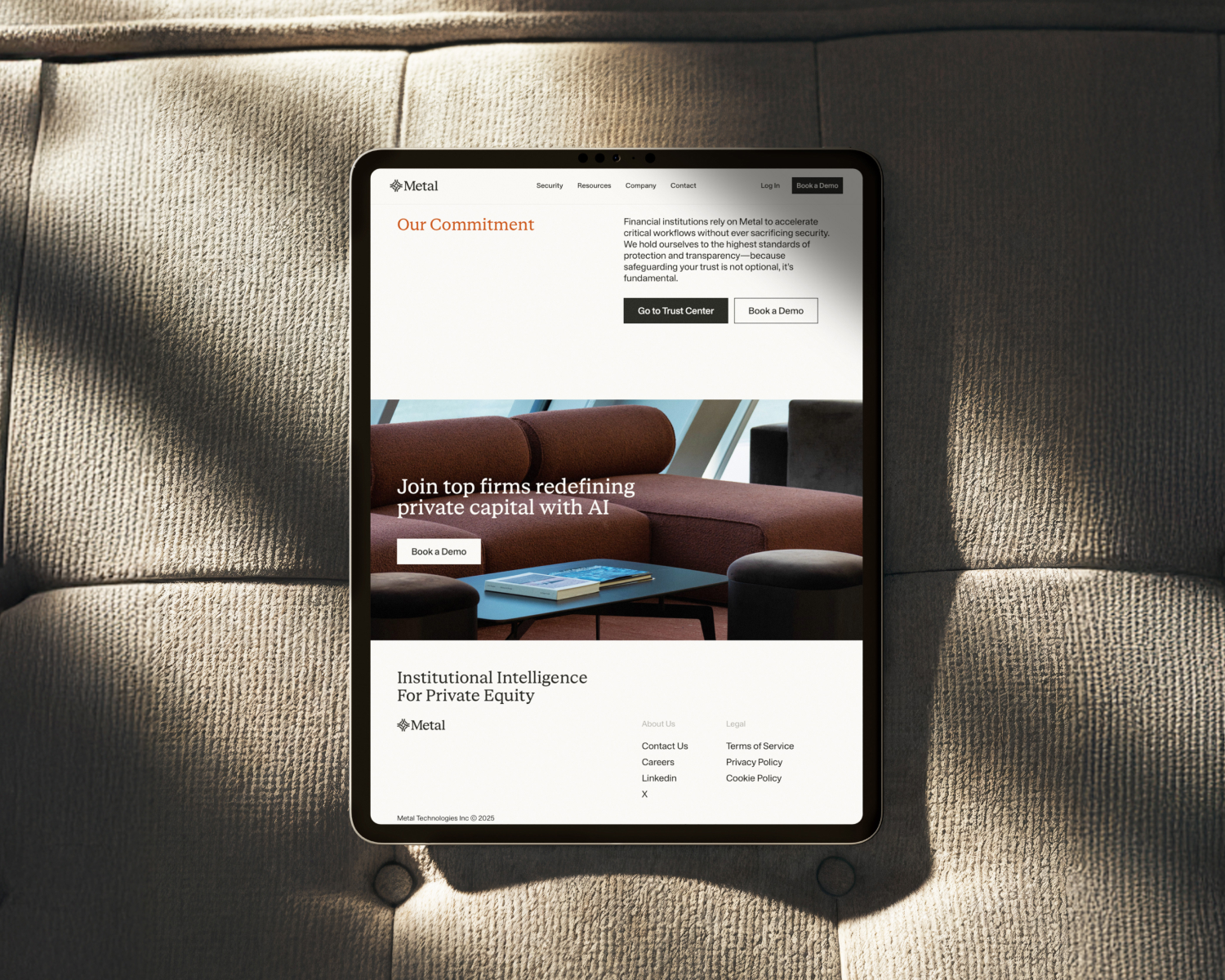 I repositioned Metal as "Institutional Intelligence", giving clients a clear framework to understand what Metal offers and achieves. The logo speaks to their core value: connecting and preserving scattered knowledge into systematic advantage. Every visual decision balanced institutional gravitas with intelligent surprise, from golden streaming light representing intelligence flowing through foundations to sophisticated typography that commands boardroom respect.