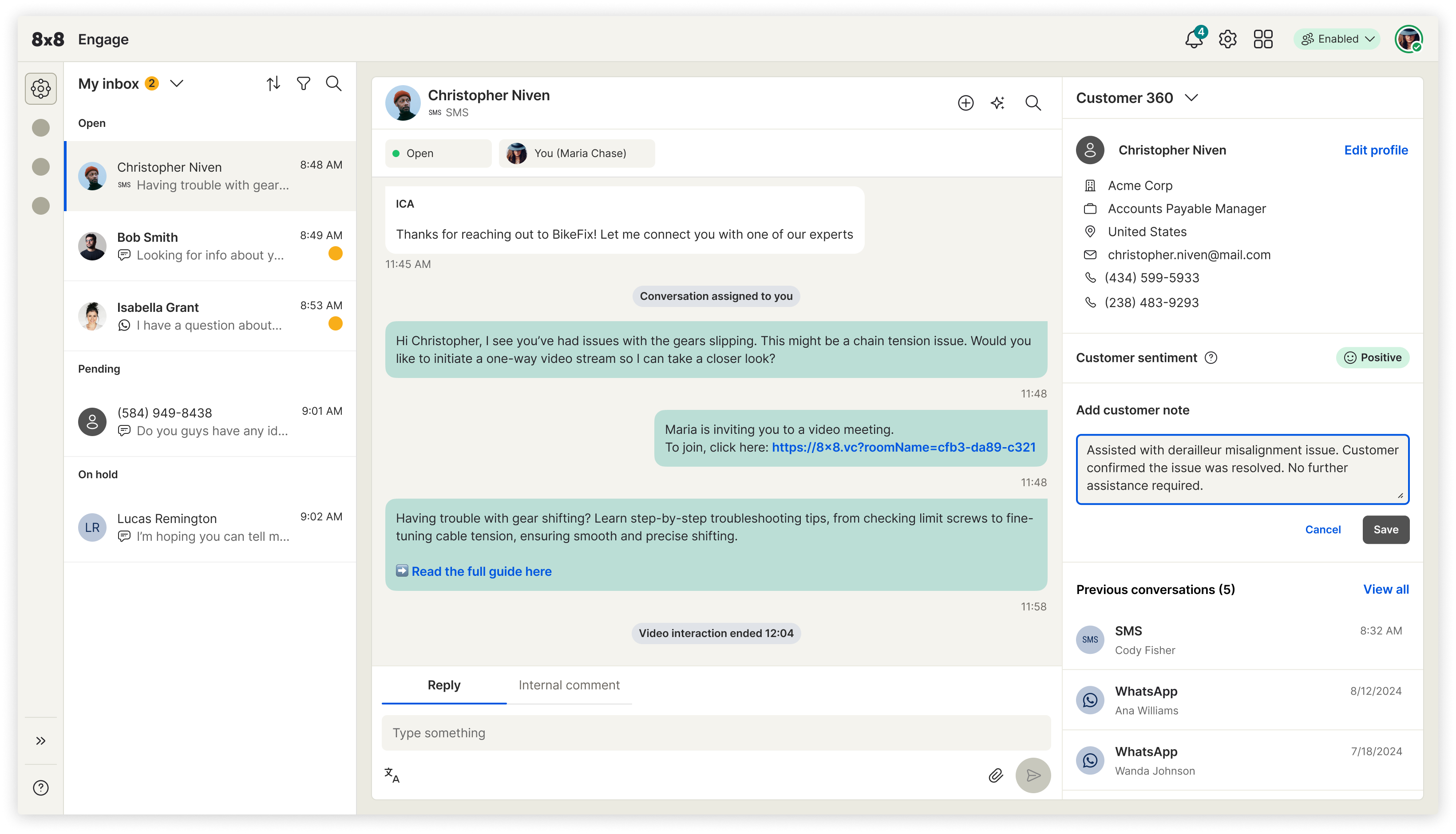 Engage was built to close this gap by unifying conversations, context, routing, and collaboration in a single intuitive workspace. Messages from channels like SMS, WhatsApp, and chat appear in a unified inbox with full customer history, journey details, prior interactions, and team notes. Smart routing ensures the right expert or frontline worker receives the request, while real-time context and shared threads prevent information loss. A one-tap video escalation feature enables faster remote troubleshooting, especially for field-based scenarios.