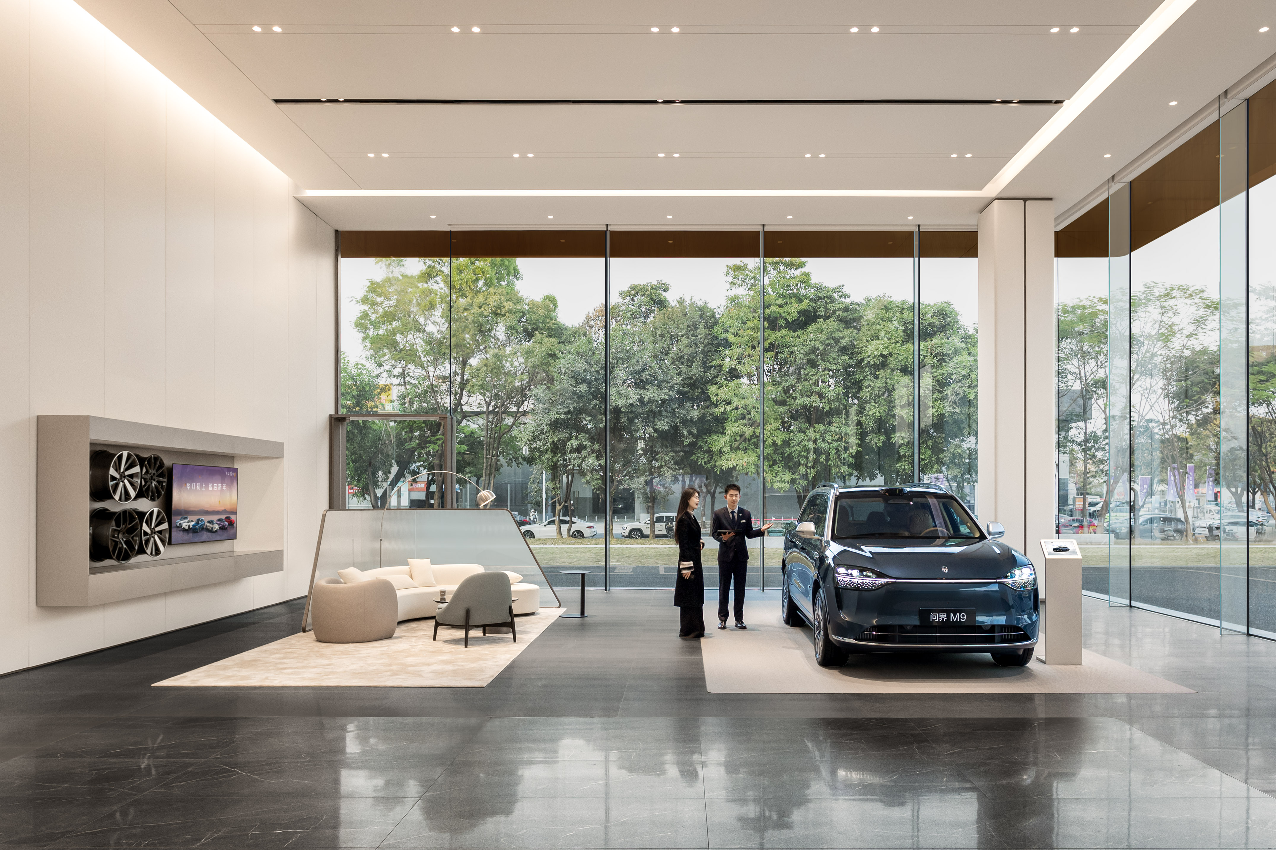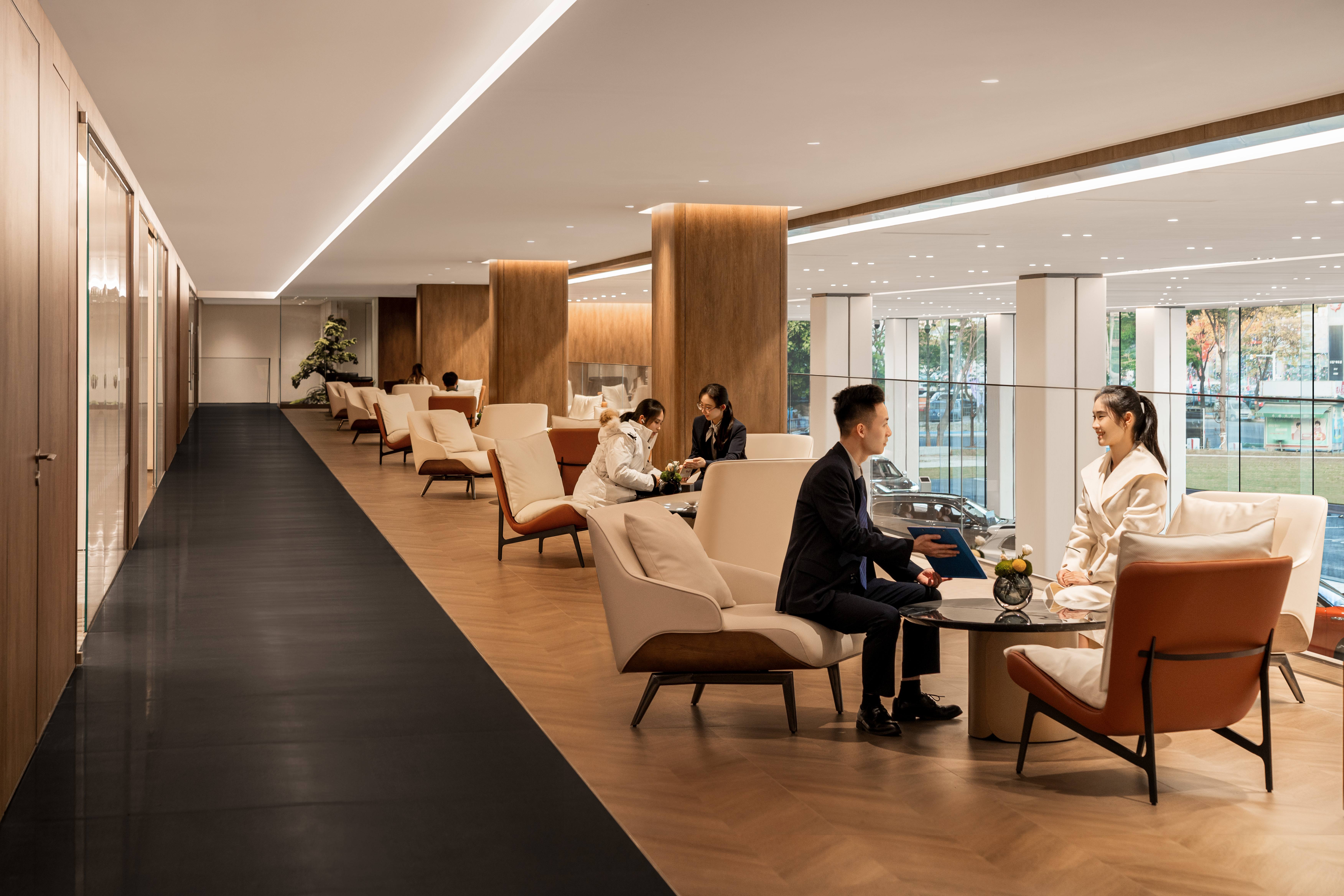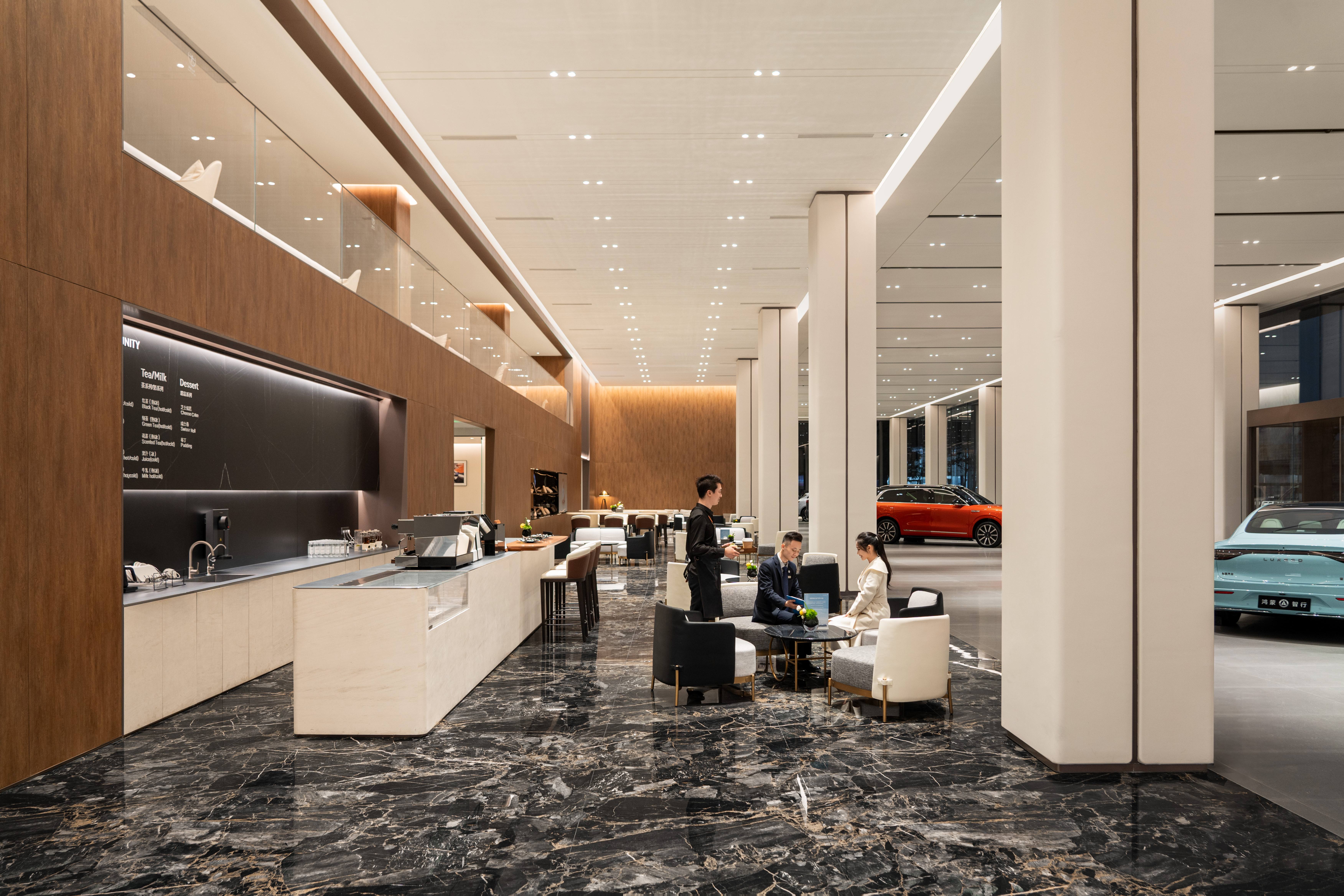 The Project takes “The Realm of Intelligent Mobility, Sensing the Future” as its core design concept, merging technological aesthetics with spatial artistry to create an immersive venue that integrates brand presentation, social experience, and futuristic mobility concepts. The building’s facade adopts a symmetrically organized two-section structure, with an ultra-thin floating canopy that conveys a sense of lightness and advanced technology. Delicate metallic lines break the monotony of traditional showrooms while providing both rain and sun protection. The column design draws inspiration from the Doric order of the Parthenon, reinterpreted through modern minimalism to express ceremonial grandeur and the beauty of structural power in a clean and pure form. At the heart of the exhibition hall lies the central vehicle display zone, where an enclosing sofa layout enhances both focus and intimacy, naturally directing attention toward the showcased vehicle. The lounge area combines materials such as solid wood, natural stone, and satin-finish paint to create a warm yet refined atmosphere. The coffee bar and counter design balance functionality and aesthetics, embodying the brand’s philosophy of harmony between technology and humanity. A mezzanine-level multifunctional salon space, equipped with high-quality audiovisual systems and flexible layouts, accommodates diverse event needs. Through the balanced interplay of proportion, material, and light, the overall design presents a futuristic environment that harmonizes rational order with emotional experience—reflecting the technological elegance and human warmth of the Harmony Intelligent Mobility brand.