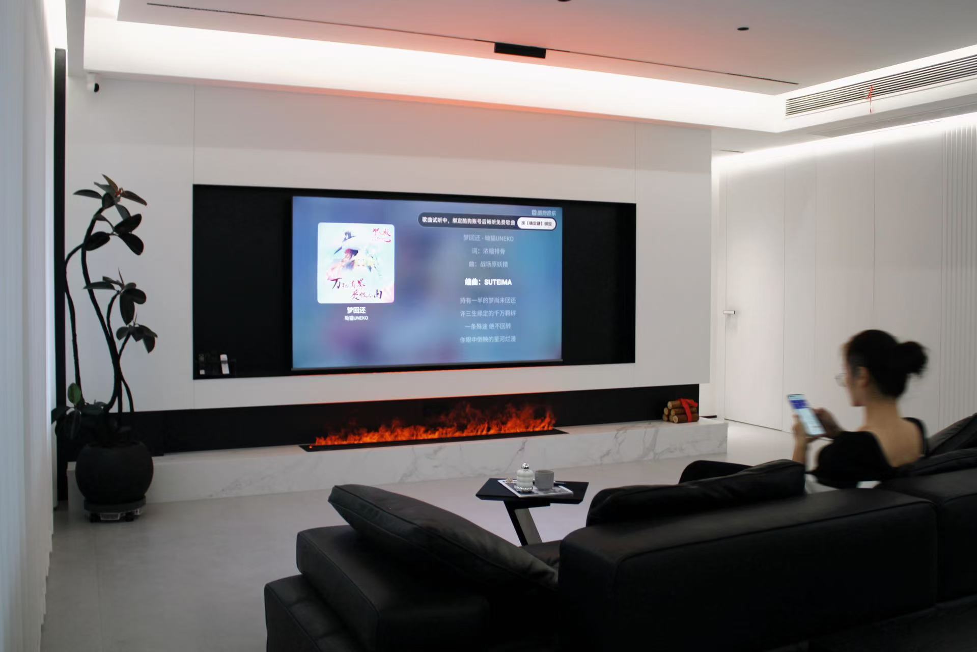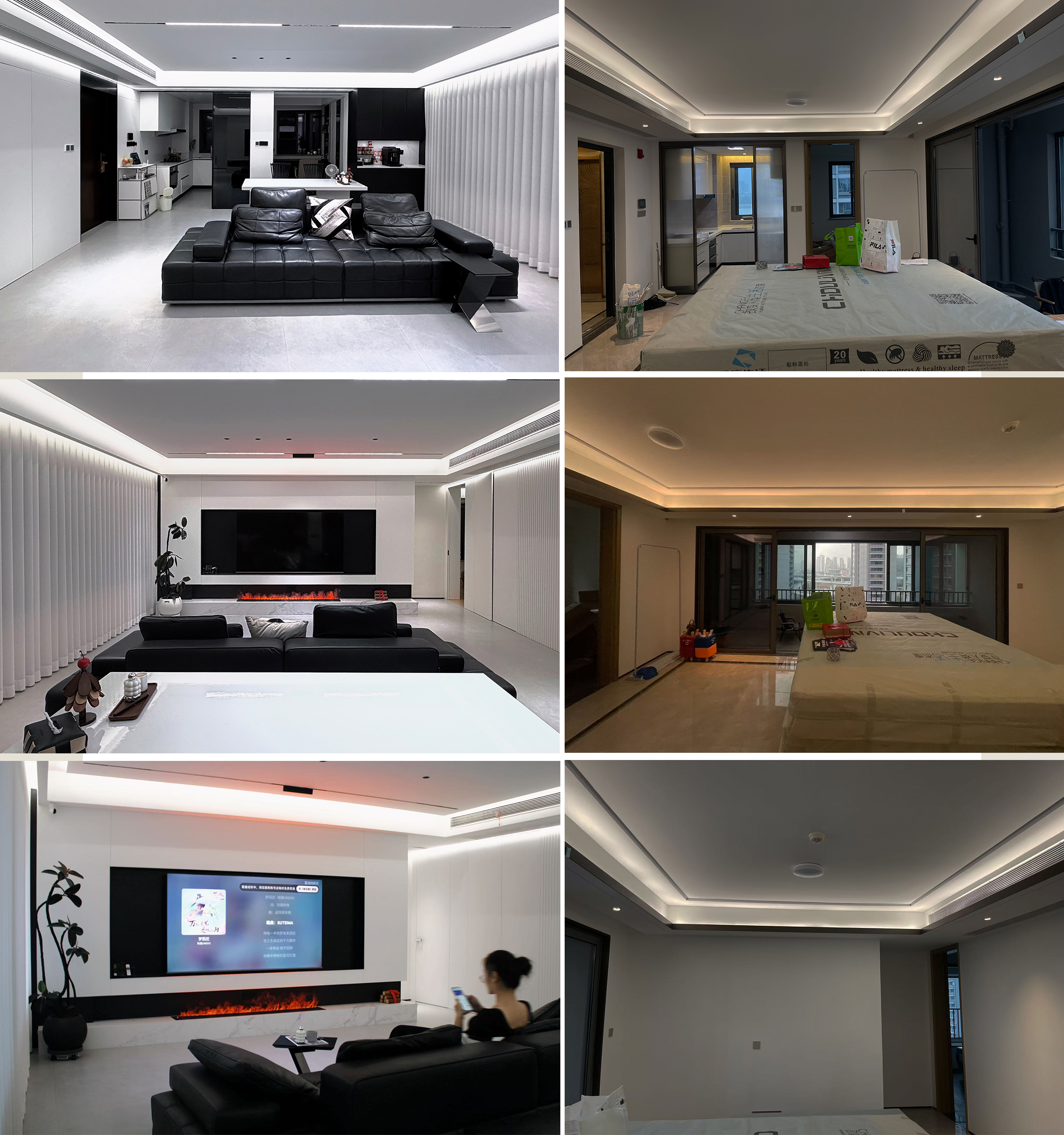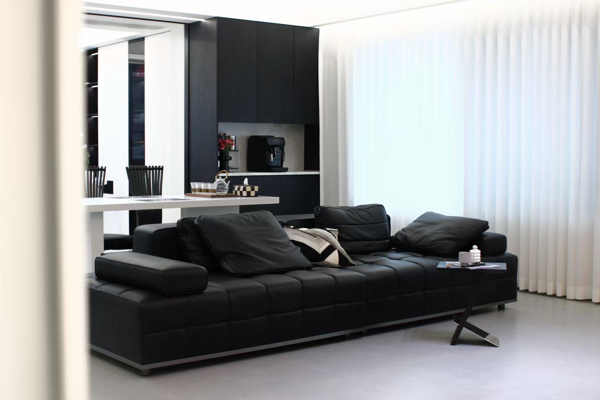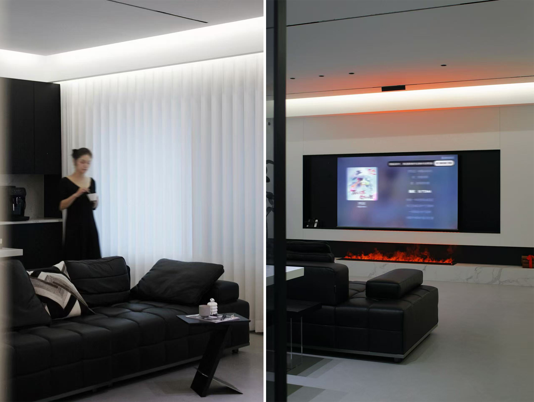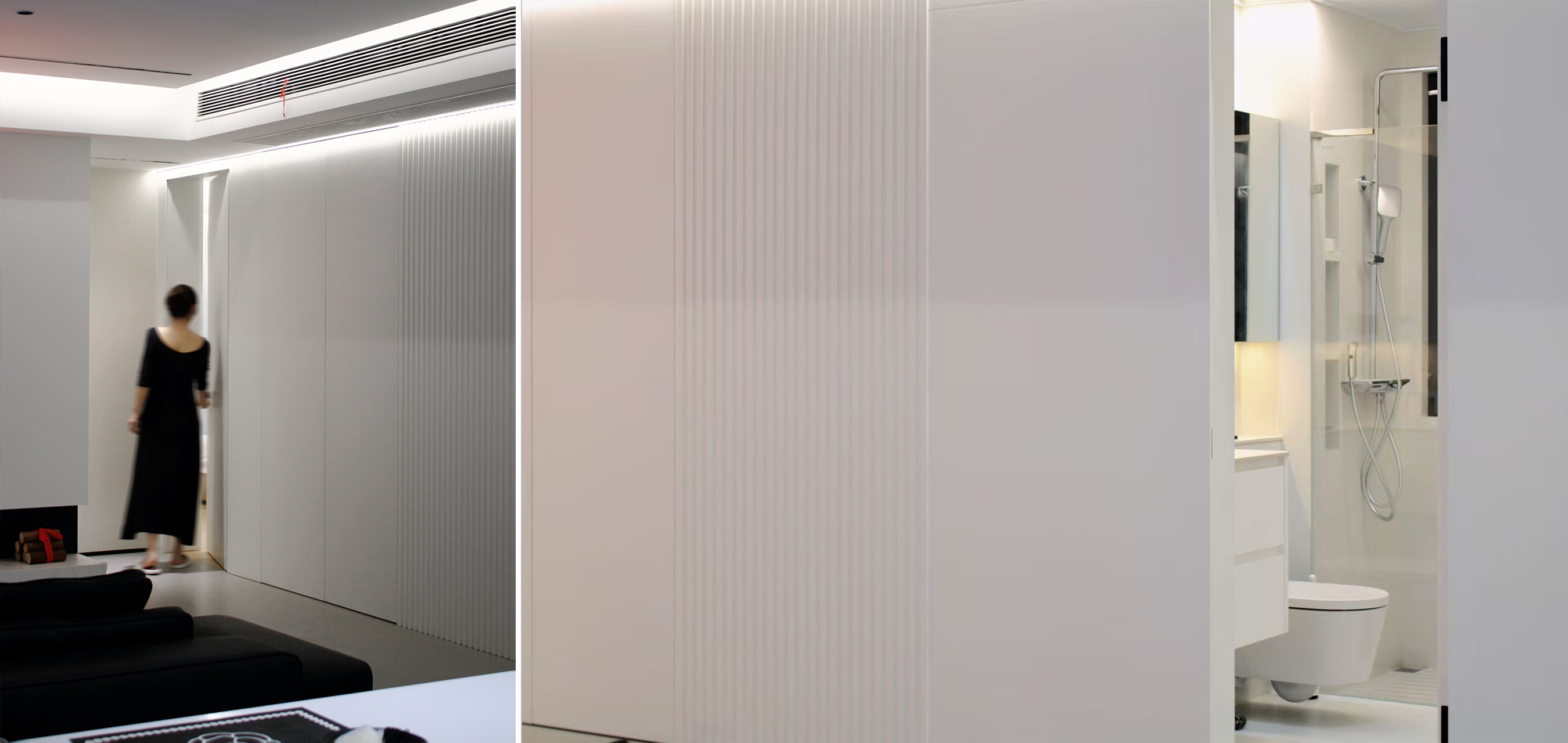 The master suite area was also thoroughly optimized: through subtle structural adjustments, a separate storage space was incorporated without compromising comfort, enabling highly efficient organization. In a particularly thoughtful touch, to strengthen the spatial unity and minimalist character, all doors located along one wall, including those to the master bedroom, storage room, and guest bathroom, were treated as concealed elements, seamlessly integrating into the pure white wall surface. This erasure of visual boundaries preserves an undisturbed sense of order, further highlighting the narrative tension and sophisticated texture of the black-and-white scheme. In the kitchen and study, a coordinated hidden door system allows flexible transition between functional zones, effectively expanding the diversity of usage scenarios and enhancing both adaptability and interactivity.