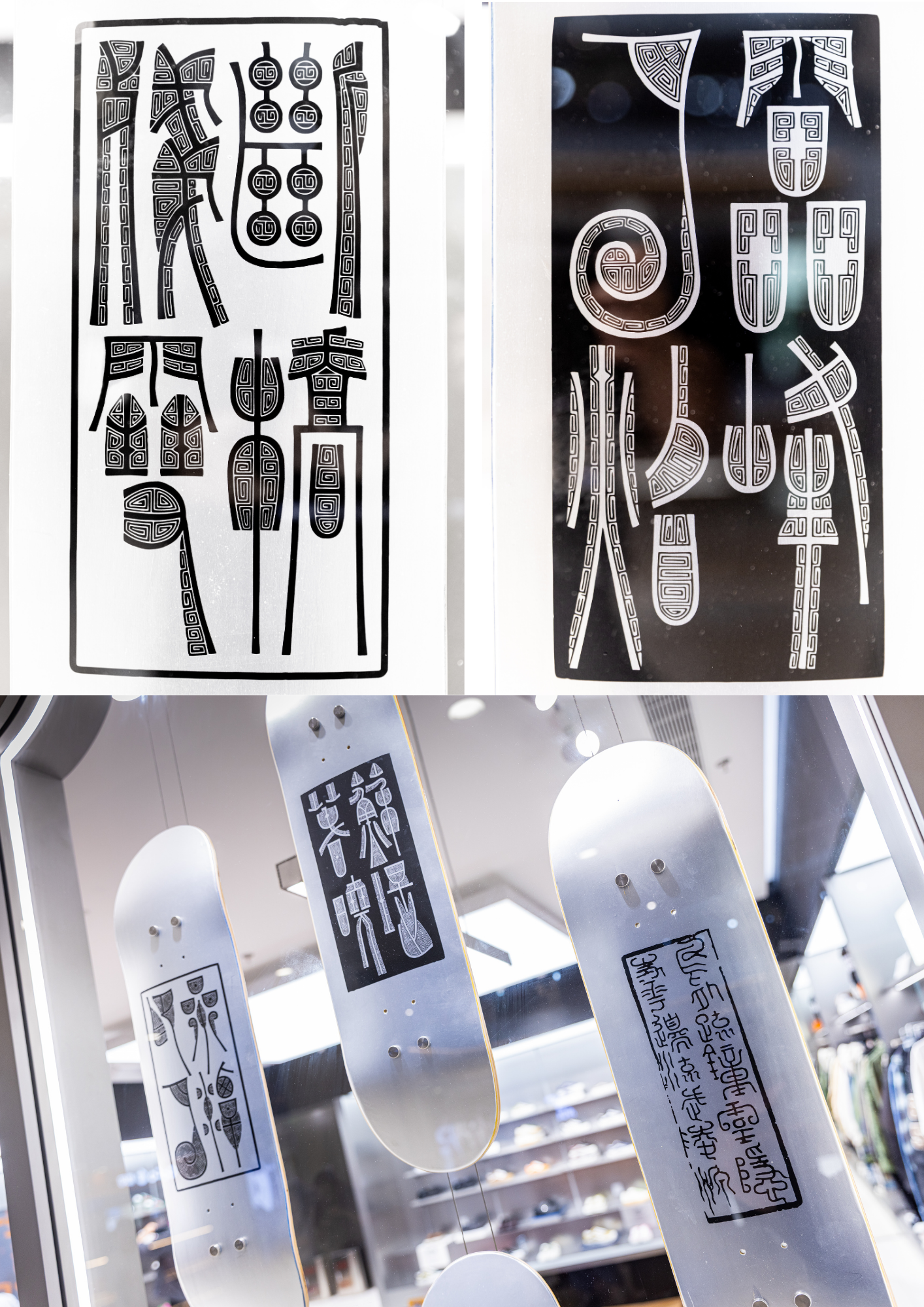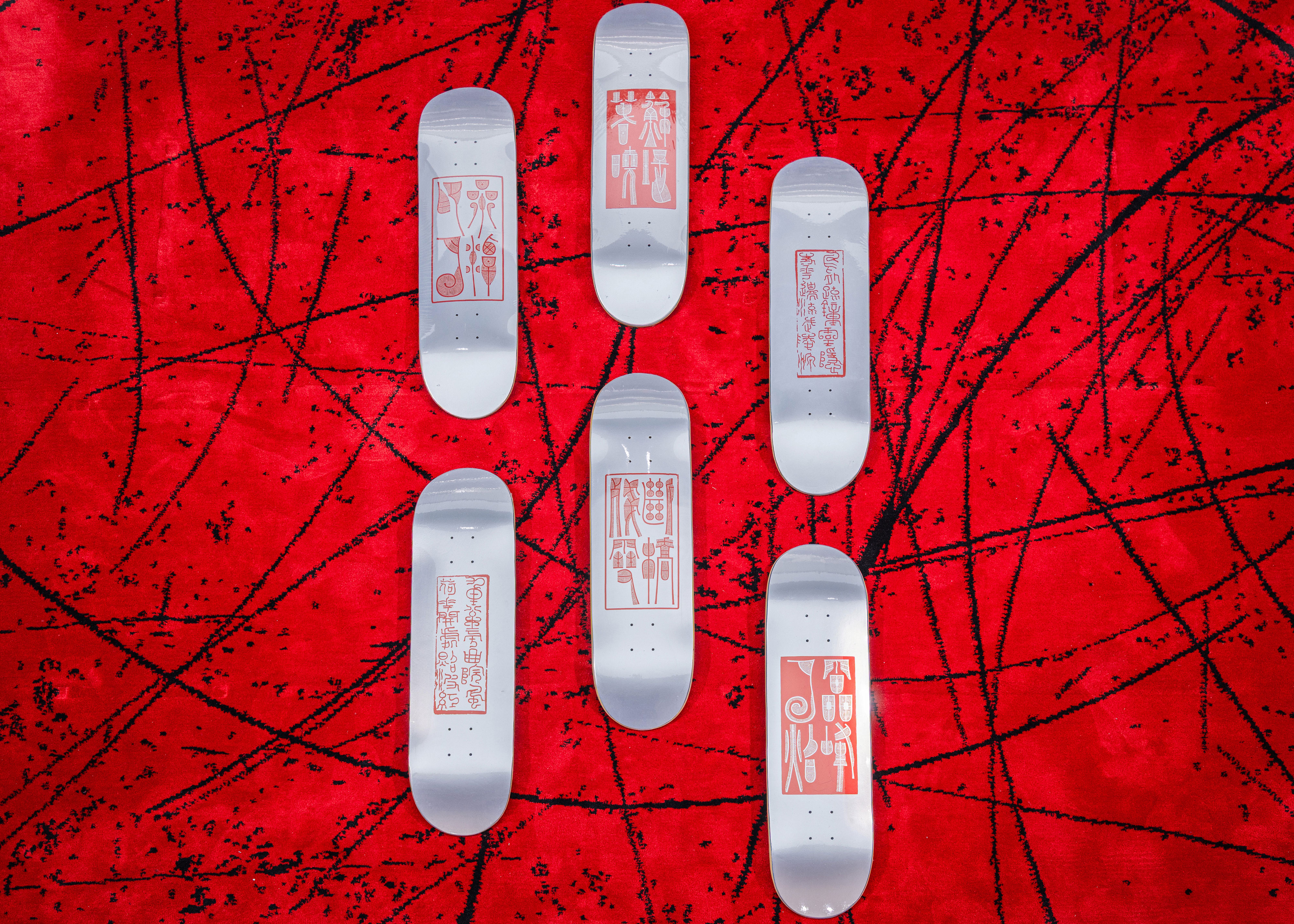 Artist Wang Kang combines motifs from Tang–Song official seals and the “Zhongshan King” seal script with iconic Hangzhou landmarks such as the “Five Views of West Lake” and “Lingyin Temple”. These ancient fonts and symbolic landscapes are carved onto the back of skateboards, grounding street culture in Hangzhou with a delicate touch.