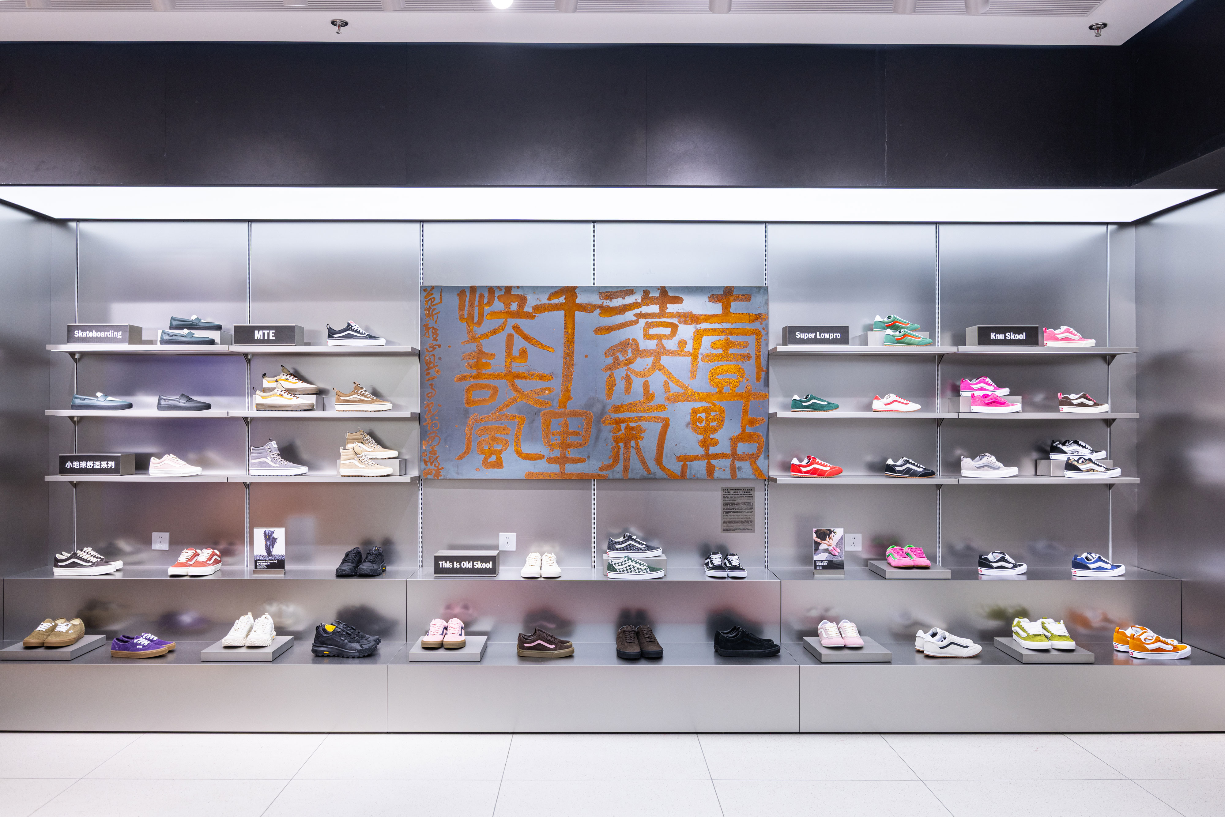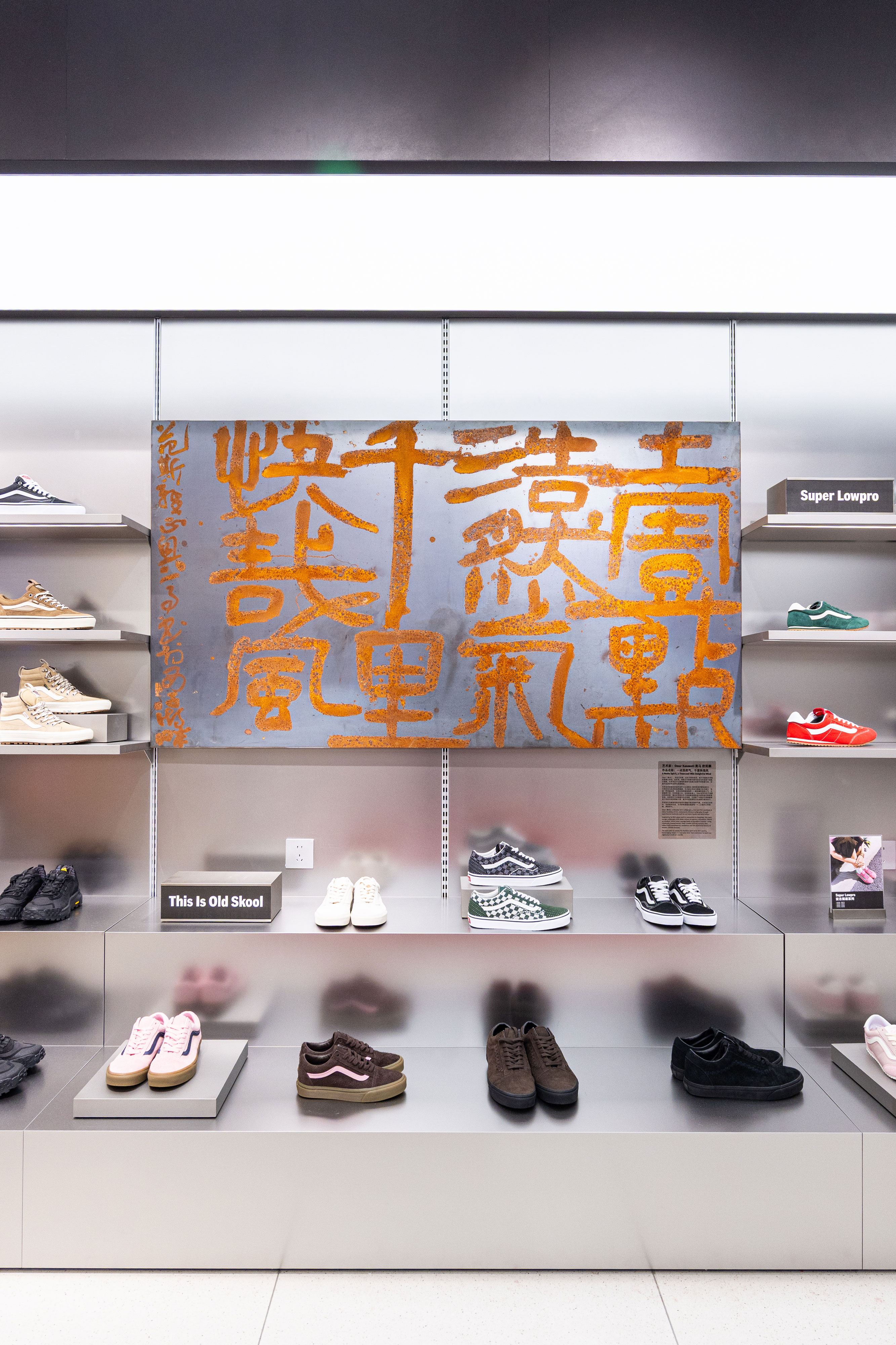 On the walls, Omar Kanawati’s metal-etched artwork interprets Su Shi’s verse, “A breath of vast integrity sends forth winds across a thousand miles.” The piece evokes the primal, rugged texture of bronze vessels and mirrors the friction between metal and concrete found in skate culture—an embodiment of Vans’“Off the Wall” spirit. Through the weight of Hangzhou’s history, the work channels the courage to push forward and break free.