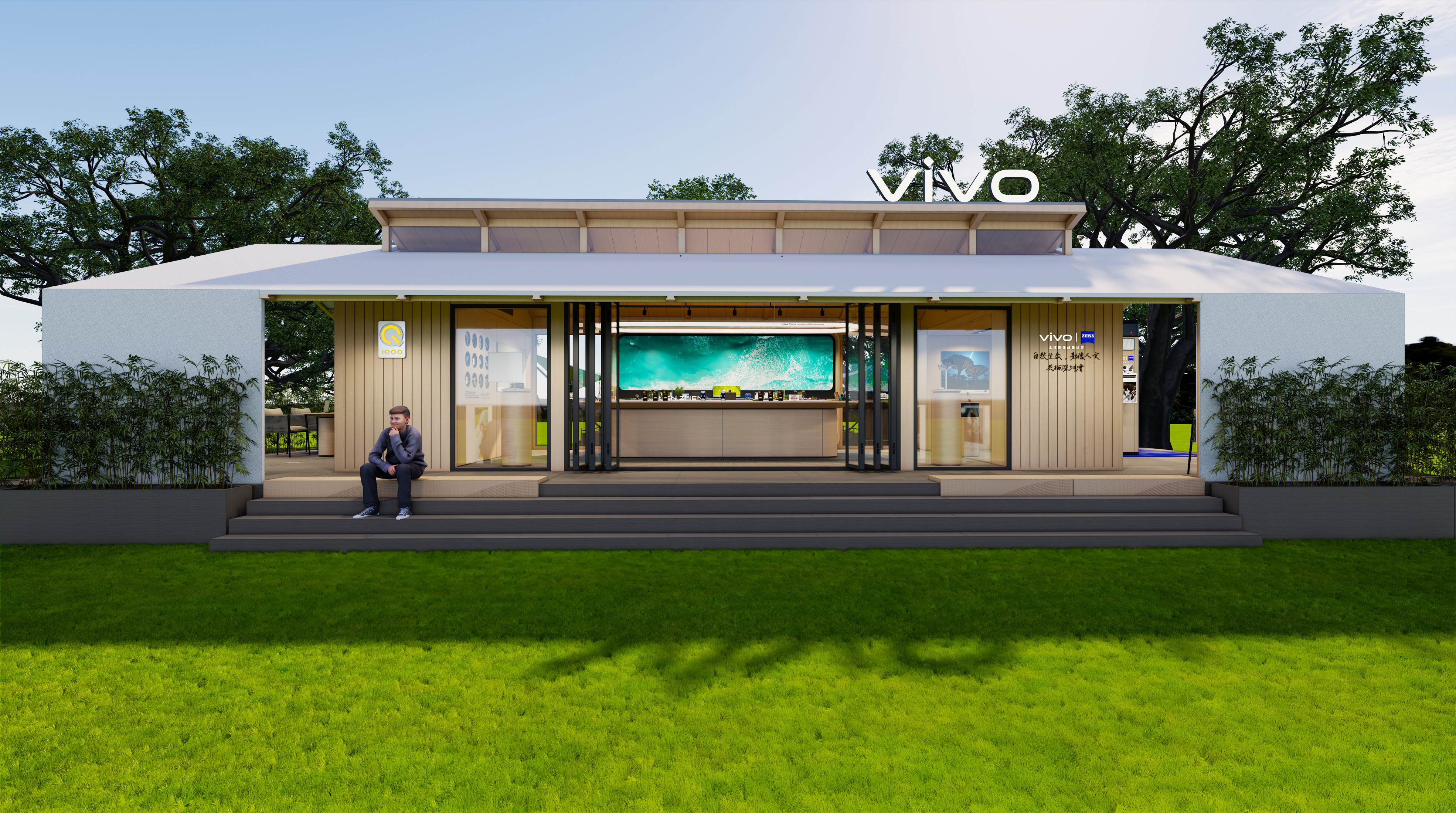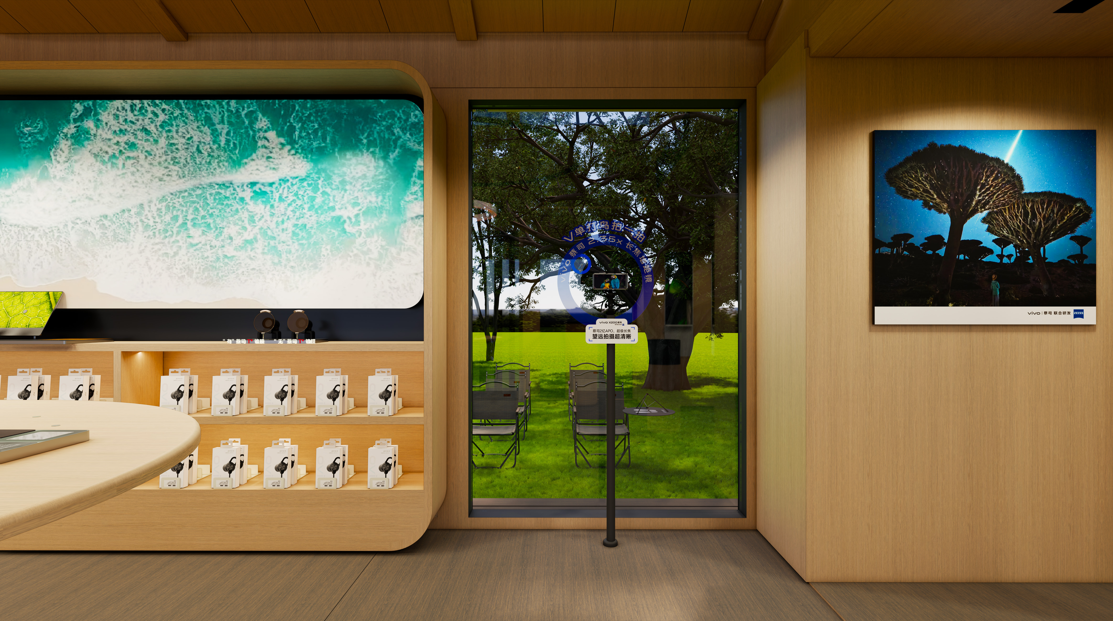 The design inspiration stems from the distinctive mangrove and migratory bird ecology of Shenzhen Bay. Employing a modern, flexible architectural structure and a natural color palette, the project achieves harmonious coexistence between buildings and environments. The interior space centers around a 4.5-meter customized experience counter, combining miniature seascapes and screen interactions to create a distinctive Shenzhen-style photography context. It sequentially features a ZEISS T* coating technology display, a "Night Scene Ecology Tank" for experiencing animal macro and starry night photography, and an MR virtual reality experience, forming a multi-layered image exploration journey. The outdoor area is flexibly adapted for activities such as imaging exhibitions, thematic lectures, and camping movie screenings, highlighting spatial versatility and free scene transition.