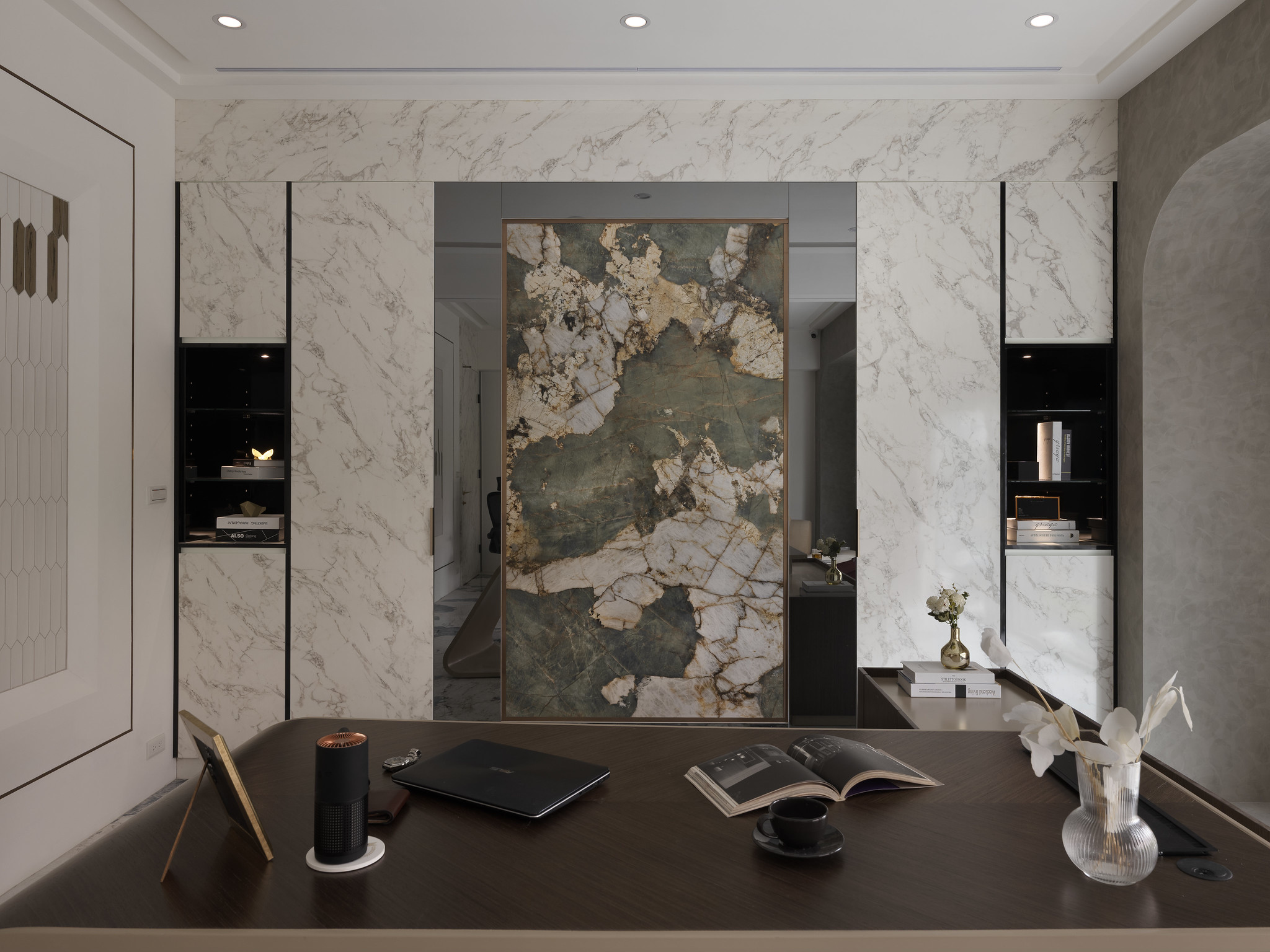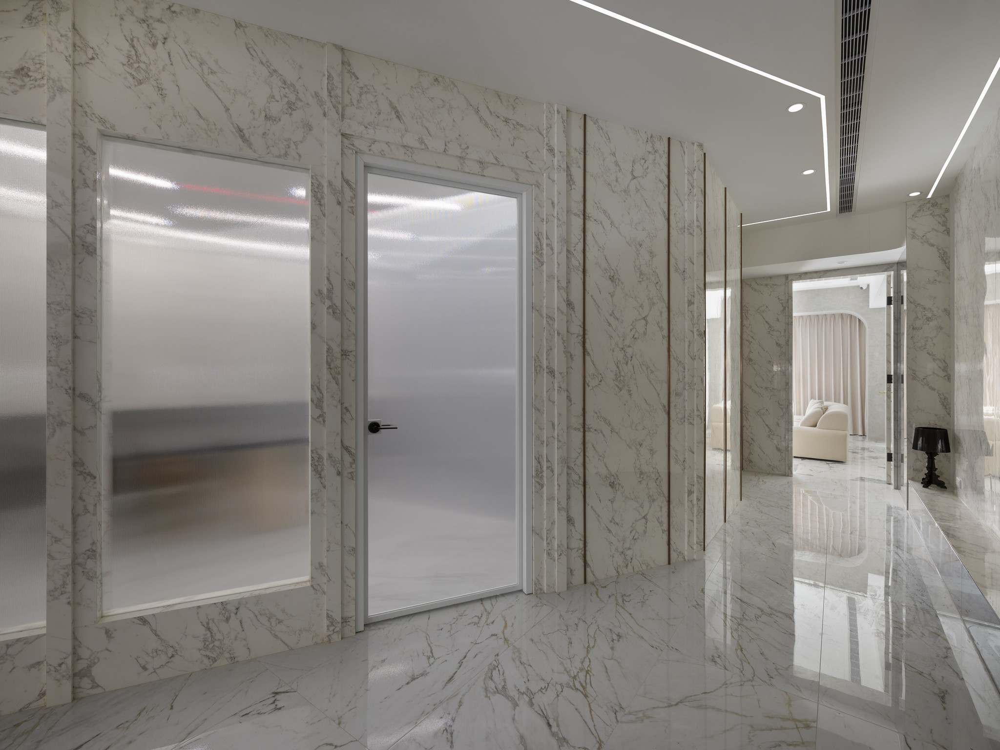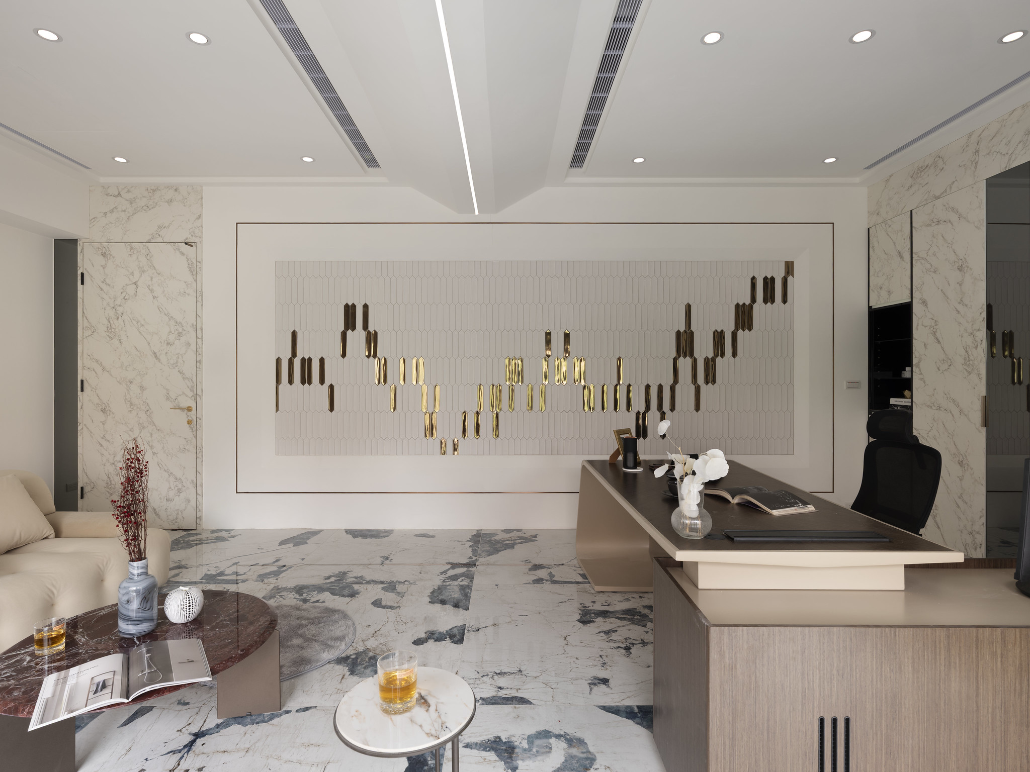 The client's preference for light colors and stone inspired the designer to incorporate elements and techniques such as marble and gold accents in the public areas. Bright and bold colors served as the base tone, complemented by stone and furniture decorations, and the introduction of sunlight and greenery, giving the space a refined, elegant, and comfortable charm.