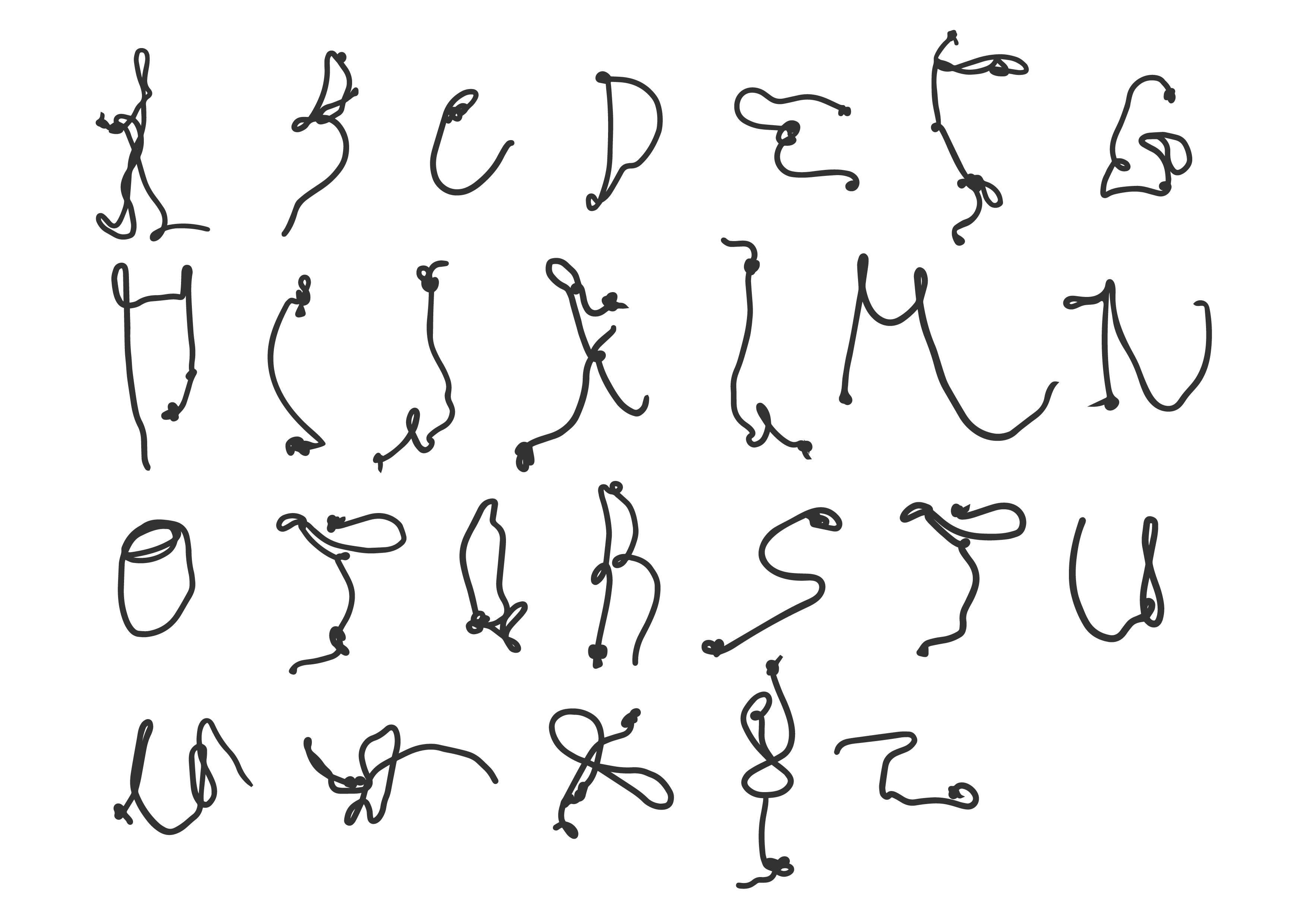 The alphabet is derived from the physical gestures of drying each letter shaped by a throw, a pull, a knot, or a moment of slack in the rope.