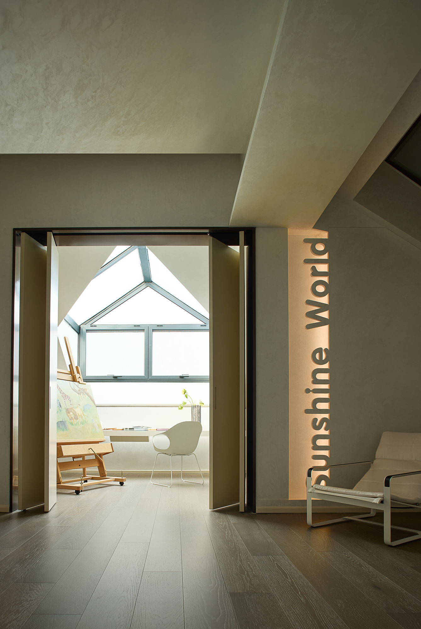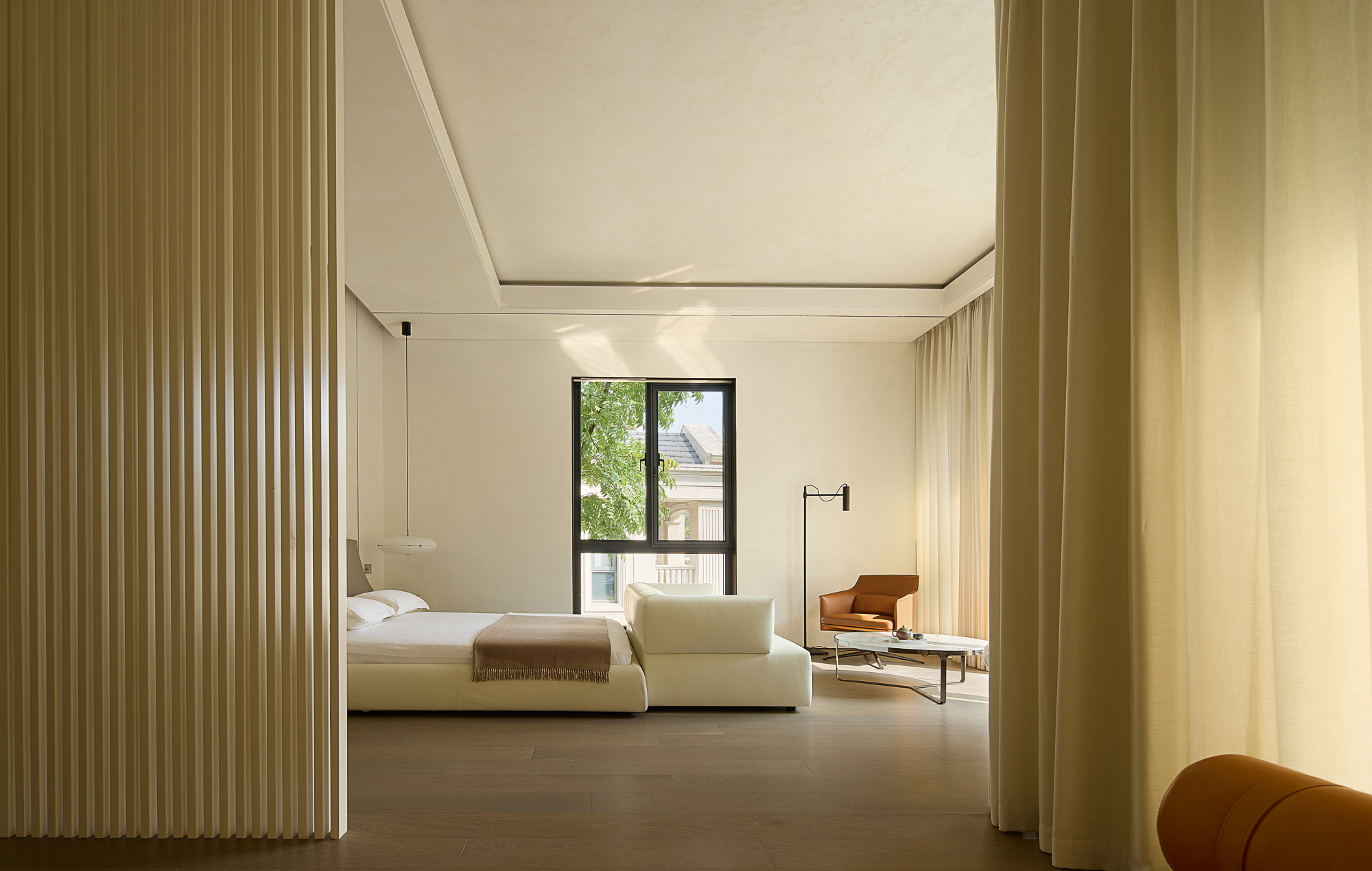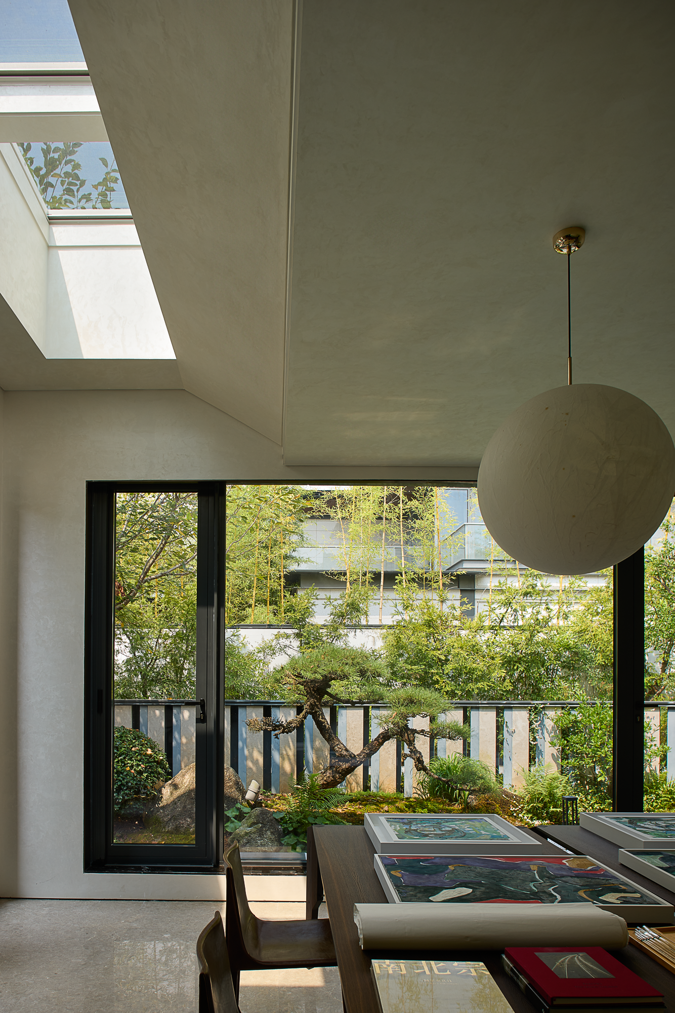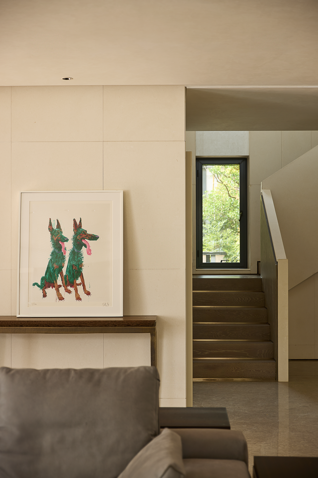 In the quiet zone, the living room becomes the heart of family life, with softly curved fabric sofas paired with a dark wooden coffee table, and shelves holding art books and cherished memories. Full-height windows draw in daylight and frame the outdoor scenery. The master bedroom exudes calm elegance, where sunlight filters through sheer curtains onto the floor, and the bed and sofa, set on either side of wooden screens, balance intimacy with connection. Outside, pine trees compose a living scroll of shifting views. Ascending to the third floor, the studio nestles within greenery, where sunlight pours in to create a pure space where nature and art converge.