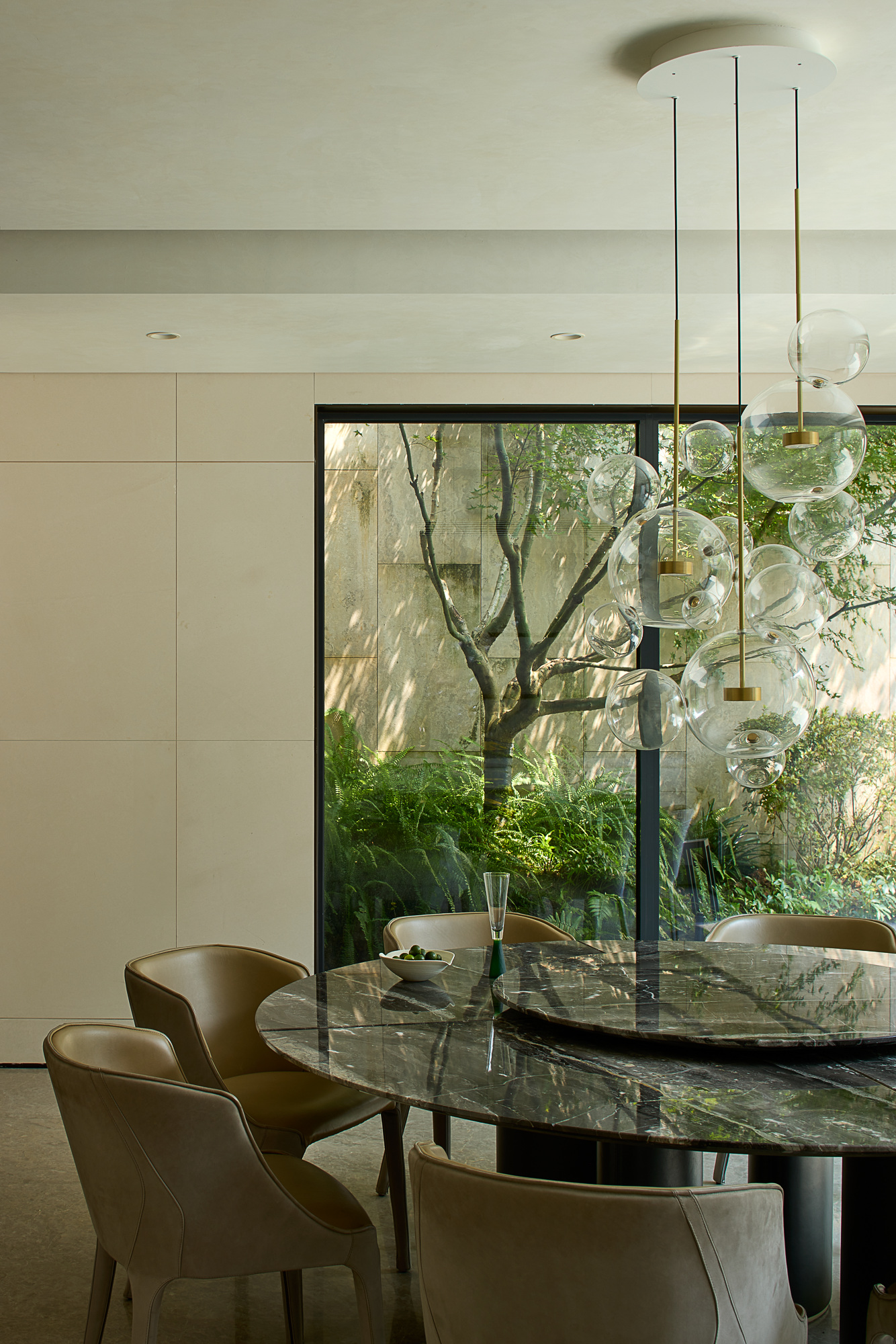 The design establishes a clear distinction between active and quiet zones. In the active zone, the dining room and kitchen are connected by fluid circulation, with a glass sliding door maintaining visual openness. Leather chairs encircle a round dining table beneath pendant lamps that diffuse a warm, ambient glow. The study is calm yet open, with wooden textures echoing one another and greenery outside offering inspiration. A corridor links public and private areas, where light plays across the walls and floor, drawing the eye toward a touch of greenery at its end.