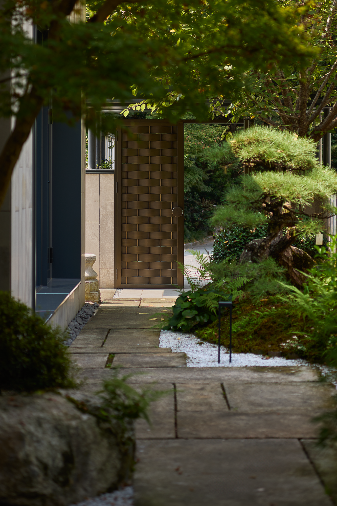 The courtyard gently bridges the architecture and its surroundings. A stone path winds like a stream, leading toward the private residence veiled by lush greenery. Beneath quiet pines, dappled light scatters across the ground in shifting patterns. Soft lighting subtly illuminates the garden, offering residents an immersive experience of nature.