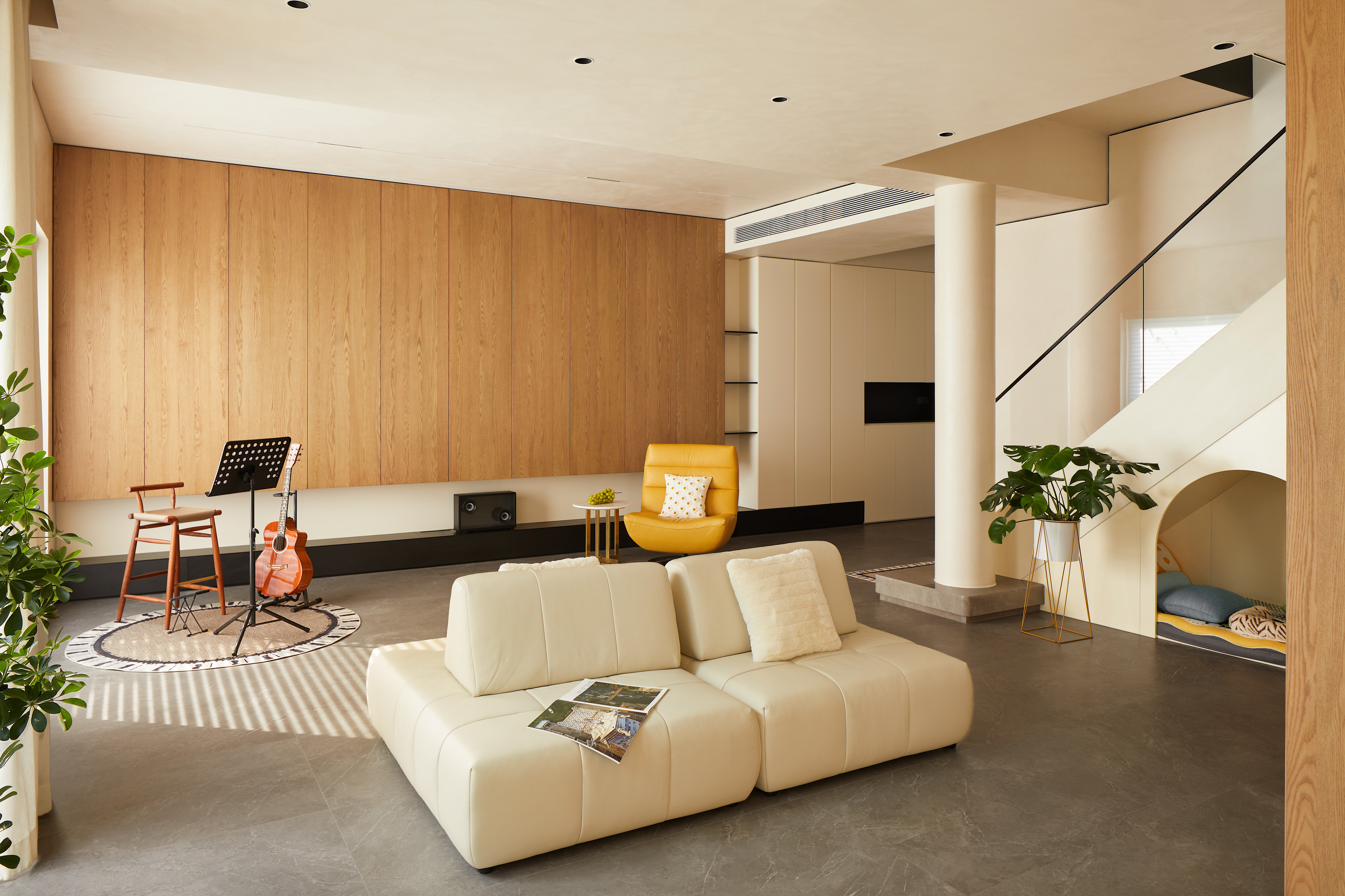 Sunlight filters through sheer curtains, casting dappled patterns across the deep gray floor—as if time itself slows in this space. A cloud-like modular sofa in warm ivory anchors the living area, cradling moments of togetherness; a single green cup on a golden side table quietly infuses the scene with life’s gentle warmth. To the left, a clean-lined staircase rises with glass railings that preserve visual flow, while wooden columns meet marble countertops, softly defining the open kitchen and dining zone. Greenery peeks through windows, while indoor plants thrive—nature and architecture merging seamlessly. Every detail, from tactile materiality to the choreography of light, tells a story of companionship, stillness, and belonging.