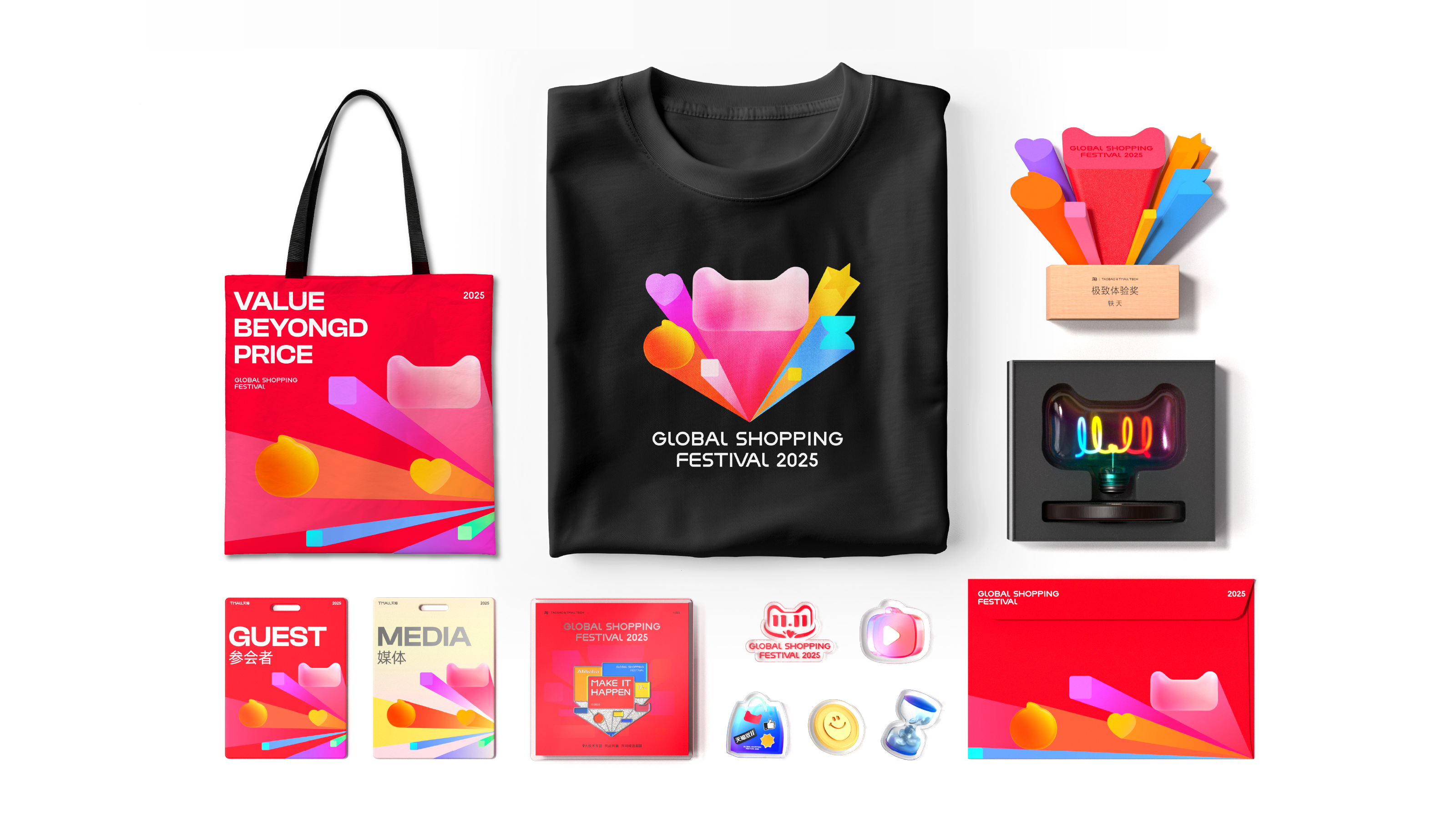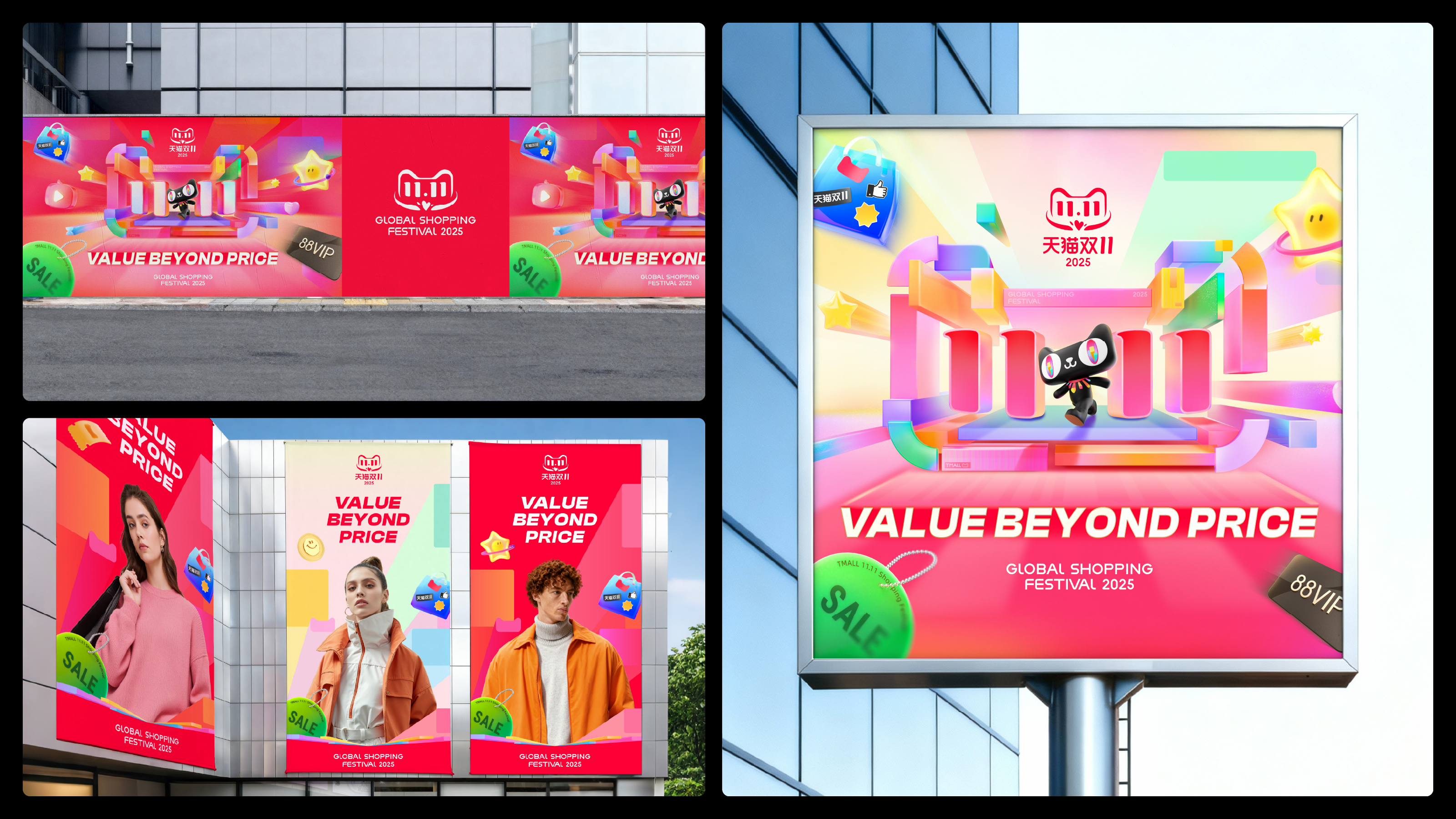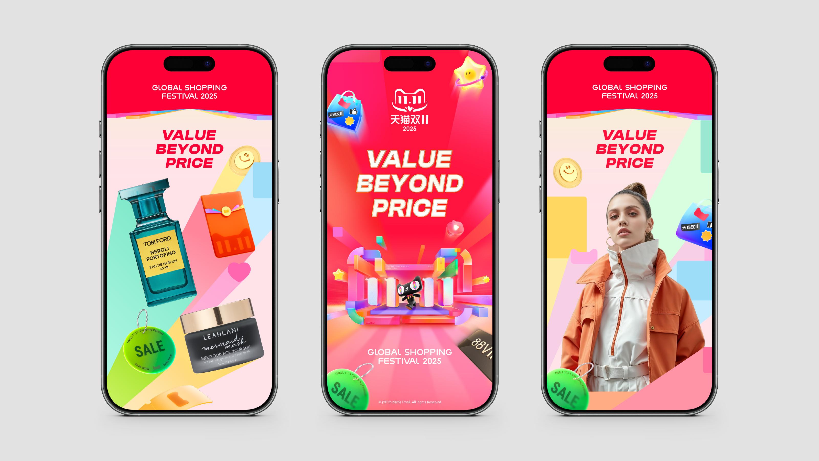 Amidst an increasingly competitive e-commerce landscape and growing consumer expectations of personalized, interactive, and high-quality shopping experiences, Tmall 2025 11.11 Global Shopping Festival carries a dual mission: to sustain brand influence while pushing creative boundaries. The key visual adopts an airy gradient style—light, dynamic, and layered—to align with the brand’s identity of “richness, transparency, and youthfulness.” In the foreground, semi-transparent elements such as a shopping bag and an 88VIP card radiate outward from the center, using a youthful design to create a festive shopping atmosphere. The red-dominated background, paired with multiple radiating color gradients, improves visual layering and hints at the infinite potential the brand unlocks.