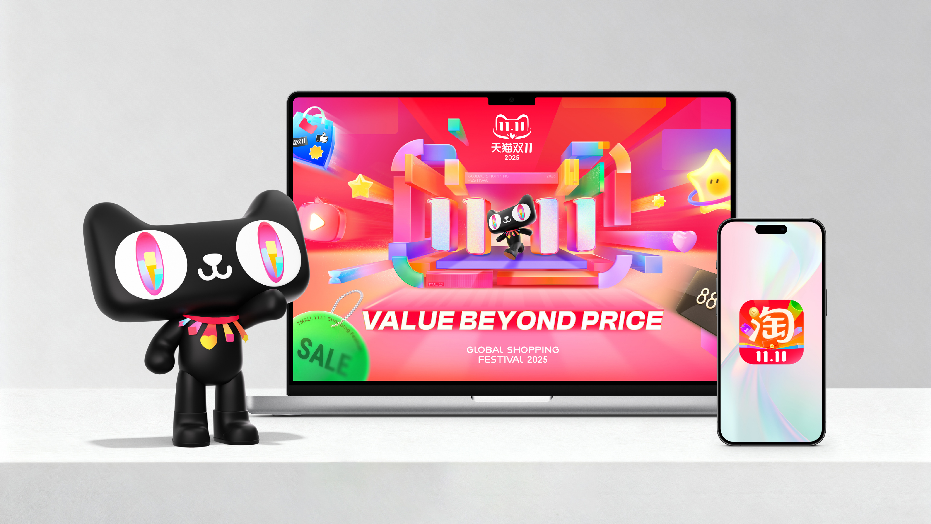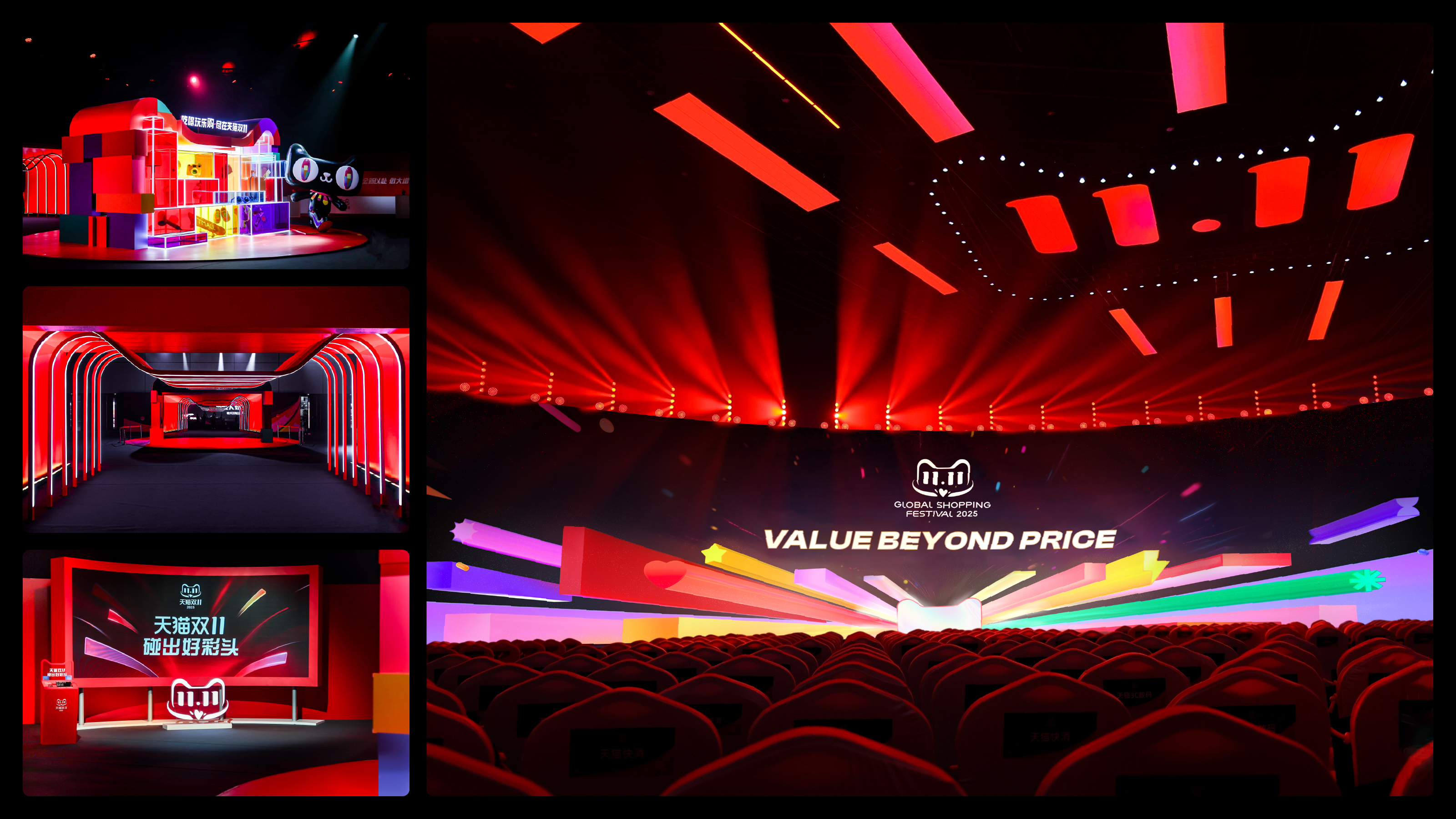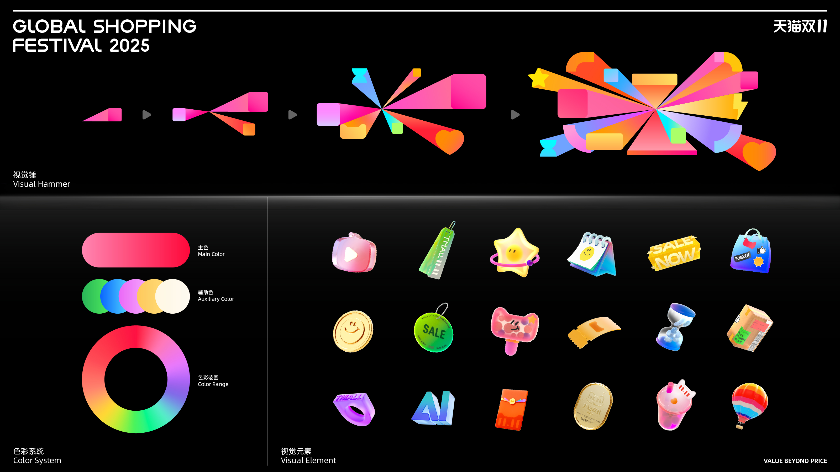 Amidst an increasingly competitive e-commerce landscape and growing consumer expectations of personalized, interactive, and high-quality shopping experiences, Tmall 2025 11.11 Global Shopping Festival carries a dual mission: to sustain brand influence while pushing creative boundaries. The key visual adopts an airy gradient style—light, dynamic, and layered—to align with the brand’s identity of “richness, transparency, and youthfulness.” In the foreground, semi-transparent elements such as a shopping bag and an 88VIP card radiate outward from the center, using a youthful design to create a festive shopping atmosphere. The red-dominated background, paired with multiple radiating color gradients, improves visual layering and hints at the infinite potential the brand unlocks.
