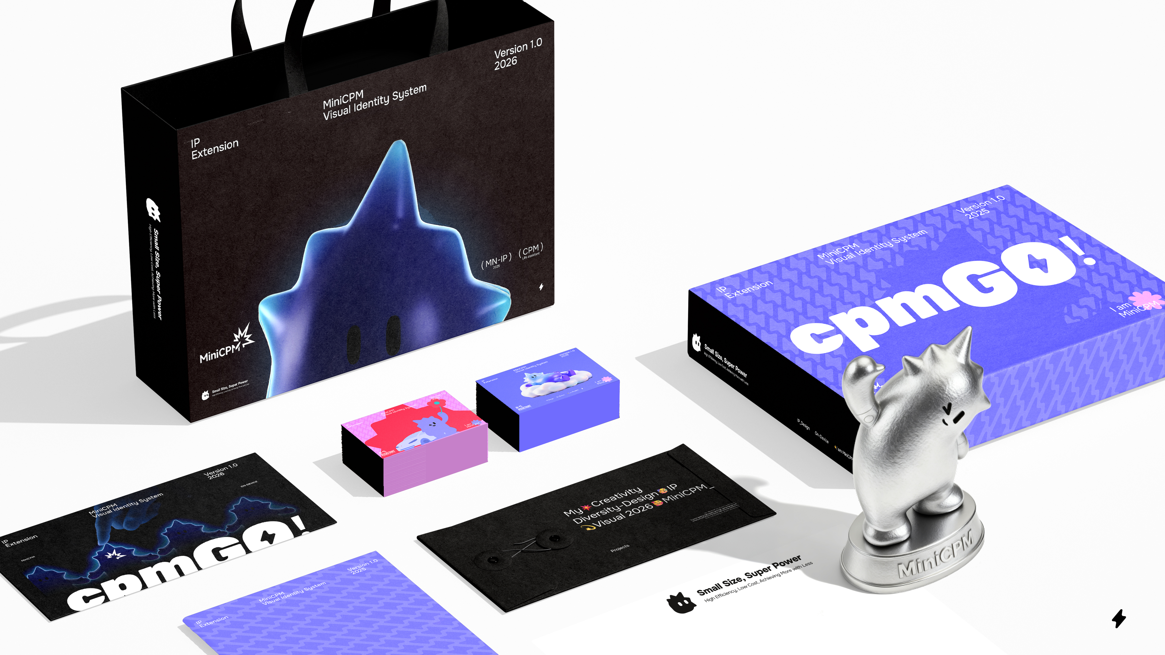 As the IP image designed by the end side AI model MiniCPM, the unique core visual feature of MiniCPM IP is the "intelligent energy explosion wave". The IP head inherits the iconic silhouette of the brand logo, with a smooth and rounded blue purple fluid body surrounded by dynamic energy ripples that spread outward from the center. These ripples naturally connect and light up minimalist icons representing various end devices such as smartphones, computers, cars, robots, etc., forming a core end side intelligent and empowering visual system for all things.