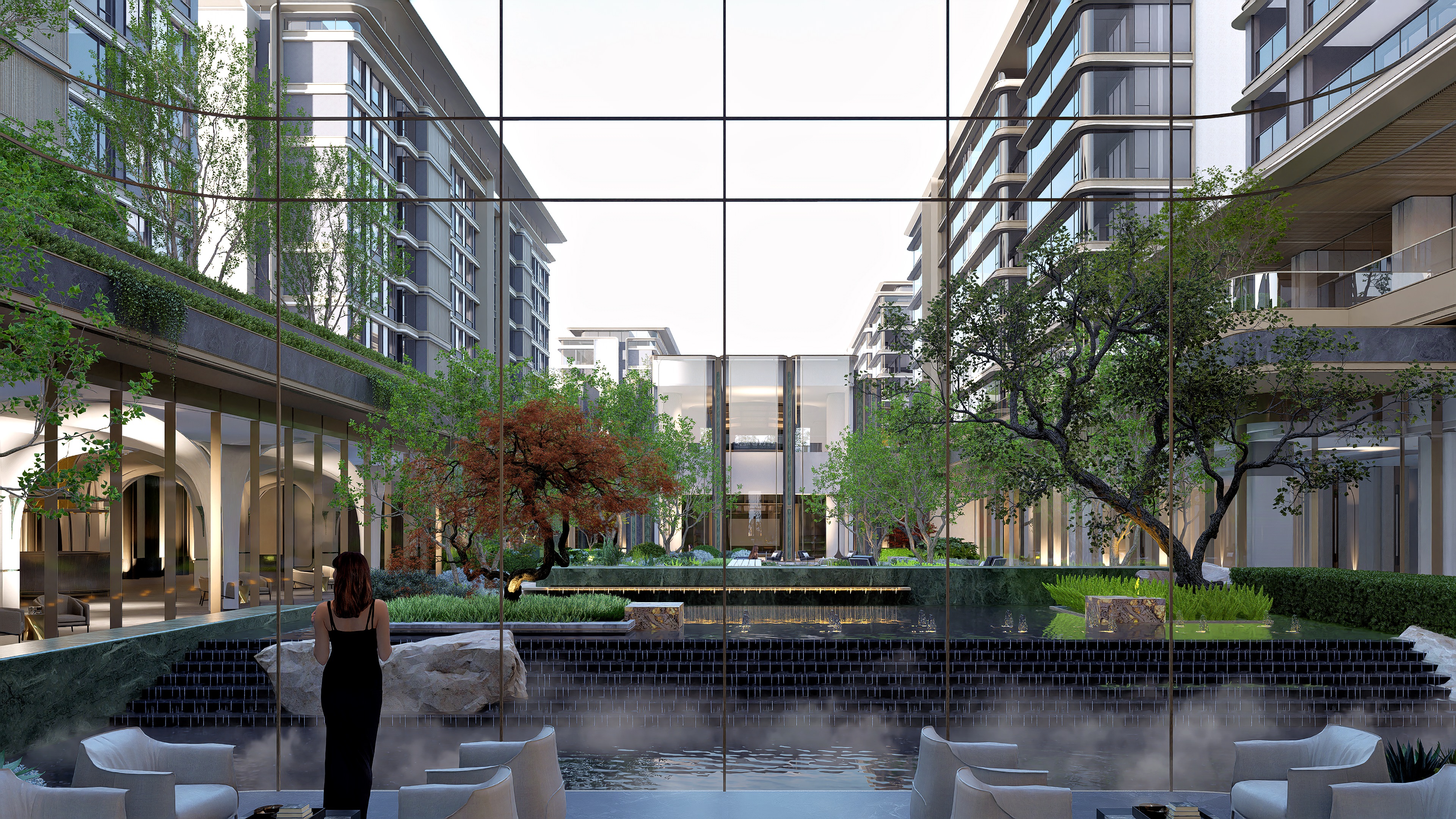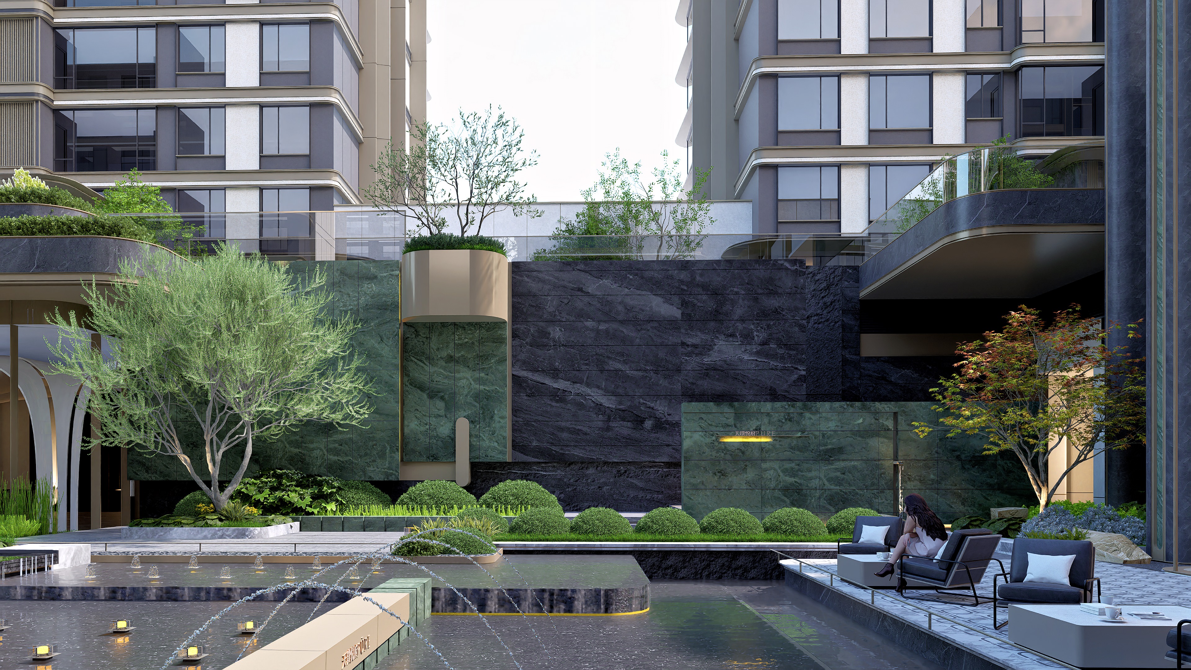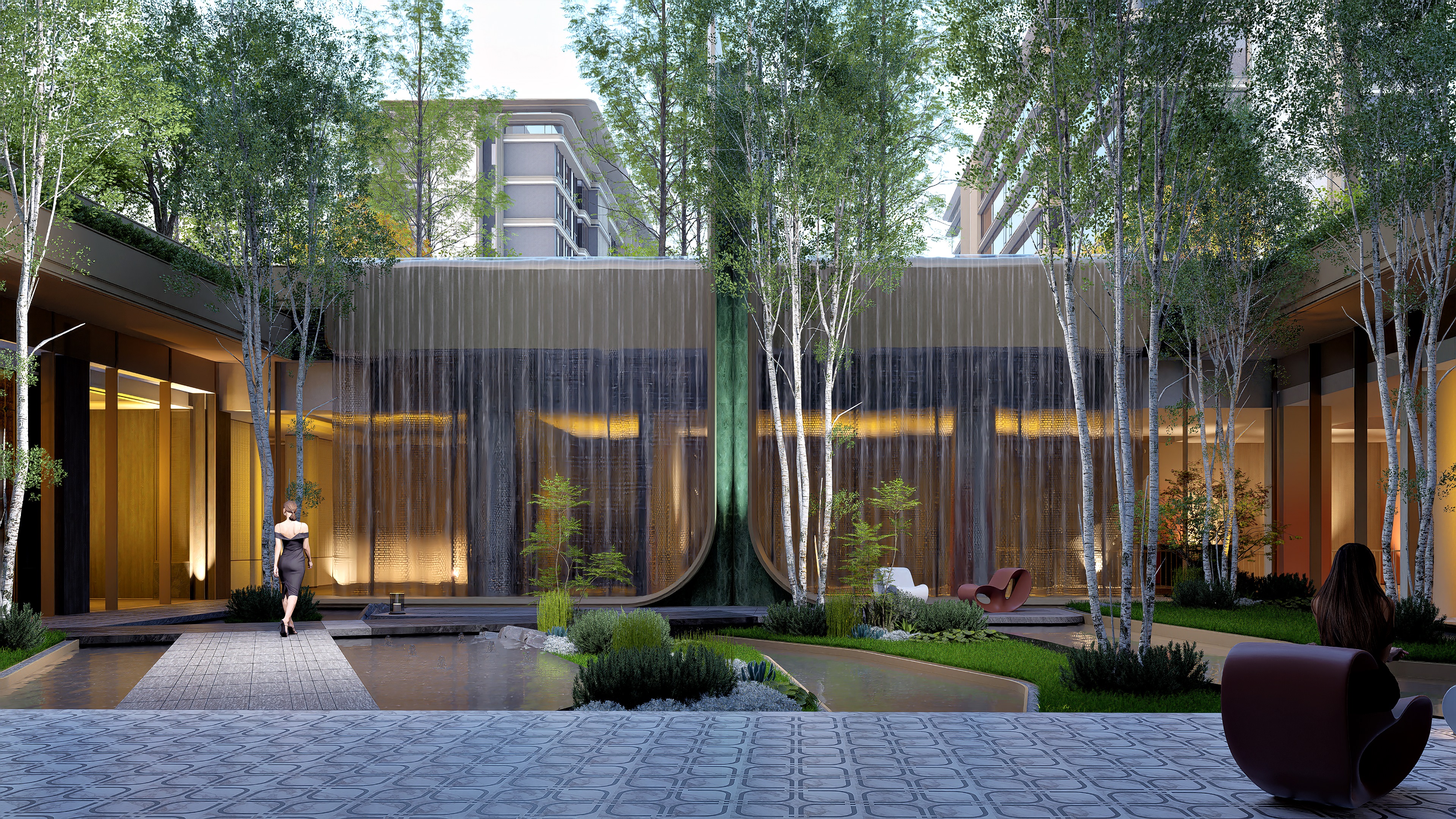The second courtyard focuses on an exquisite water garden, where the dynamic flow of cascading water curtains echoes the ripples on the water surface. The reflection of light and shadow reveals an elegant style, forming a rigid-soft complementary landscape rhythm with the first courtyard.