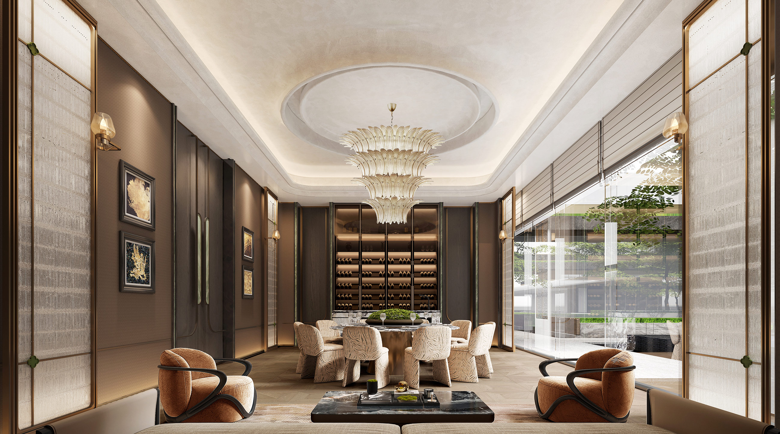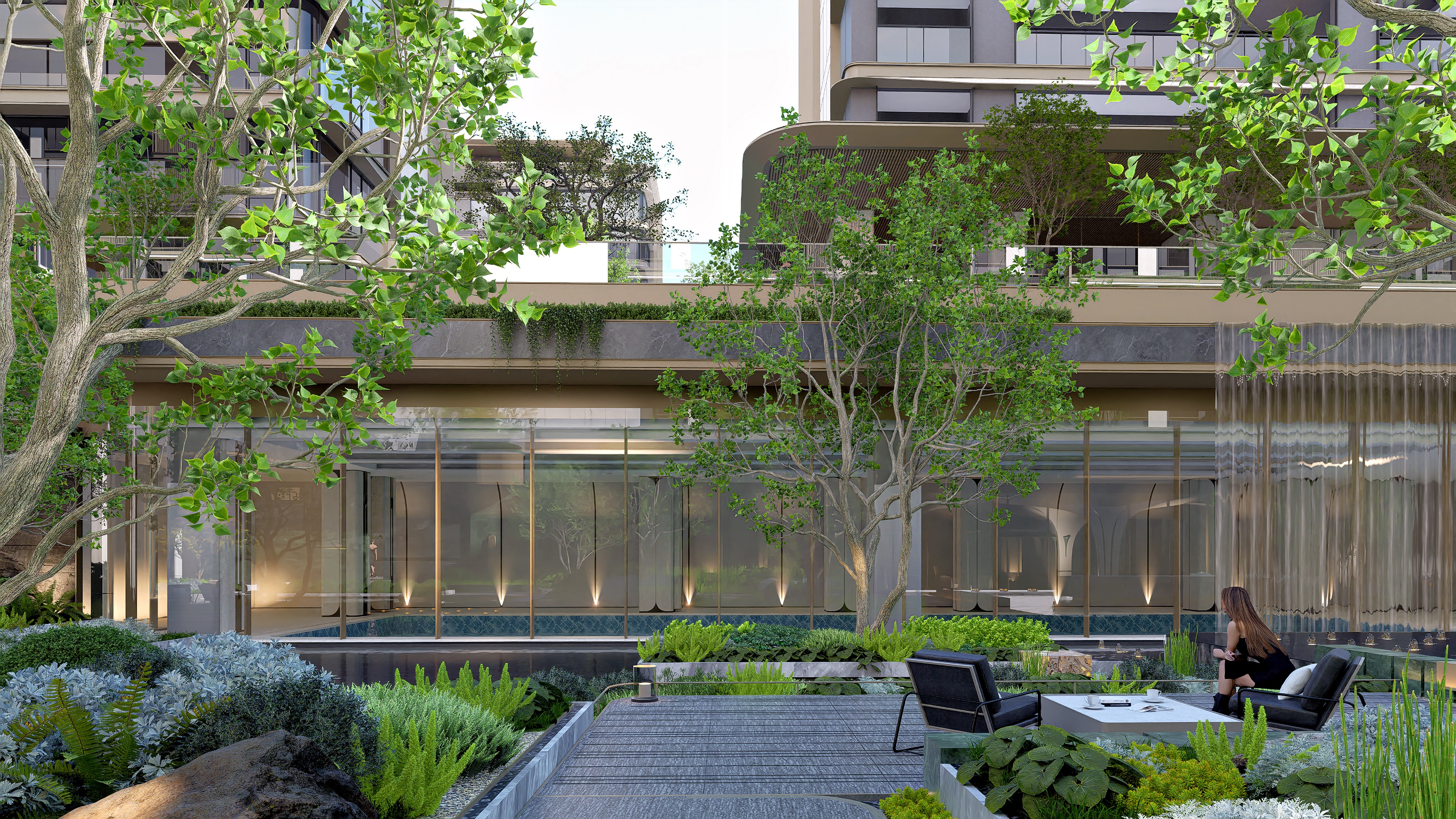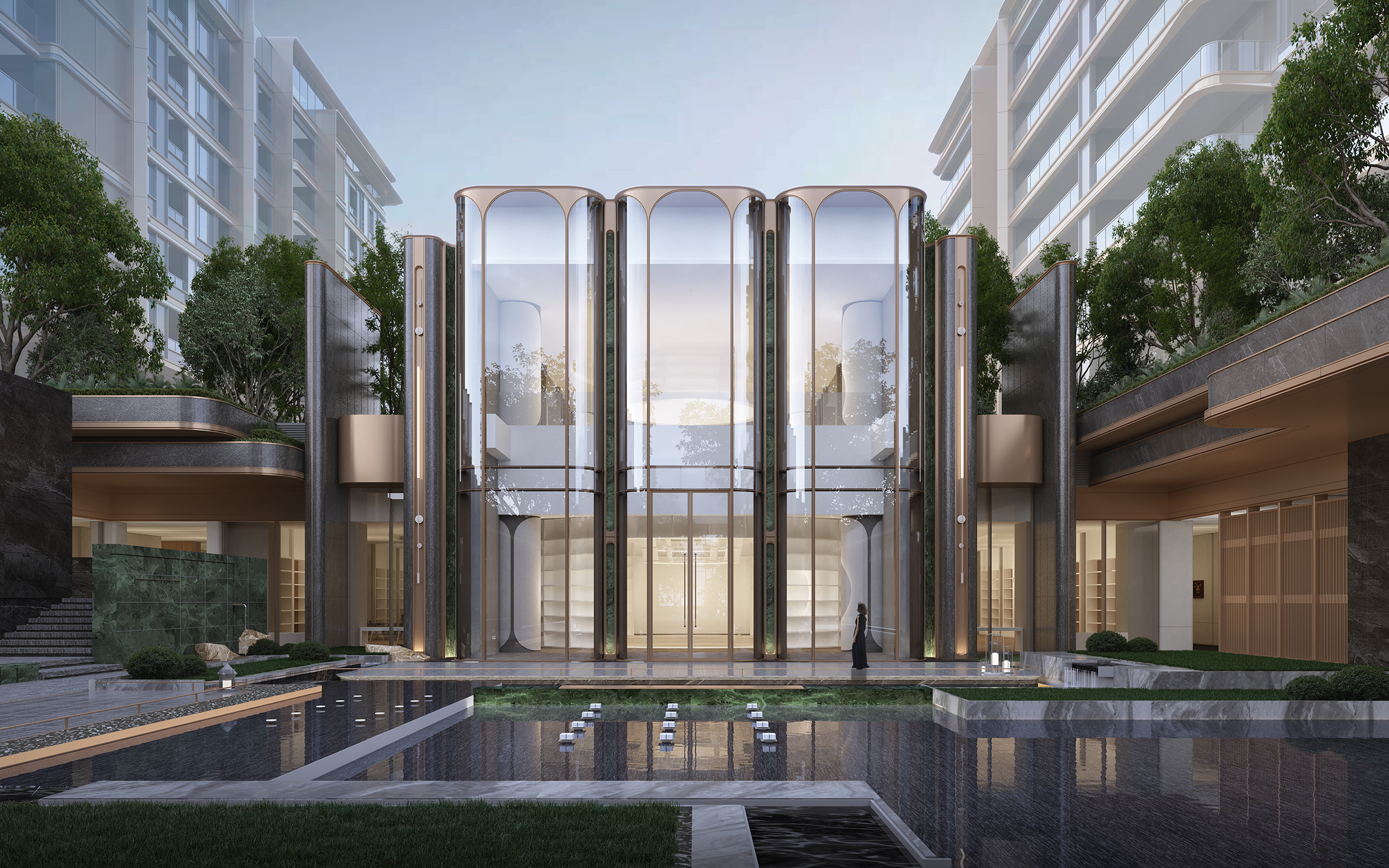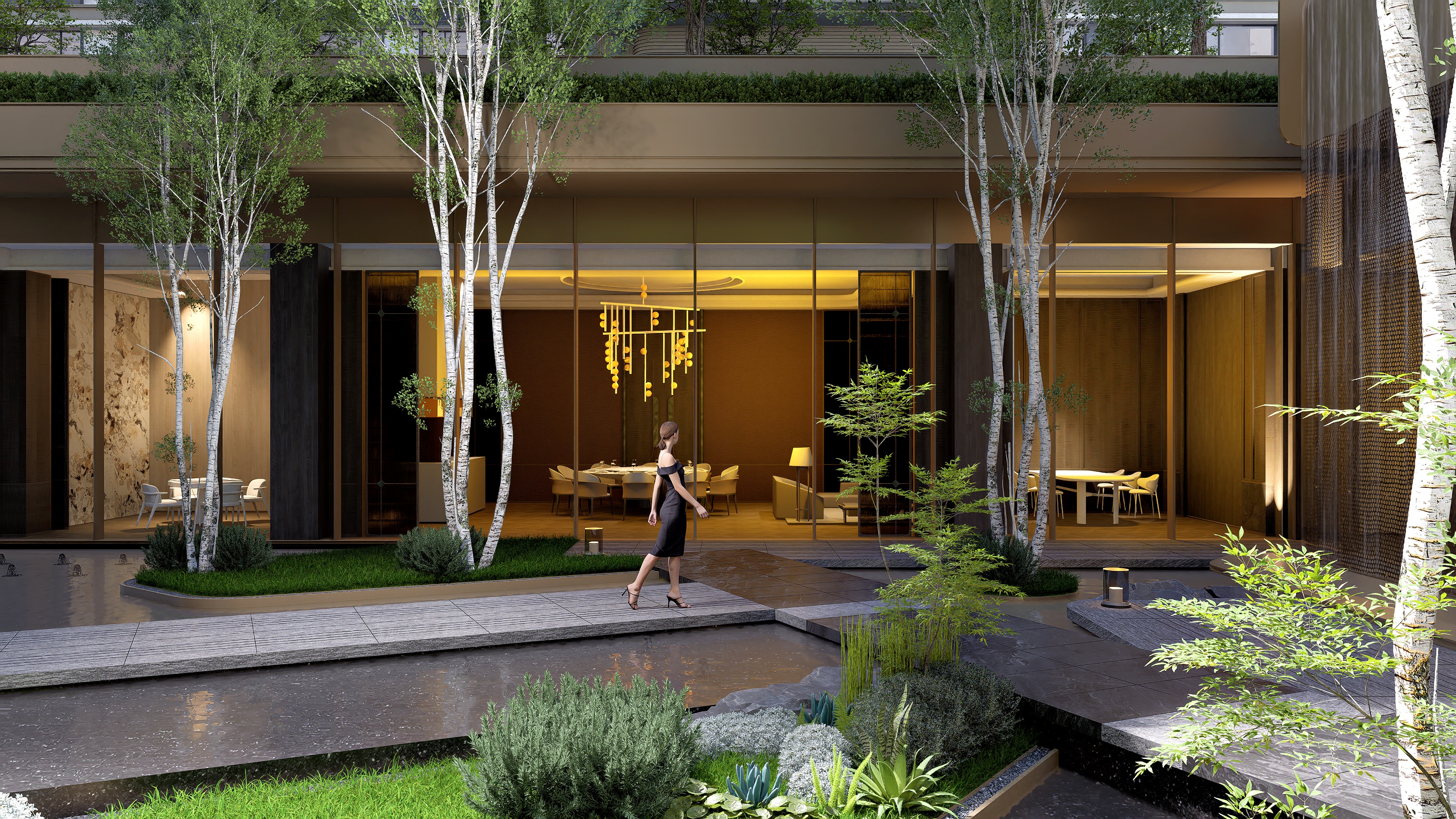 The second courtyard focuses on an exquisite water garden, where the dynamic flow of cascading water curtains echoes the ripples on the water surface. The reflection of light and shadow reveals an elegant style, forming a rigid-soft complementary landscape rhythm with the first courtyard.