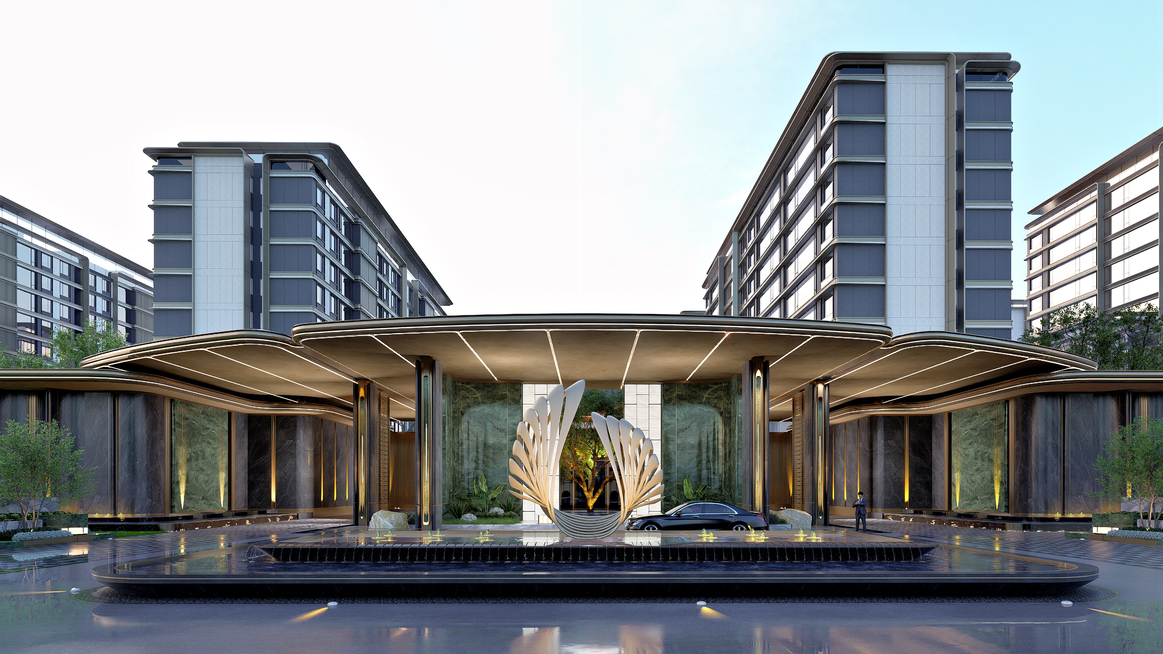 The entrance sequence follows the rhythm of "expansive - restrained - elevated": the landscape walls on both sides extract the rippling texture of the Han River, interpreting a sense of flow through modern lines, with calm dark stone setting the tone; the middle landscape wall combines green luxury stone with translucent jade, its curved top echoing crape myrtle petals, and the gradient starry ceiling creating a serene atmosphere. A tree courtyard is embedded in the middle of the main gate, forming a semi-enclosed urban light hall that allows greenery and natural light to penetrate, balancing the building's boundary with urban publicness.