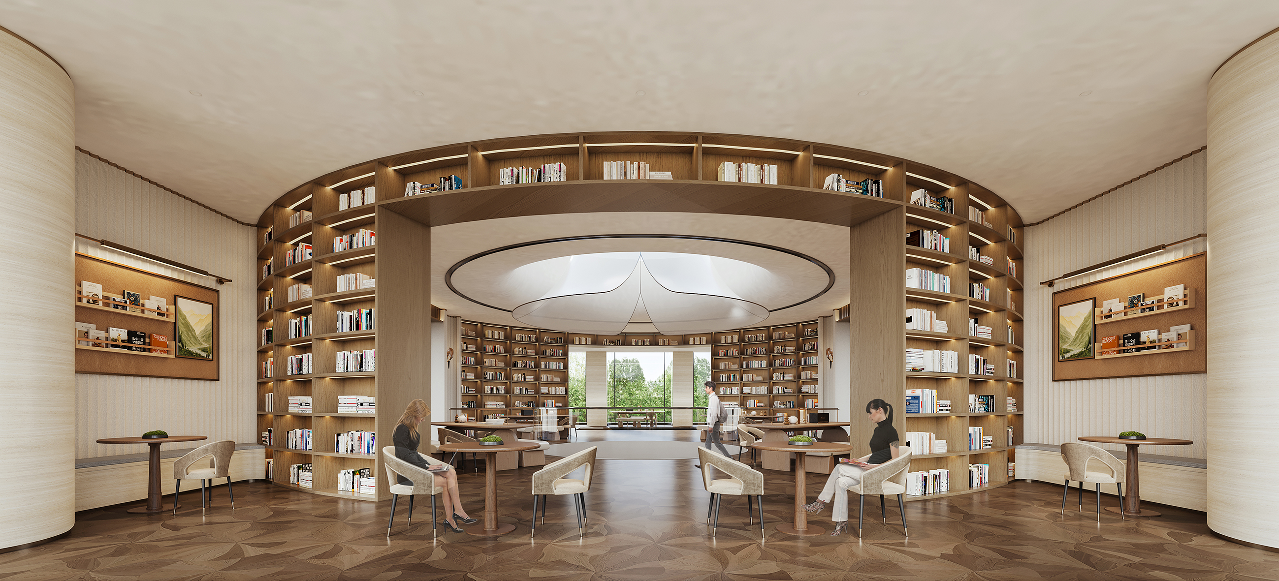 The reading space is located at the core of the two courtyards, achieving unobstructed two-way landscape penetration, allowing users to enjoy the natural scenery of both courtyards while reading quietly.