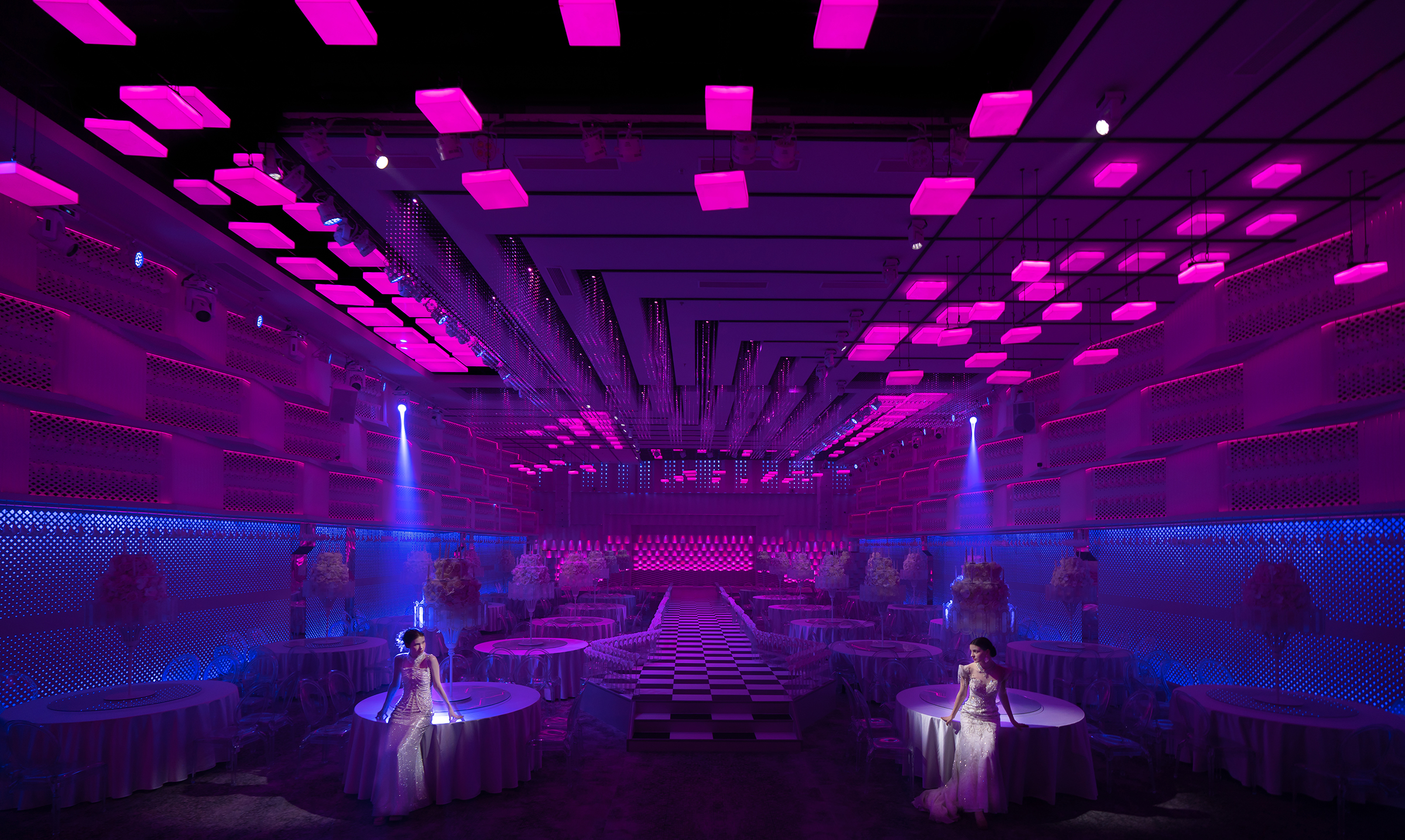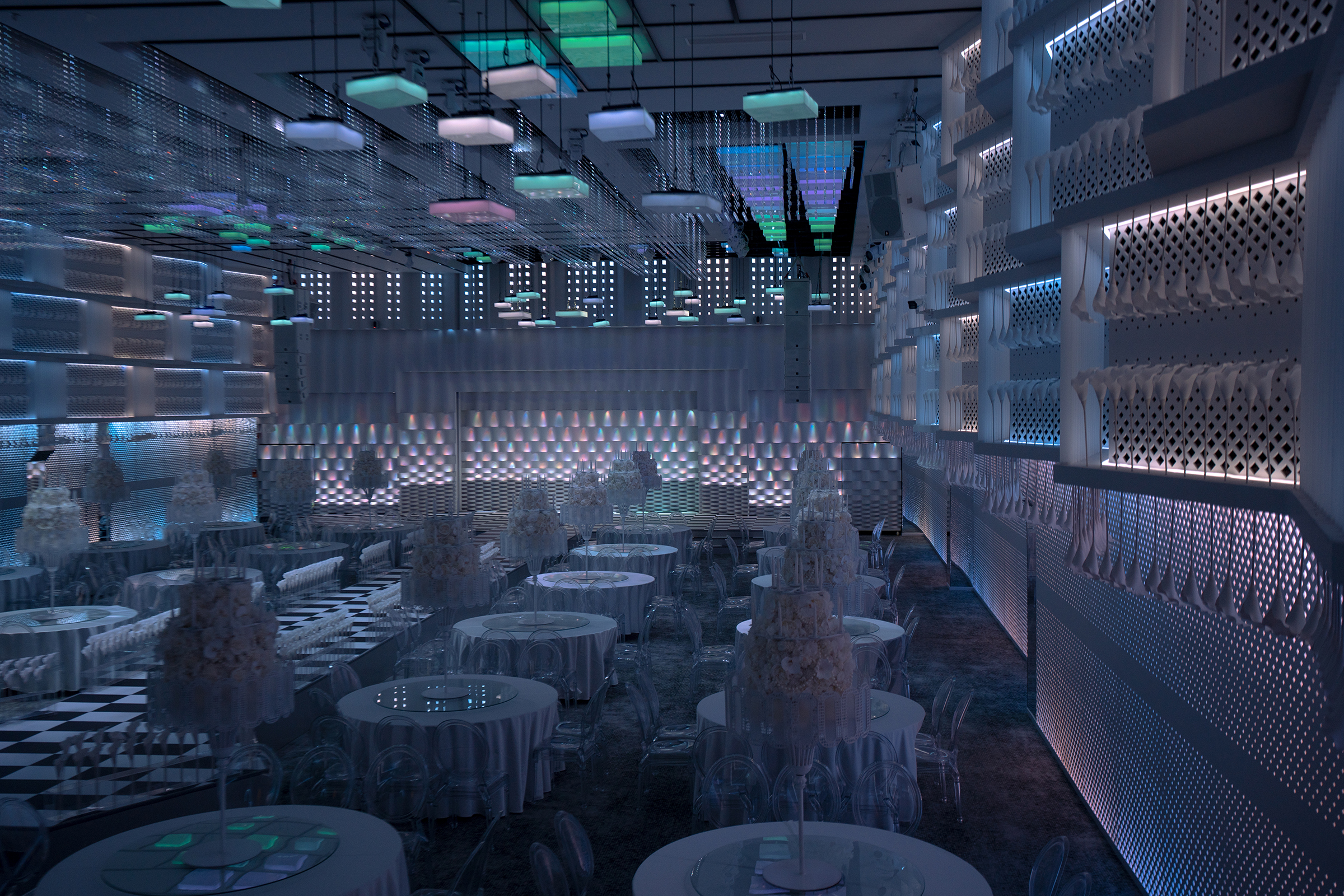 Light plays the role of an invisible strategist. Intelligent dot-matrix illumination highlights specific “squares,” while hundreds of suspended panels shift, float, or reconfigure through digital control. As the banquet evolves from reception to celebration, light manipulates spatial rhythm, continually adjusting openness, hierarchy, and intimacy. The interplay of brightness and shadow constructs a perpetual game of illusion and reality.