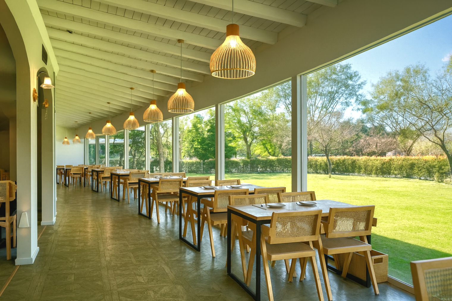The row of lake-facing floor-to-ceiling windows forms the visual soul of the space. Through generous openness and intentional restraint, the window frames become canvases, allowing the water, tree shadows, and shifting sky to act as natural ornamentation. Light continuously casts and reflects throughout the day, and after passing through the series of arches, it reveals a palpable sense of time in motion.