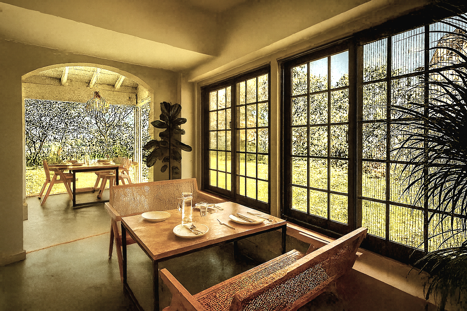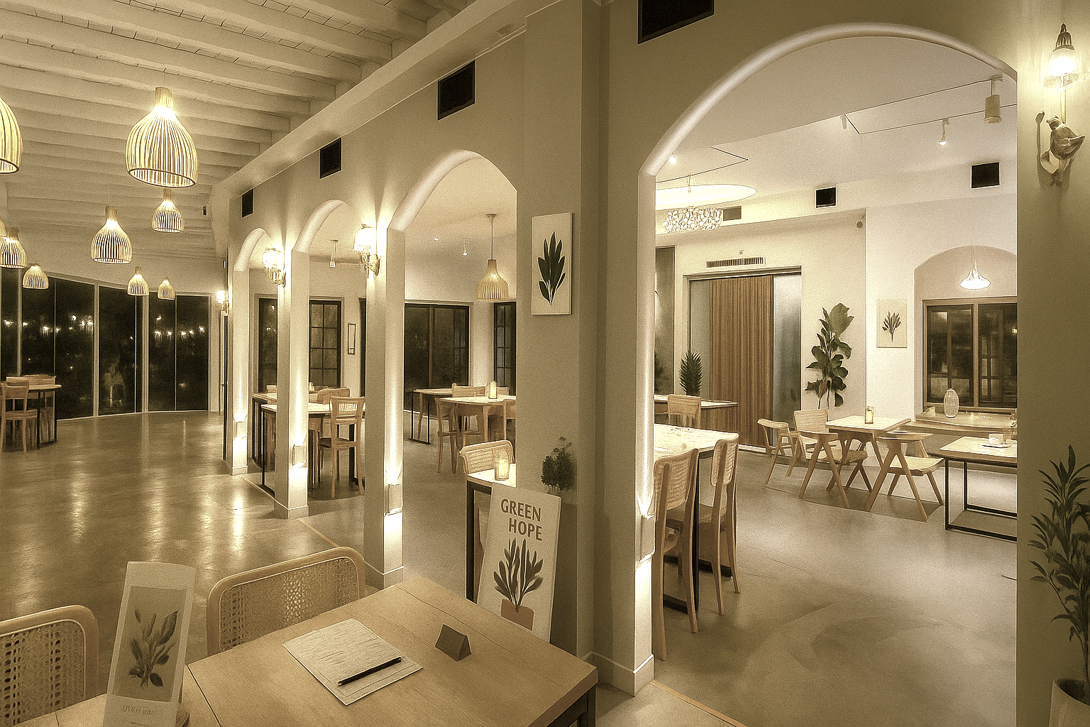 Stepping inside, the existing structural columns are transformed into a sequence of arches, becoming the primary cues that define both zoning and visual direction. The contrast in lighting inside and outside the archway creates distinct spatial layers, from artificial illumination to natural daylight, revealing a main circulation path that gradually leads from the entrance toward the lake view.