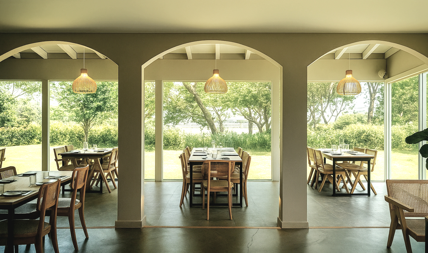 Located beside Longtan Lake in Taoyuan, this Italian restaurant is designed around the concept of “bringing the lakeside indoors and translating the feeling of travel into everyday life.” The space offers a retreat-like ambiance, allowing guests to momentarily escape their routines and immerse themselves in a foreign atmosphere. Expansive floor-to-ceiling windows, an outdoor courtyard, and low hedges define an open yet tranquil environment, evoking the freedom and openness of a vineyard estate abroad.