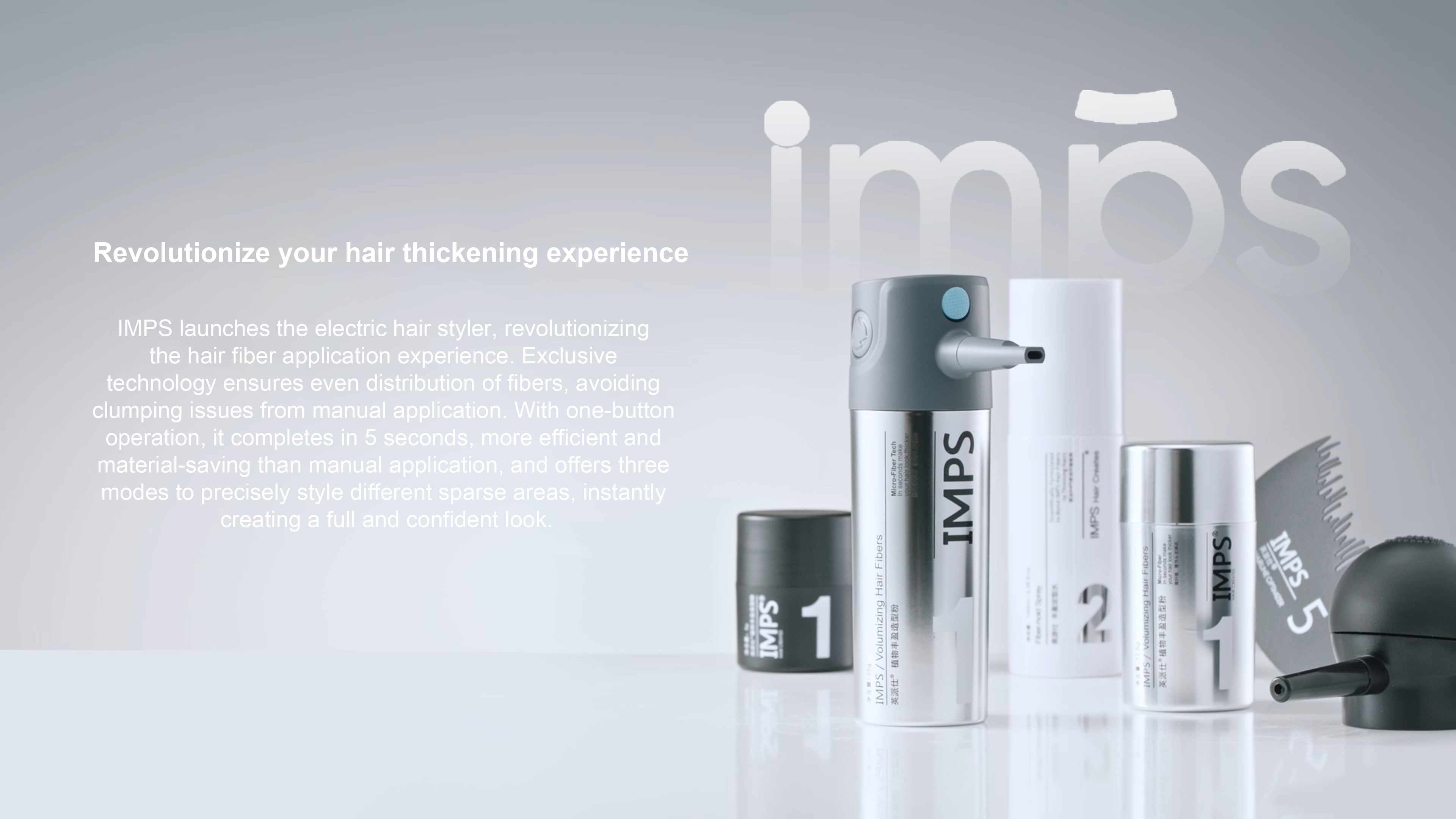 IMPS Steadyflow™ Fiber -Optimized Electric Applicator is a hair fiber spraying device specially designed for individuals with thinning hair, aiming to provide a non-invasive and rapidly applicable solution for visually improving the scalp.