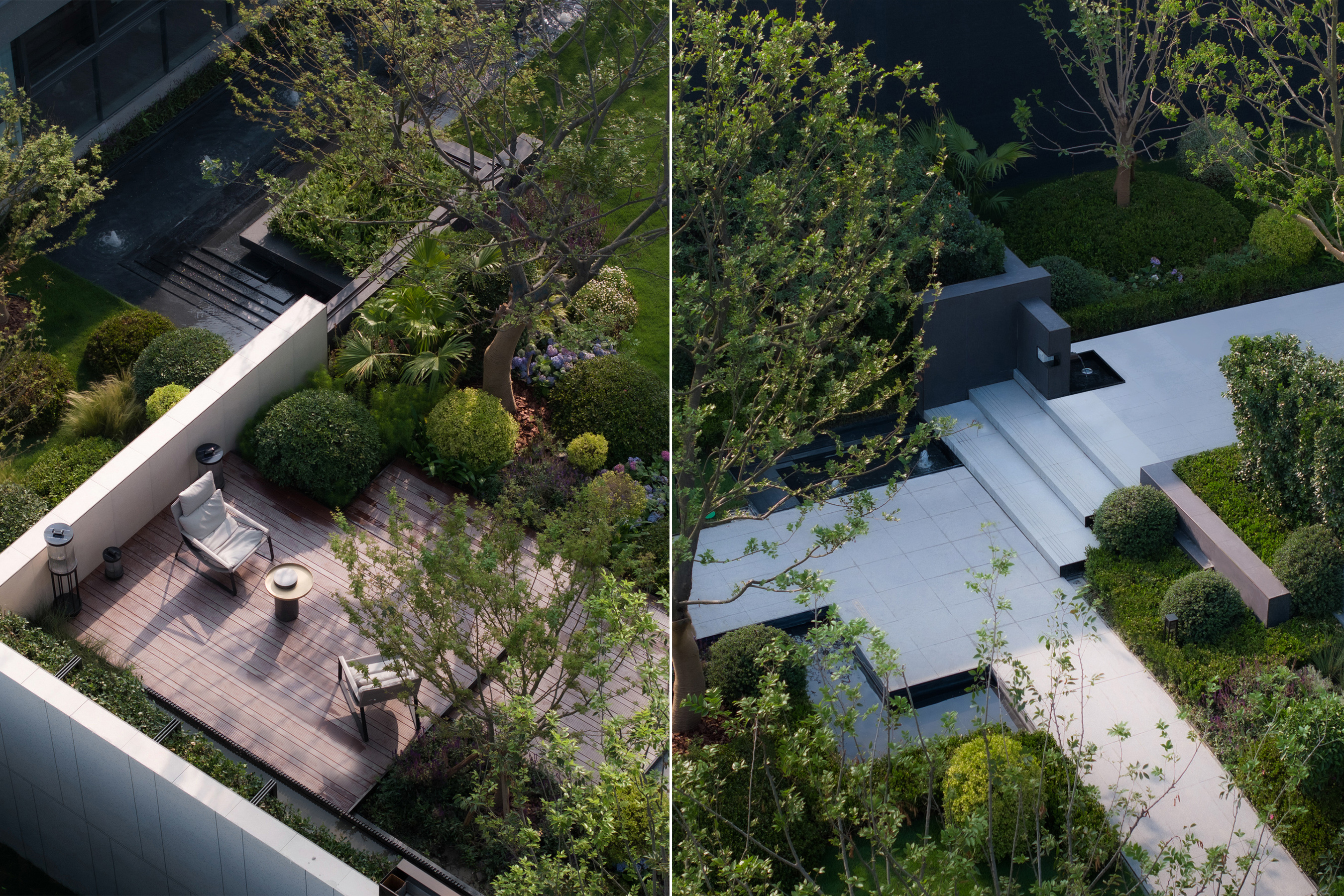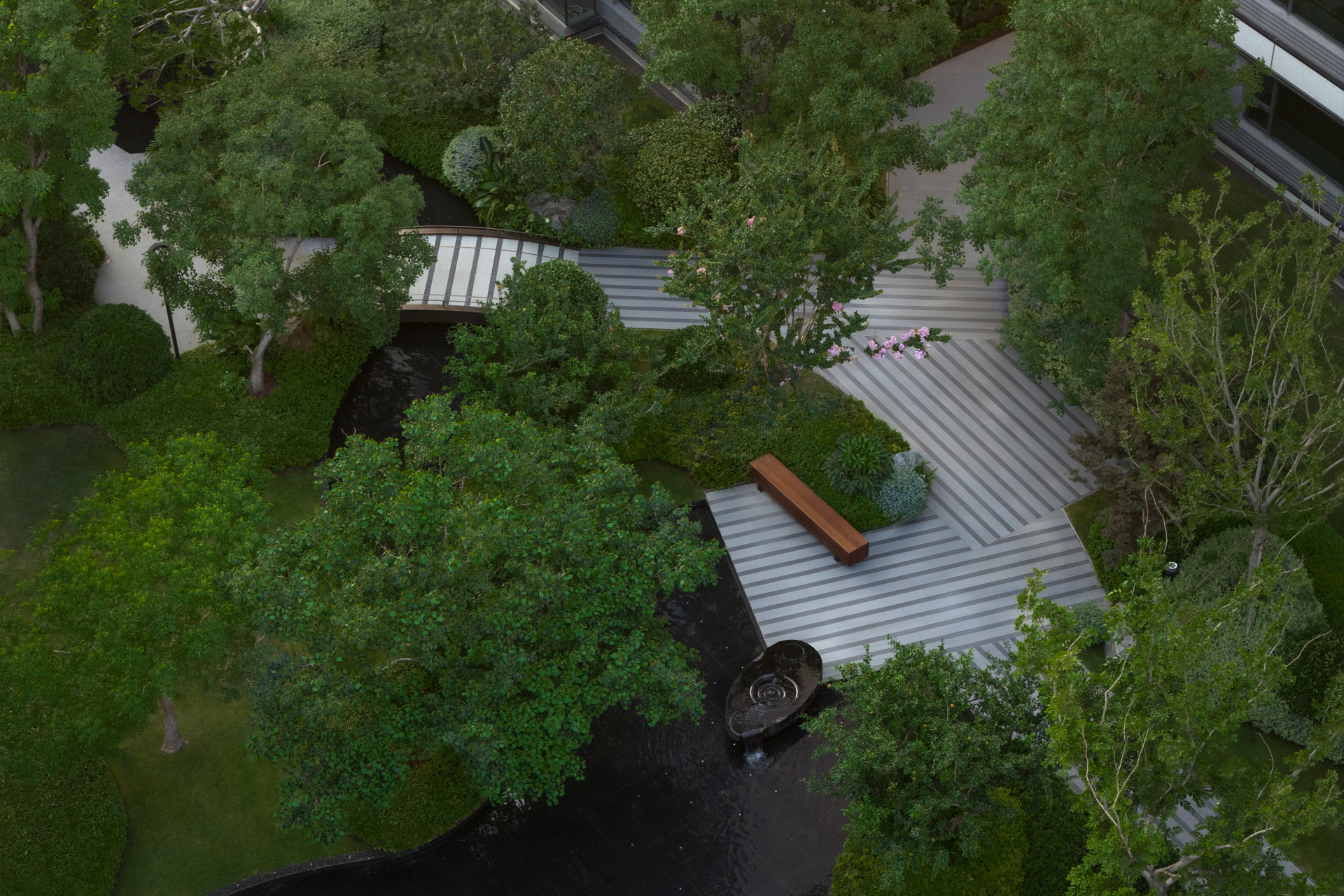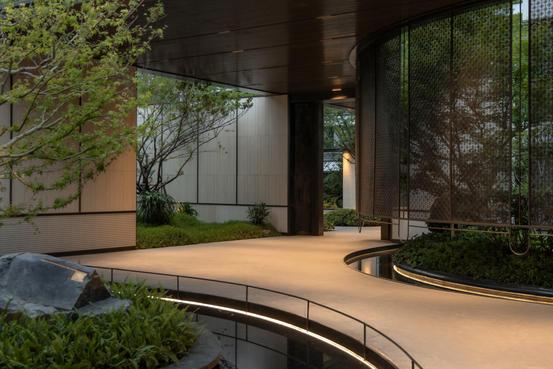 Centered on “strolling within a painting,” the plan integrates mist, mountains, water, stone, flora, and architecture along the homecoming route. Ode to the Clouded Peak-A glazed courtyard evokes lofty mountains and flowing streams, framed by seasonal color; Cloud and Moon Painted Screen-Three ceremonial gates establish a hotel-style arrival sequence; Indigo Clouds at Dawn Window-Recreates an Eastern luxury hotel’s forested atmosphere and classic garden vistas. Wandering Through Emerald Shadows-An 88-meter wooded “Cloud River” axis invites leisurely exploration; Ode to the Wind Stone Courtyard-A Zen-inspired “Cloud River” setting for slow, multifunctional living; Crabapple Blossom Ravine-Draws from the Humble Administrator’s Garden’s classic courtyard conception; Valley Dwelling Playground-A sheltered, forested play space for children; Spring Stone Melody-Evokes a mountain spring’s natural symphony. The overall composition is grand yet intricate, with layers of depth, narrow lanes, and sunken areas. Through poetic scene-setting, it harmonizes classical garden conception with contemporary living.
