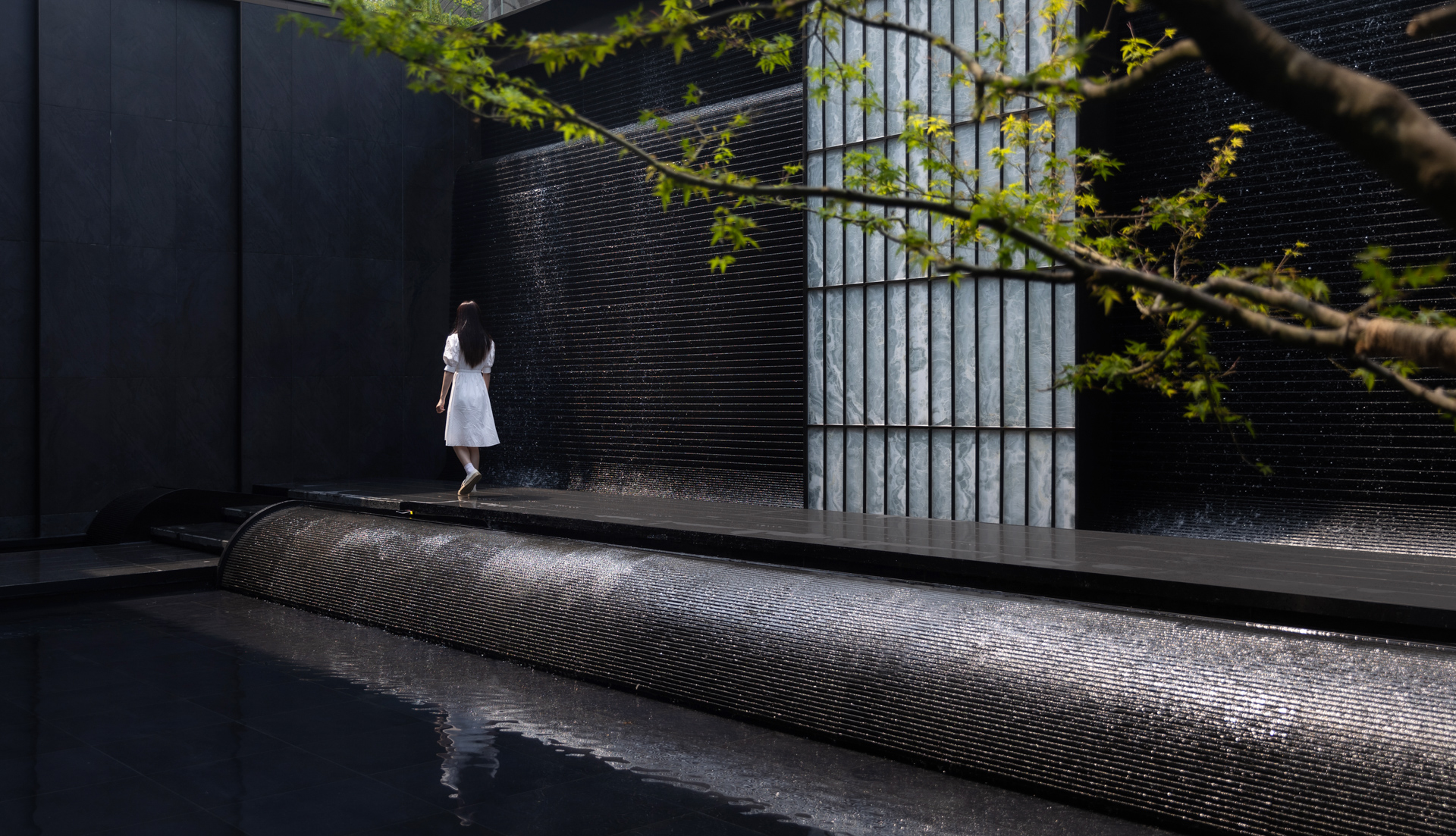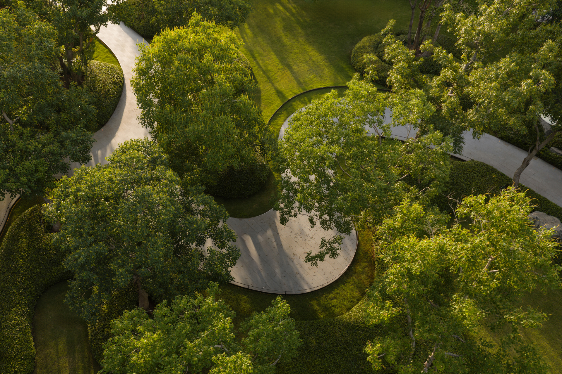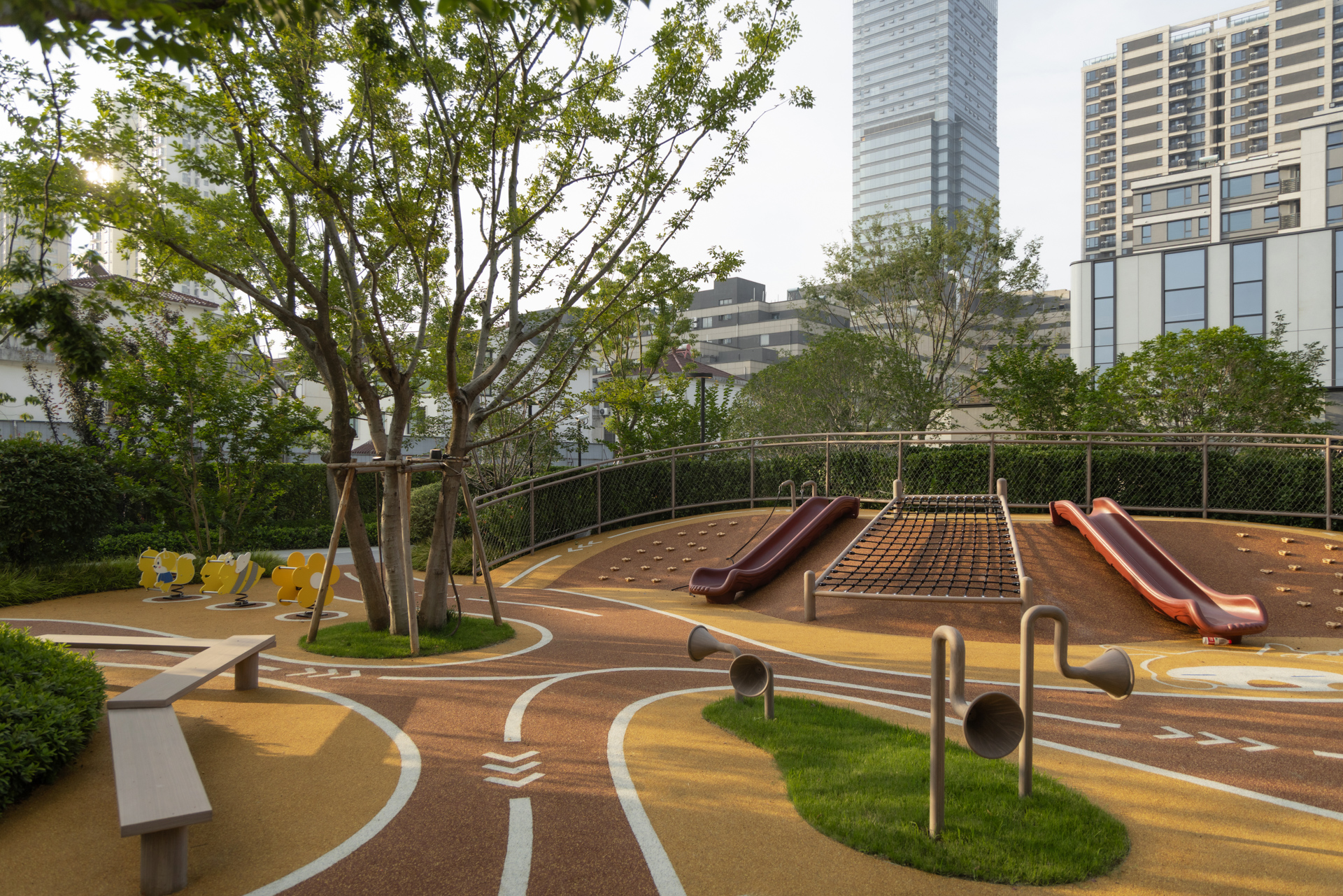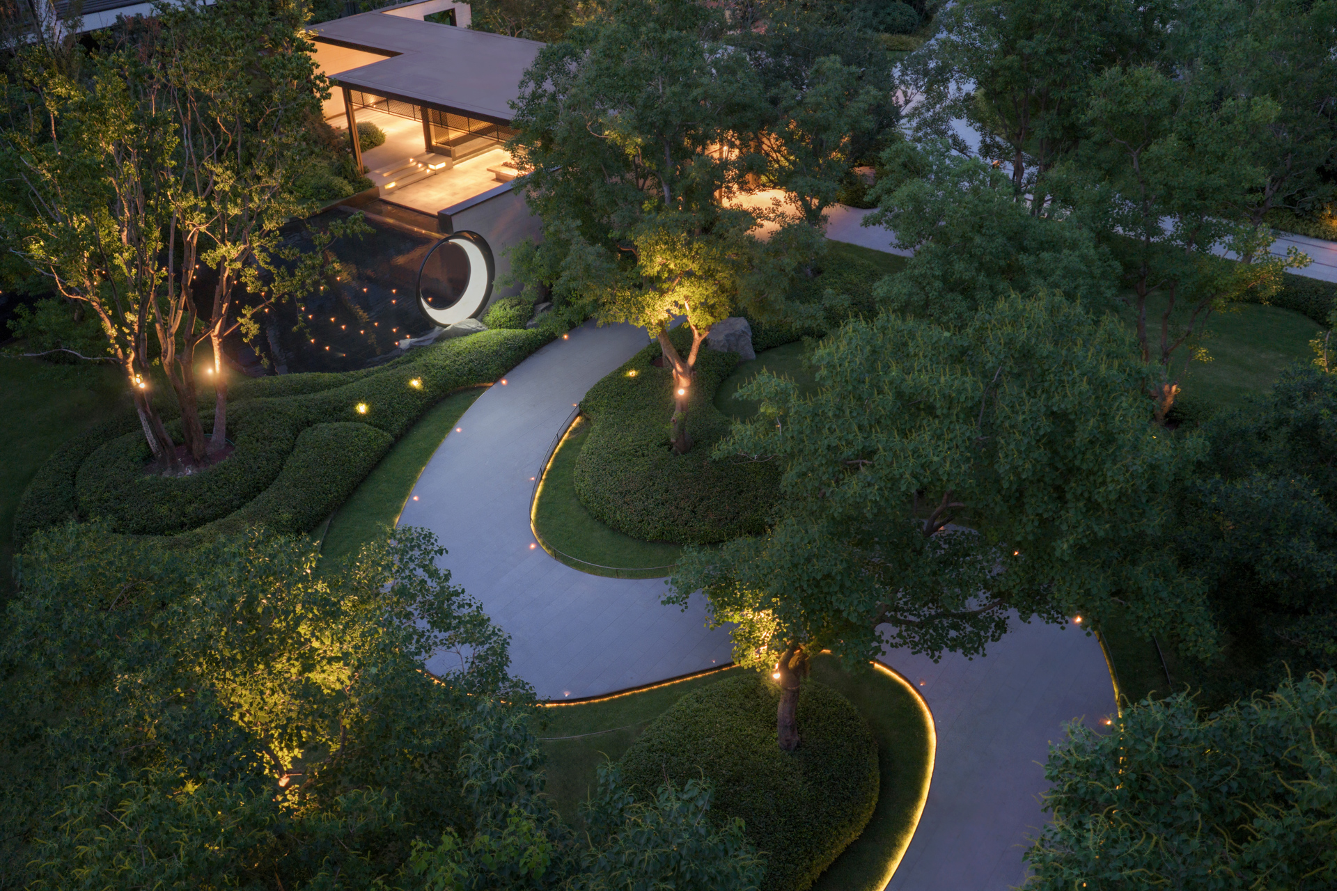 Centered on “strolling within a painting,” the plan integrates mist, mountains, water, stone, flora, and architecture along the homecoming route. Ode to the Clouded Peak-A glazed courtyard evokes lofty mountains and flowing streams, framed by seasonal color; Cloud and Moon Painted Screen-Three ceremonial gates establish a hotel-style arrival sequence; Indigo Clouds at Dawn Window-Recreates an Eastern luxury hotel’s forested atmosphere and classic garden vistas. Wandering Through Emerald Shadows-An 88-meter wooded “Cloud River” axis invites leisurely exploration; Ode to the Wind Stone Courtyard-A Zen-inspired “Cloud River” setting for slow, multifunctional living; Crabapple Blossom Ravine-Draws from the Humble Administrator’s Garden’s classic courtyard conception; Valley Dwelling Playground-A sheltered, forested play space for children; Spring Stone Melody-Evokes a mountain spring’s natural symphony. The overall composition is grand yet intricate, with layers of depth, narrow lanes, and sunken areas. Through poetic scene-setting, it harmonizes classical garden conception with contemporary living.