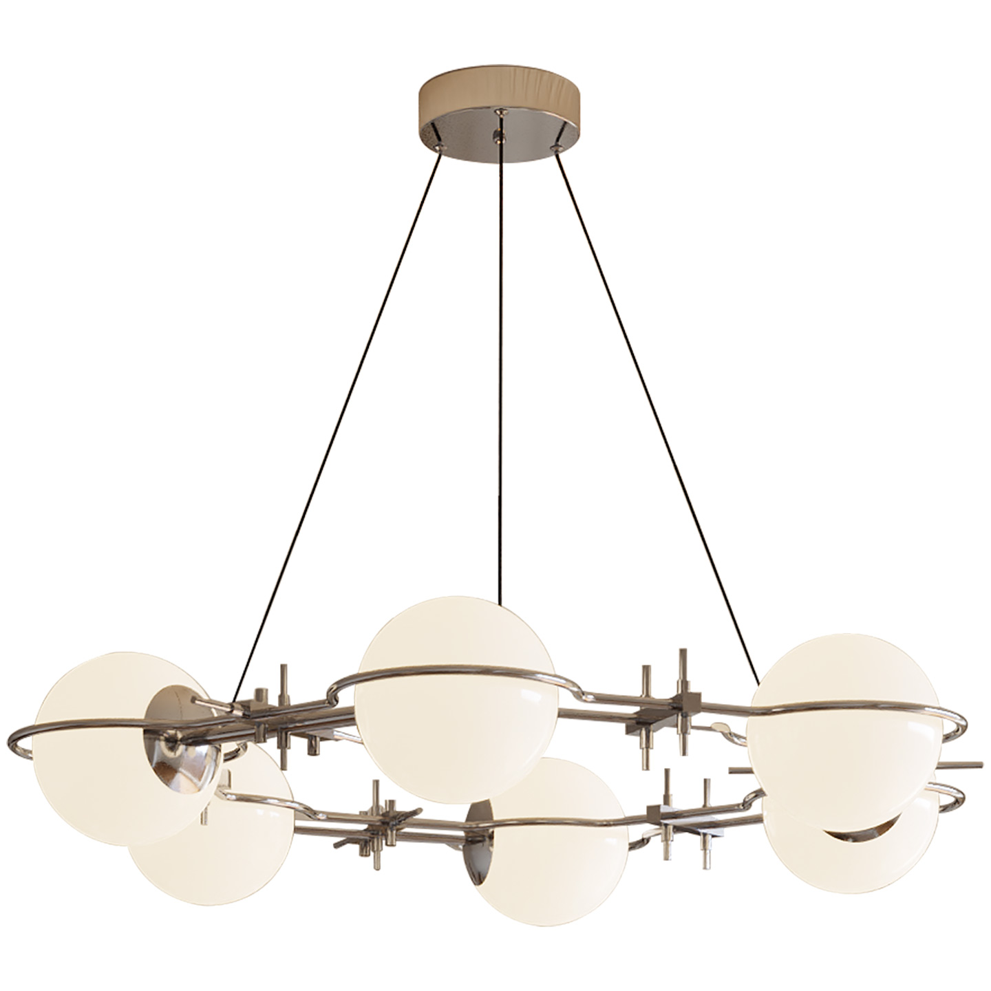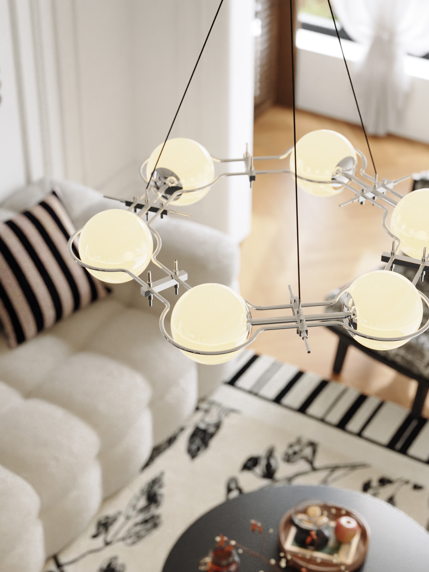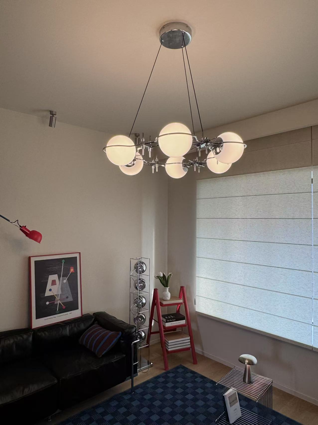 The lamp’s soul is rooted in the deconstruction of industrial aesthetics, “glass × optic axis.” The rigid aviation-grade aluminum, crafted through precision CNC milling and 24 electroplating processes, forms the floating, rational “ring”; each high-transparency glass sphere, blown by skilled artisans, becomes the warm, emotional “star.” When the lamp is turned on, the tough metal ring and the soft luminous glass spheres achieve a delicate balance, blending the boldness of industrial design with the romance of a cosmic star ring, making the lamp a striking visual centerpiece in any room.