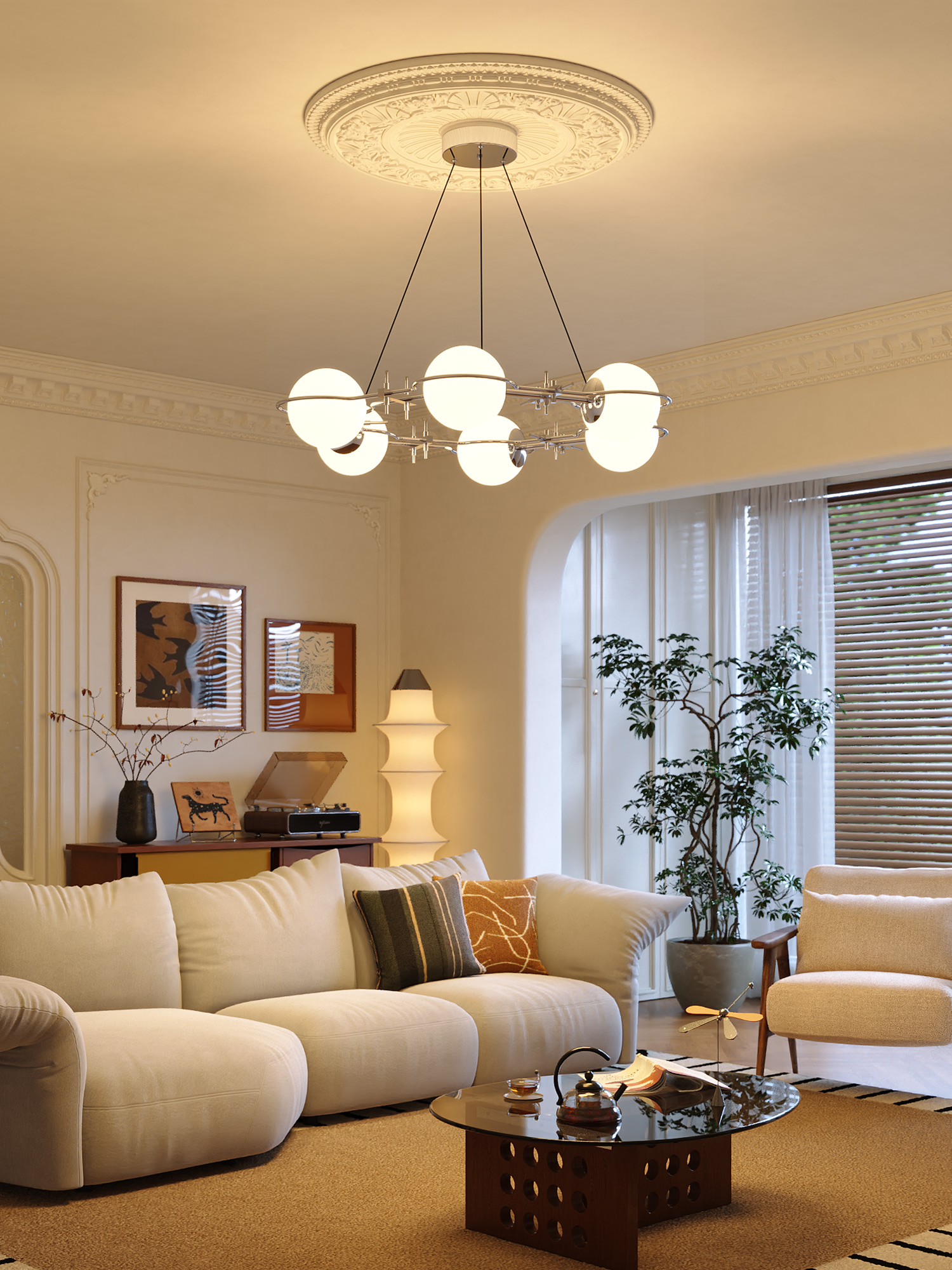 The lamp is designed for long-term use. The 3.0 smart control system allows users to control the light freely while its timeless structural design ensures it remains stylish and adaptable across various living spaces. Whether in a lofty living room or a cozy interior, it can be freely adjusted to reduce the sense of emptiness from the ceiling, becoming the central focal point of the home.