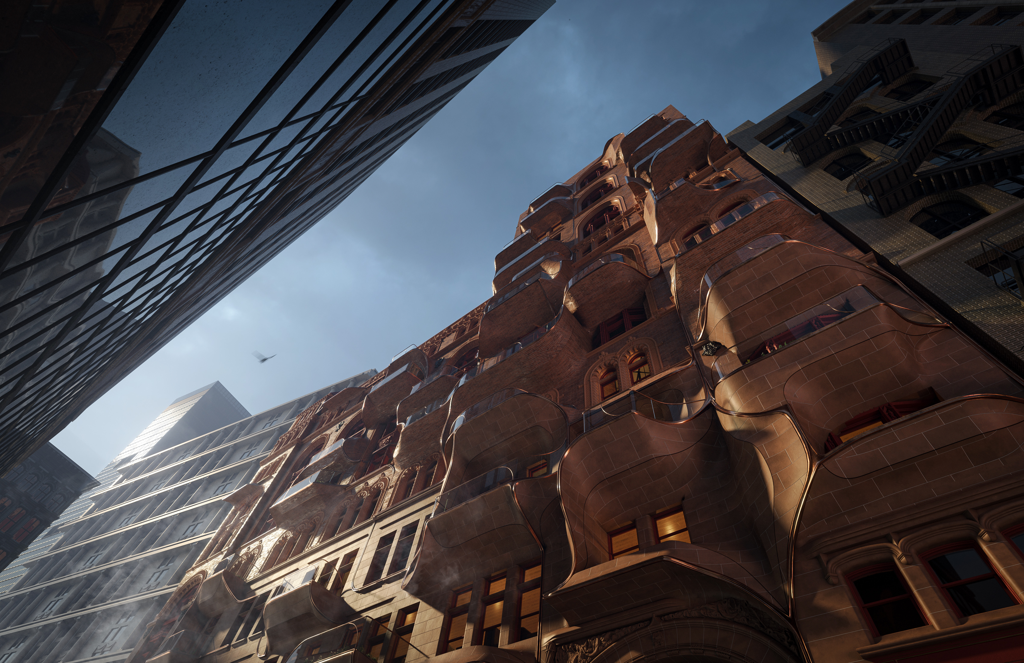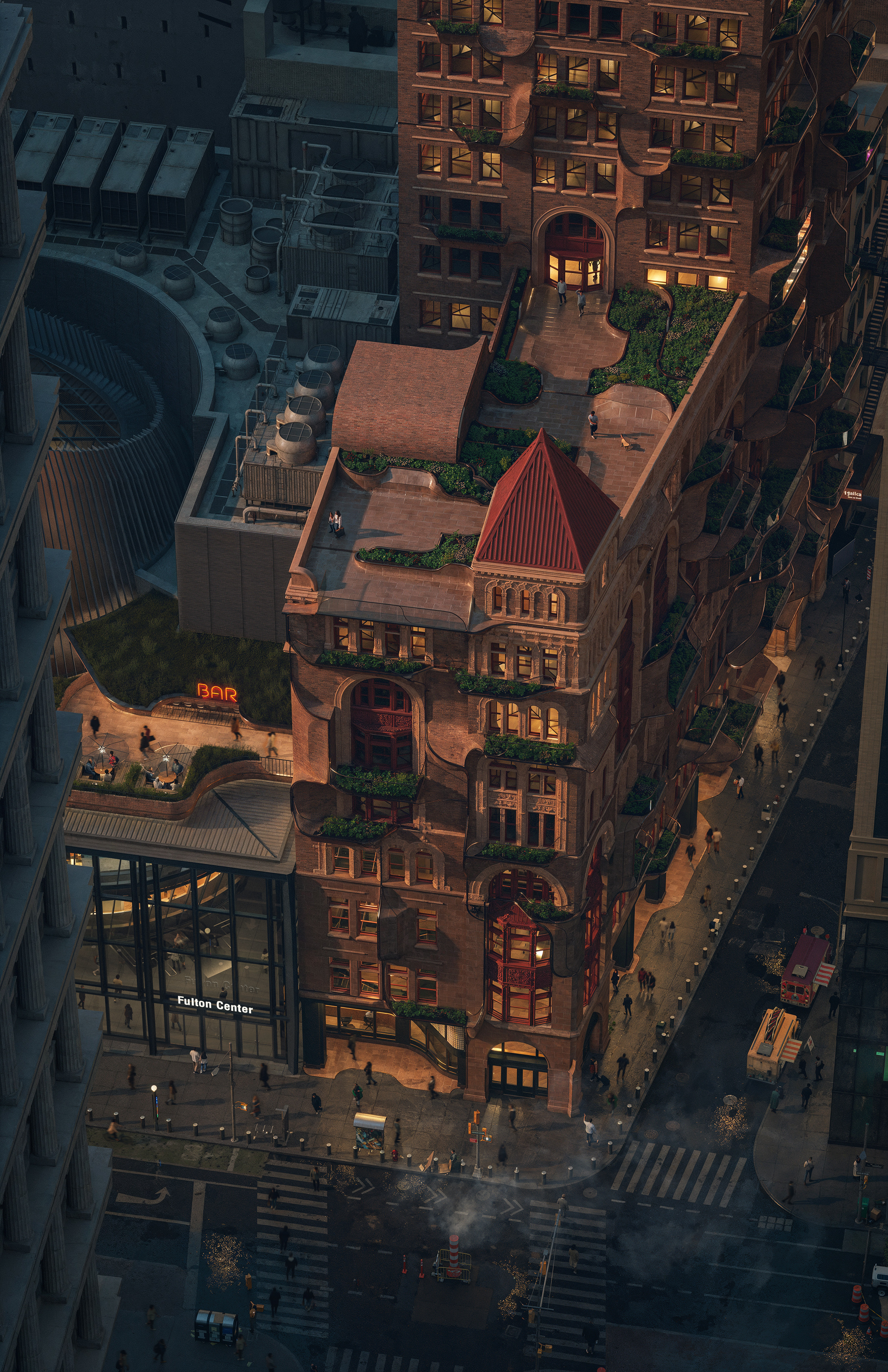 The Dissolving Corbin Building reimagines a historic landmark in Lower Manhattan as a vertical ecosystem where living, eating, and gathering dissolve into one another. Once celebrated primarily for its ornate façade, the Corbin Building is renewed as an architecture of continuity—retaining its historic skin while transforming its interior into layers of shared space. Solid walls dissolve inward to generate communal kitchens, atriums, and gardens, blurring the line between private units and the public city.