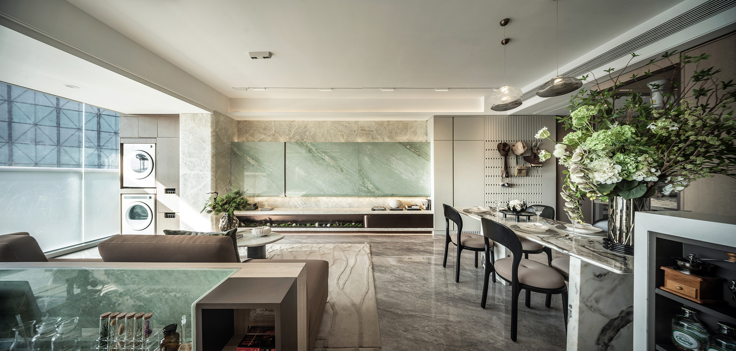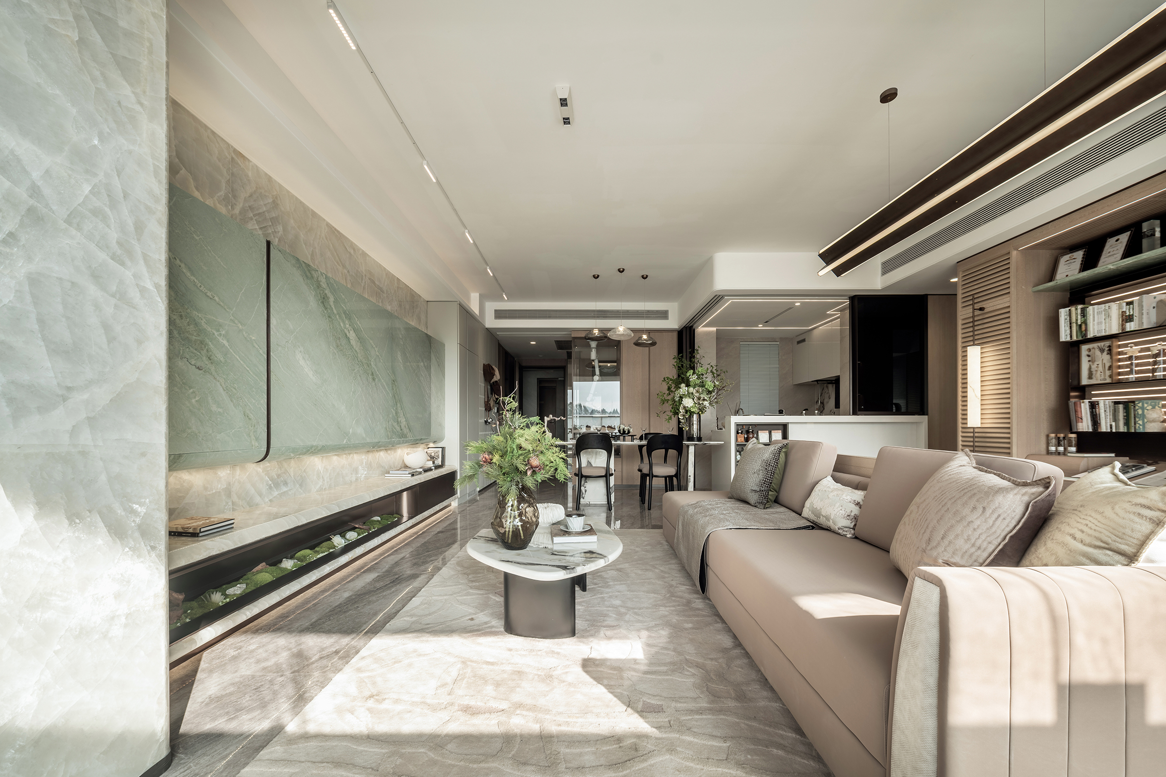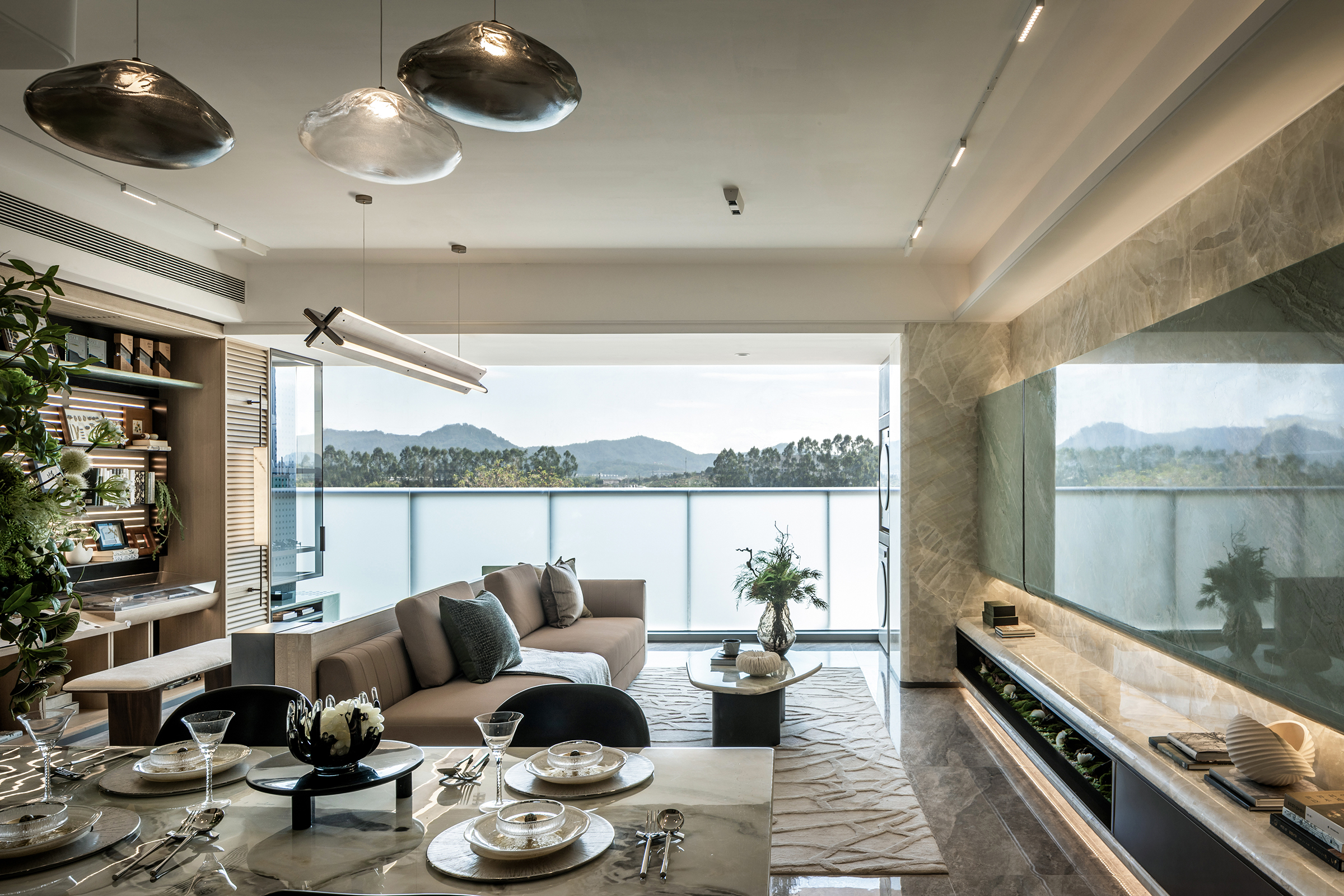 The living area is conceived as an open and inclusive sanctuary. Soft forms evoke cloud-like comfort, welcoming laughter and shared moments, while natural light streaming through the balcony engages in dialogue with interior ecological symbols. Light and shadow drift across marble surfaces, where stone grains resemble mountains and flowing rivers, transforming the living room into a miniature landscape infused with calm and poetic depth. Subtle material contrasts—light-toned cabinetry paired with dark metal accents—create an understated warmth, enriched by traces of daily life that lend the space a human touch.