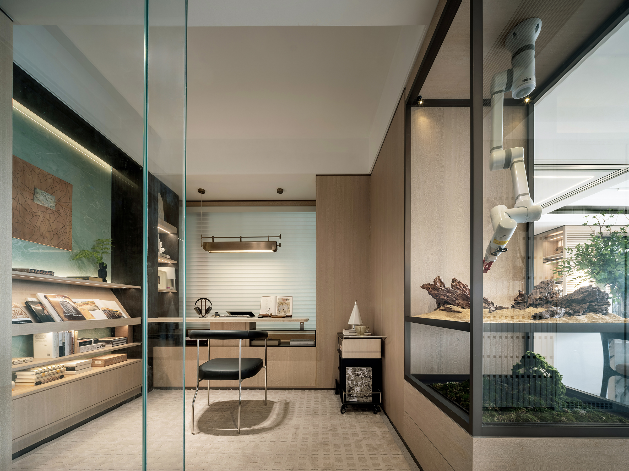 Adjacent spaces extend the theme of exploration. Areas dedicated to ecological observation, scientific curiosity, and creative making encourage hands-on learning and cognitive awakening. Display cabinets function as miniature ecosystems, where moss, gravel, and mechanical elements coexist behind transparent glass, symbolizing the poetic intersection of nature and technology. These installations become both visual anchors and intellectual catalysts within the home.