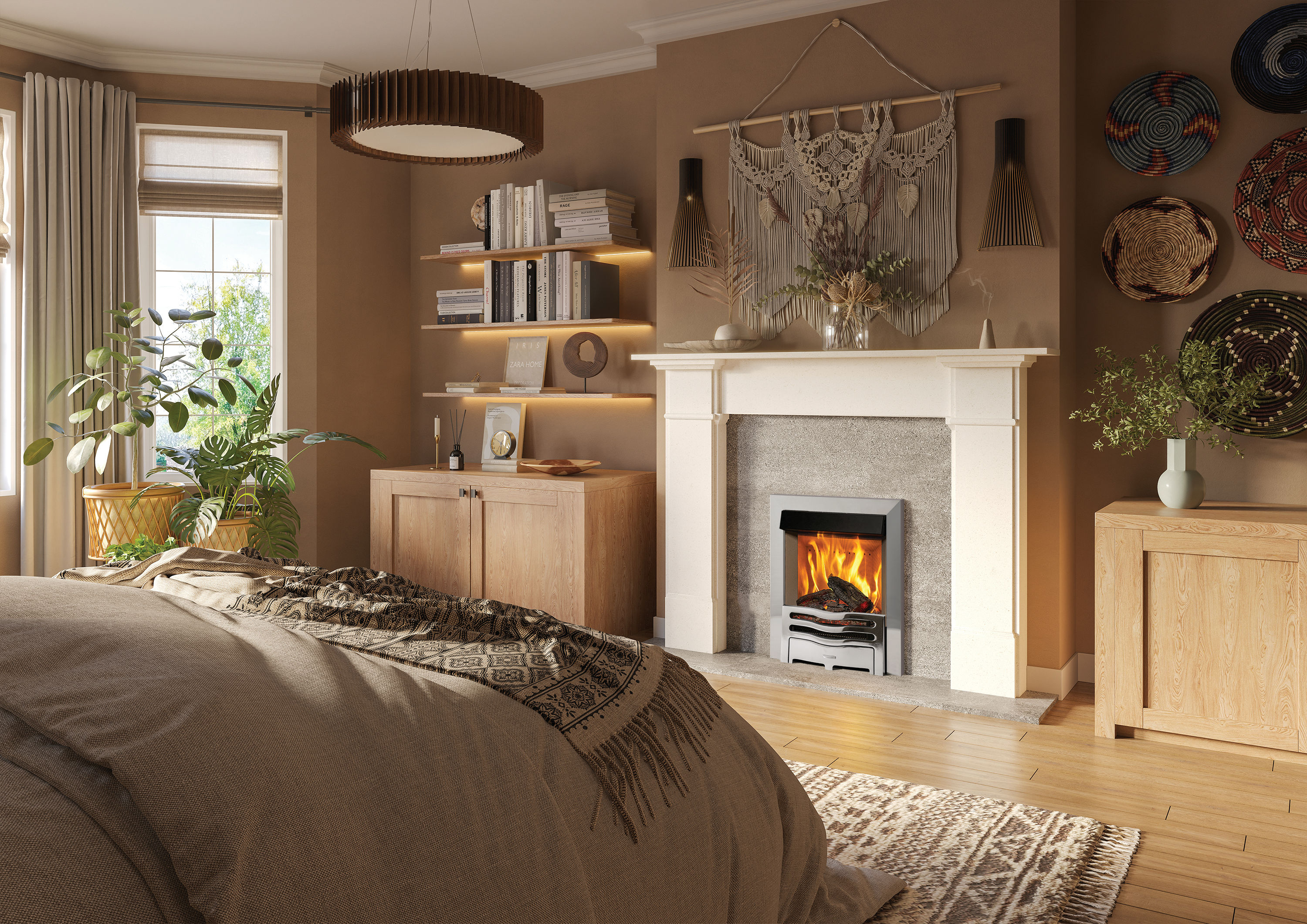 Five flame effects – roaring, medium, lazy, ember glow and the contemporary Aurora setting – allow users to recreate the natural lifecycle of a fire. A host of log and ember bed lighting colours with adjustable brightness and pulsing speeds result in a mesmerising display.