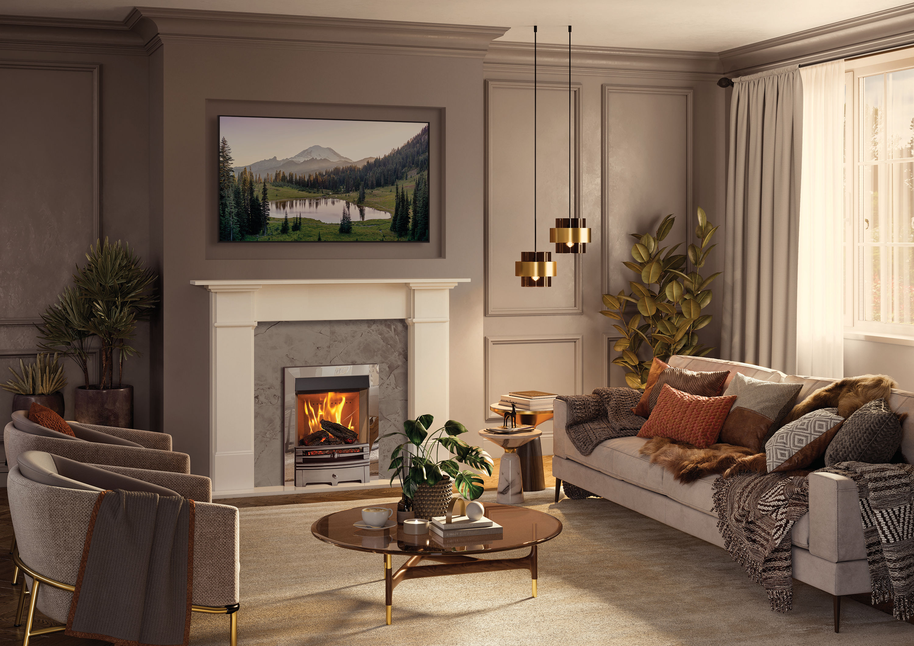 At its heart is our innovative, patented Mirage Virtual Flame System – delivering a breathtaking illusion using real woodburning visuals, including footage of real logs. The exposed, hand-painted, log-effect matches and is precisely modelled on the firewood shown in the flame visuals, enhancing the feeling of depth and natural movement. Glass chippings and vermiculite complete the ember bed, all resulting in an immersive, lifelike firebox.